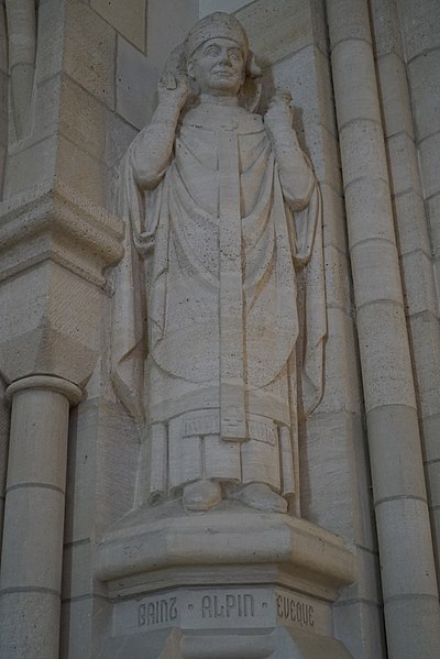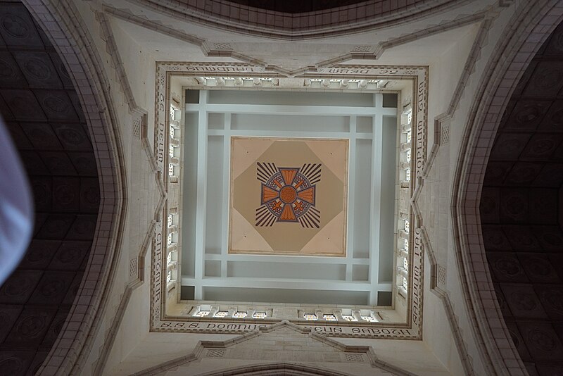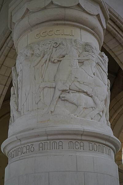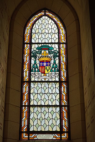 La chapelle supérieure, conçue comme une transition entre le deuil et la joie, s'ouvre sur une verrière monumentale de sept mètres réalisée par Charles Lorin d'après un carton de Louis Piebourg, où sainte Jeanne d'Arc et saint Michel présentent un "poilu" au Christ glorieux. Cette grande verrière, traitée dans un esprit Art déco, porte une inscription latine signifiant "Je garderai tous ceux qui dorment et j'illuminerai tous ceux qui espèrent dans le seigneur", tandis que d'autres vitraux présentent les armoiries des provinces, les saints patrons des armées et les vierges du front ; la coupole est éclairée par trente‑deux fenêtres. Les quatre piliers de la chapelle commémorent la chevauchée vers Reims, la bataille de Poitiers (732), les deux batailles de la Marne et la bataille des champs catalauniques. La statuaire, œuvre de Firmin Michelet, rassemble des saints locaux et nationaux ainsi que des figures de la Grande Guerre, dont le maréchal Foch figuré sous les traits de Jean de Montmirail et saint Remi sous ceux du cardinal Luçon. L'intérieur comporte également un narthex vitré, la croisée du transept ornée de la Croix de guerre et un musée.
