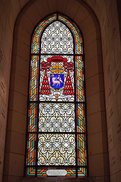 La façade, dédiée au Christ‑Roi et surmontée de saint Michel terrassant le dragon, ouvre directement sur la crypte et la chapelle supérieure, deux espaces dont l'opposition symbolique est soigneusement traitée. La crypte, à demi enterrée, privilégie le recueillement : sarcophage, pierres gravées au nom des morts et une grille en fer forgé réalisée par Raymond Subes contribuent à son atmosphère funèbre. Pourtant la crypte annonce déjà la chapelle supérieure par des figures d'espérance : à droite de l'autel les anges du Te Deum, à gauche le groupe portant le De Profundis. Deux vitraux commémorent également les deux prélats du comité fondateur.