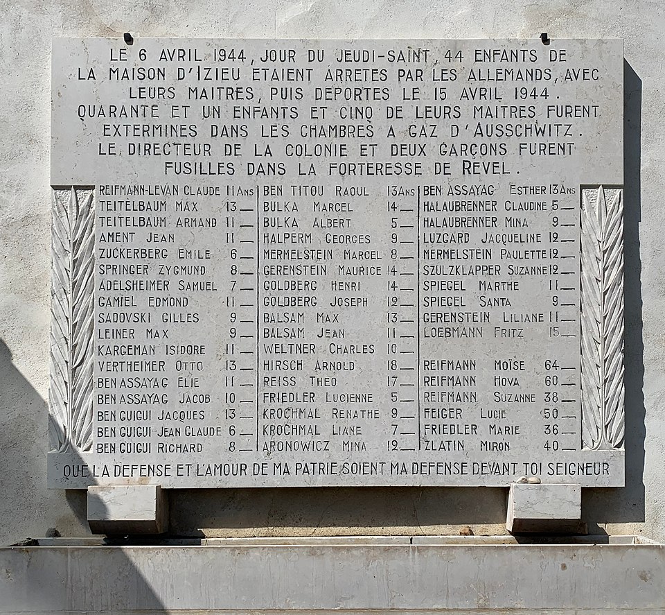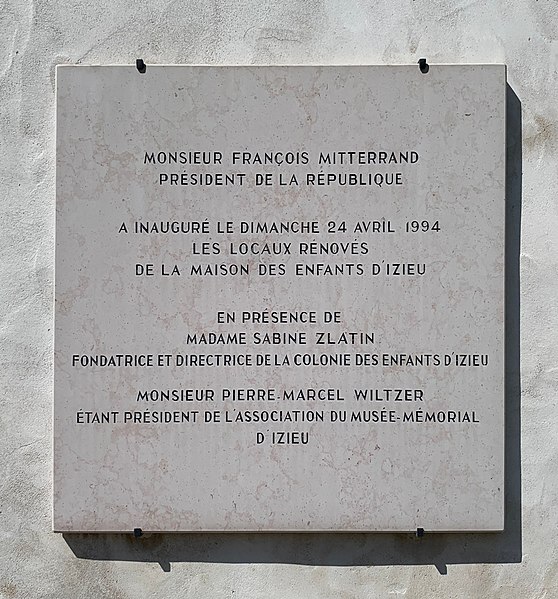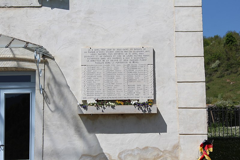La maison d'Izieu fut utilisée à partir de 1943 comme colonie, dite "Colonie d'enfants réfugiés de l'Hérault", dirigée par Sabine Zlatin, infirmière à la Croix-Rouge, et son mari Miron Zlatin, ingénieur-agronome. Le 6 avril 1944, sur ordre de Klaus Barbie, la Gestapo y fit irruption : 42 enfants et cinq de leurs maîtres furent exterminés dans les chambres à gaz d'Auschwitz, deux adolescents et le directeur furent fusillés en Estonie, et une seule personne survécut. Après le procès de Klaus Barbie en 1987, Sabine Zlatin et le préfet Pierre-Marcel Wiltzer créèrent l'association du Musée‑mémorial d'Izieu pour acquérir la maison et en faire un lieu de mémoire. Par décret présidentiel du 3 février 1993, la maison reçut la reconnaissance de lieu de mémoire nationale, puis François Mitterrand inaugura le mémorial le 24 avril 1994. Transformée en musée‑mémorial en 1994, elle propose aujourd'hui une exposition permanente, un centre de documentation et d'archives, des expositions temporaires, des visites guidées et des ateliers pour les jeunes. Le site commémore les enfants et les adultes juifs qui y avaient trouvé refuge et œuvre à la transmission du souvenir des persécutions antisémites et du génocide.