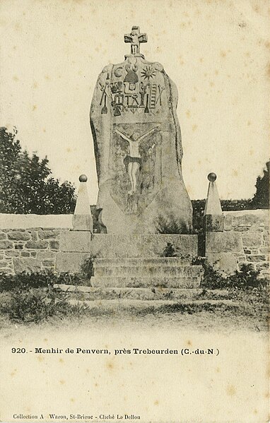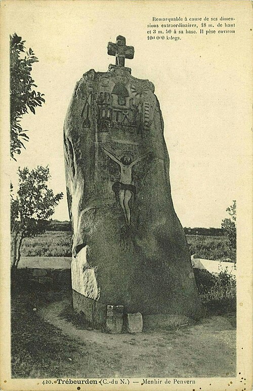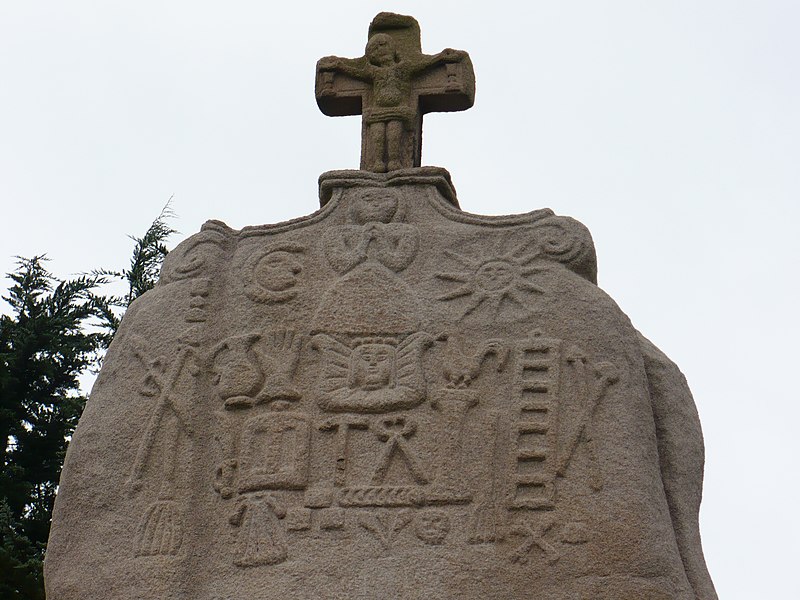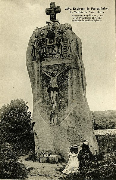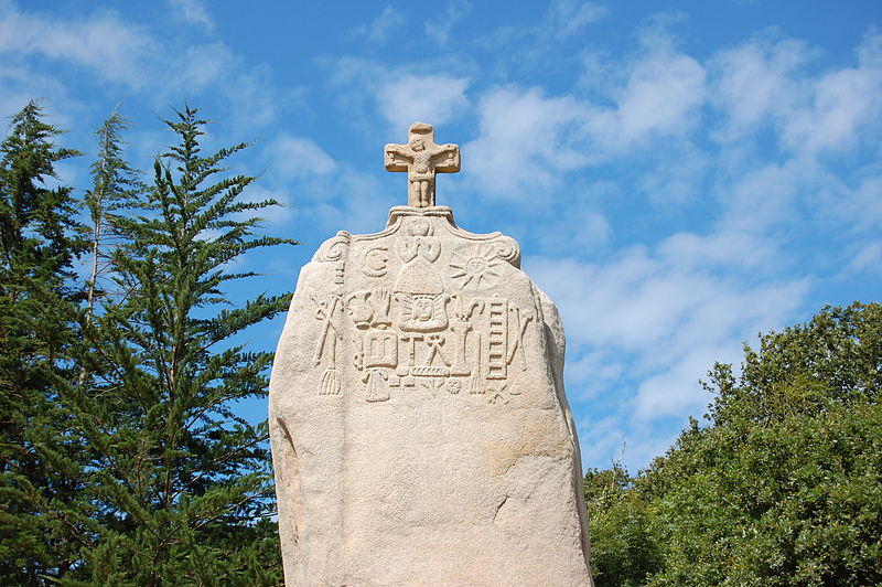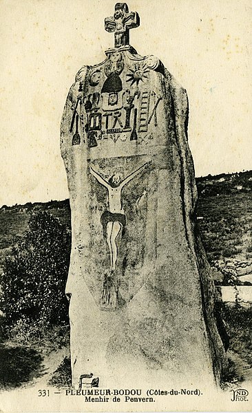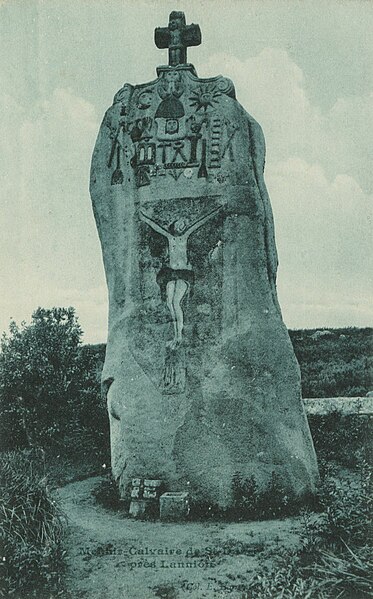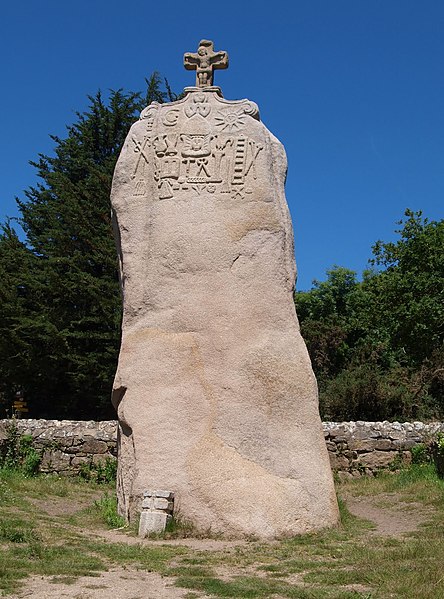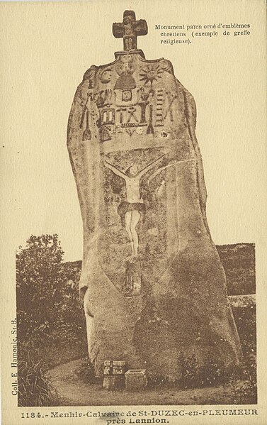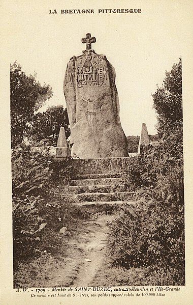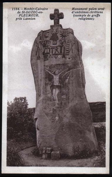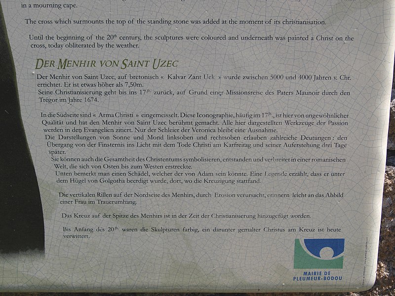 Le menhir, appelé Saint-Uzec en breton (Kalvar Sant-Uzeg), se trouve sur la commune de Pleumeur-Bodou, près de la chapelle Saint-Uzec en direction de l'Île-Grande, dans les Côtes-d'Armor. Il s'agit d'un bloc de granite de l'Île Canton pesant 80 tonnes, d'une longueur totale de 7,40 m, dont un tiers est enterré, et d'une largeur de 2,6 m. La face sud mesure 5,90 m et la face est 5,70 m ; la face sud est légèrement concave et les arêtes de la face est sont émoussées. La face nord porte de profondes rigoles d'érosion et des cuvettes d'altération, qui témoignent de la position originelle du bloc puis de son redressement : deux cuvettes prémégalithiques indiquent que la pierre était couchée et que cette face était alors vers le haut, et neuf rigoles postmégalithiques ont été creusées par l'écoulement des eaux de pluie depuis son dressage. Le menhir a été christianisé en 1674 lors d'une mission conduite par le père jésuite Julien Maunoir, qui l'a intégré à un placître accessible par un échalier, l'a fait peindre et sculpter, et l'a surmonté d'une croix. Cette christianisation des pierres dressées illustre la volonté de l'Église d'assimiler les pratiques païennes dans un syncrétisme religieux. L'appellation erronée « Saint-Duzec » trouve son origine dans une liaison bretonne entre Zant (saint) et Uek/Uzek, qui a donné en français Saint Josse et conduit à la confusion de toponymes. Le menhir est classé au titre des monuments historiques depuis 1889 sous le nom de « Menhir de Saint-Duzec ». Le décor était polychrome, comme l'attestent des cartes postales du début du XXe siècle et une planche en couleur de 1897, mais ces peintures sont aujourd'hui effacées. En 2005, sous l'égide des Bâtiments de France, la commune de Pleumeur-Bodou, propriétaire du monument, a mené une campagne de restauration qui a permis d'éradiquer les lichens noirs masquant les figures sculptées. Une croix en granite de l'Île Canton est fixée au sommet du menhir dans une cavité de 10 cm de profondeur à l'avant, maintenue par deux cales visibles, rouillées, et sans doute par d'autres éléments invisibles ; sa section est rectangulaire et elle mesure 97 cm de haut sur 70 cm de large. Le Christ, sculpté en demi-relief dans la masse, adopte l'iconographie du Christus patiens : la tête penche légèrement à droite, le sternum est creusé, les yeux sont fermés et un périzonium entoure le haut des cuisses ; deux calices recueillent le sang s'écoulant sous chaque main. Sous la croix, un fronton orné d'un double bourrelet part en accolade des pieds du Christ et se termine par deux volutes opposées ; il encadre un ensemble de vingt-sept sculptures en bas-relief, disposées dans un rectangle de 1,90 m de large sur 1,80 m de haut et rappelant le déroulement de la Passion, sans ordre strictement rigoureux. Le registre supérieur présente, de gauche à droite, le calice de Gethsémani, un croissant de lune entourant une figure de profil tournée vers une figure féminine, une femme agenouillée aux mains jointes, et un soleil portant en son centre une figure humaine ronde. Le soleil et la lune, symboles païens, ont été interprétés par les chrétiens comme évoquant les ténèbres du Vendredi saint et la Résurrection. La figure féminine peut être rapprochée d'une sculpture païenne, peut-être une déesse-mère celtique, mais elle peut aussi représenter la Vierge Marie, sa sculpture semblant porter une auréole, surtout si on l'associe au groupe situé en dessous qui représente des instruments de la Passion. Le second registre est encadré à gauche par une épée légèrement courbe à poignée elliptique et garde à deux crochets inégaux, et par une lance à pointe quasi triangulaire, évoquant l'arrestation au Jardin des Oliviers ; à droite il est encadré par la lance de Longin et la tige d'hysope portant l'éponge. Ce registre comprend, de gauche à droite, une aiguière accompagnée d'une main gauche ouverte, le voile de Véronique, le coq du reniement de saint Pierre perché sur la colonne de la flagellation, puis une échelle évoquant la descente de croix. Le troisième registre, encadré par deux fouets composés de plusieurs lanières courtes, comporte de gauche à droite le sabre de saint Pierre qui trancha l'oreille de Malchus, la lanterne de l'arrestation, puis des tenailles et un marteau sous lesquels sont représentés les deniers de Judas. Le registre inférieur montre la tunique sans couture, les trois dés des soldats lors du tirage au sort des vêtements du Christ, les trois clous, le crâne d'Adam, deux os croisés pouvant symboliser la descente aux enfers, et un pot d'onguent. À mi-hauteur se trouvait peint un Christ polychrome sur une croix rouge, sur fond d'écusson noir ; cette peinture est désormais totalement effacée. La documentation visuelle comprend une vue générale, une photographie de la face sud envahie de lichens en 2003, une vue de la face nord montrant les figures d'érosion pré et post-mégalithiques, et une carte postale des années 1930 où les peintures et sculptures étaient encore bien visibles.