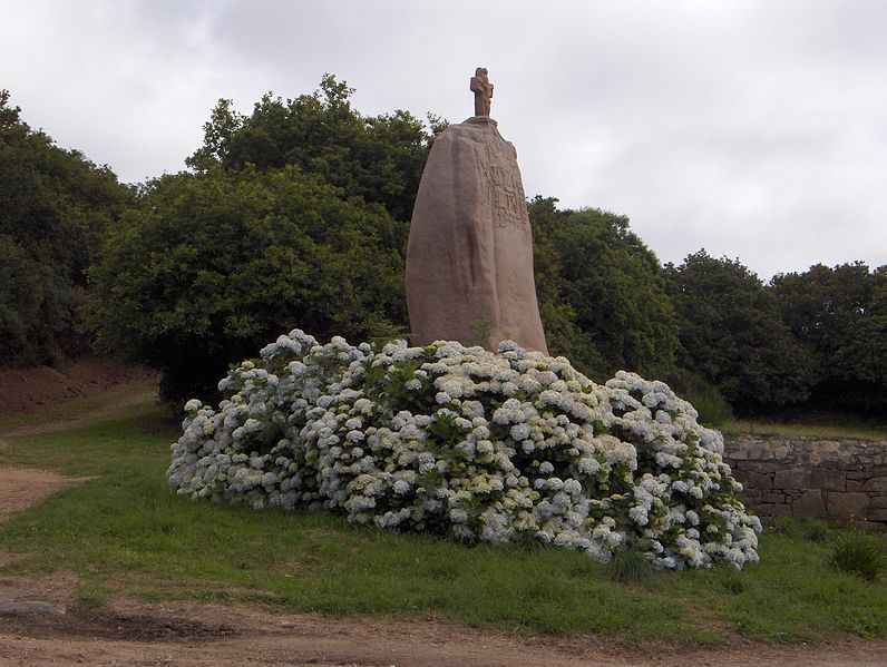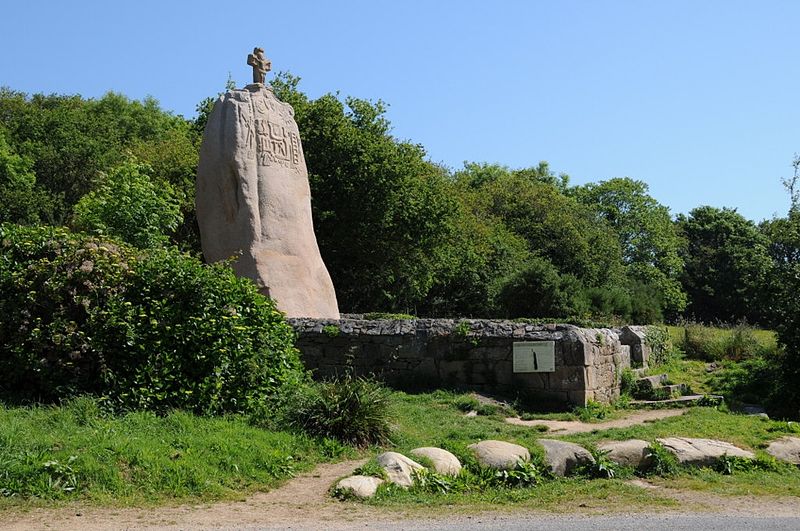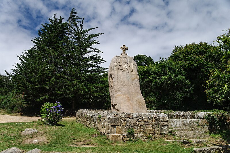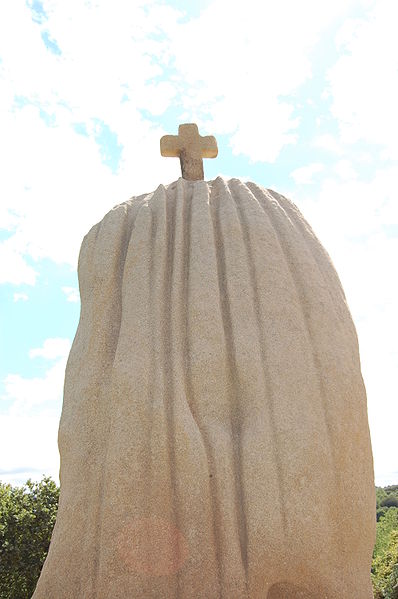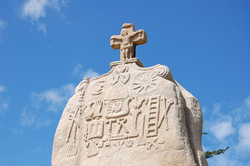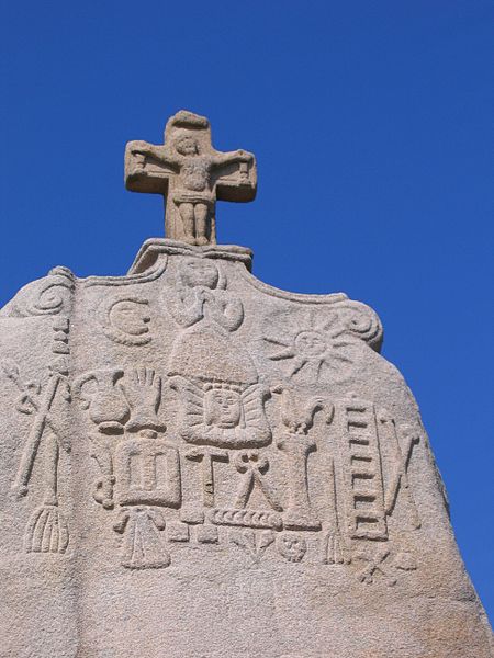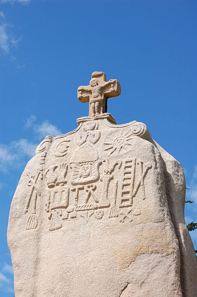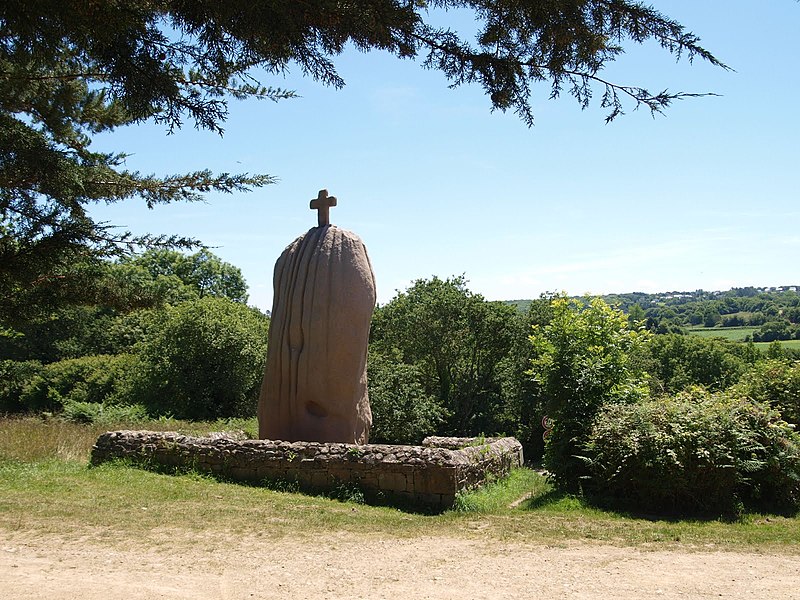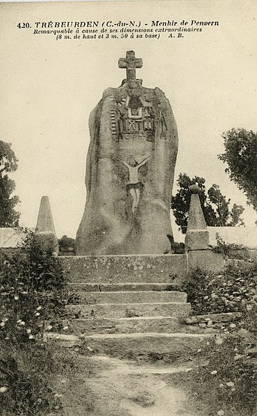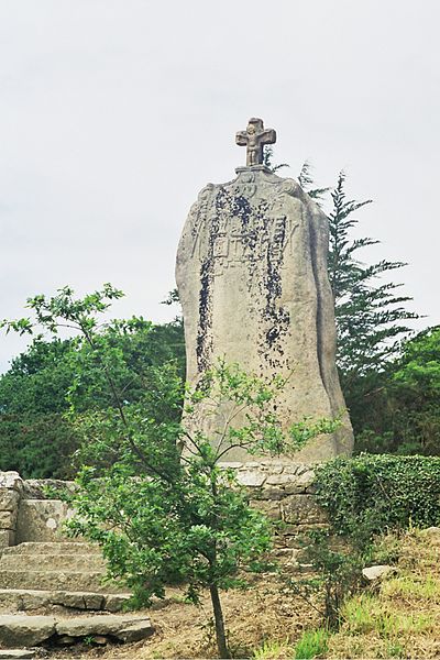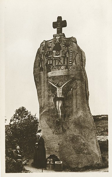 Le menhir, appelé Saint-Uzec en breton (Kalvar Sant-Uzeg), se trouve sur la commune de Pleumeur-Bodou, près de la chapelle Saint-Uzec en direction de l'Île-Grande, dans les Côtes-d'Armor. Il s'agit d'un bloc de granite de l'Île Canton pesant 80 tonnes, d'une longueur totale de 7,40 m, dont un tiers est enterré, et d'une largeur de 2,6 m. La face sud mesure 5,90 m et la face est 5,70 m ; la face sud est légèrement concave et les arêtes de la face est sont émoussées. La face nord porte de profondes rigoles d'érosion et des cuvettes d'altération, qui témoignent de la position originelle du bloc puis de son redressement : deux cuvettes prémégalithiques indiquent que la pierre était couchée et que cette face était alors vers le haut, et neuf rigoles postmégalithiques ont été creusées par l'écoulement des eaux de pluie depuis son dressage. Le menhir a été christianisé en 1674 lors d'une mission conduite par le père jésuite Julien Maunoir, qui l'a intégré à un placître accessible par un échalier, l'a fait peindre et sculpter, et l'a surmonté d'une croix. Cette christianisation des pierres dressées illustre la volonté de l'Église d'assimiler les pratiques païennes dans un syncrétisme religieux. L'appellation erronée « Saint-Duzec » trouve son origine dans une liaison bretonne entre Zant (saint) et Uek/Uzek, qui a donné en français Saint Josse et conduit à la confusion de toponymes. Le menhir est classé au titre des monuments historiques depuis 1889 sous le nom de « Menhir de Saint-Duzec ». Le décor était polychrome, comme l'attestent des cartes postales du début du XXe siècle et une planche en couleur de 1897, mais ces peintures sont aujourd'hui effacées. En 2005, sous l'égide des Bâtiments de France, la commune de Pleumeur-Bodou, propriétaire du monument, a mené une campagne de restauration qui a permis d'éradiquer les lichens noirs masquant les figures sculptées. Une croix en granite de l'Île Canton est fixée au sommet du menhir dans une cavité de 10 cm de profondeur à l'avant, maintenue par deux cales visibles, rouillées, et sans doute par d'autres éléments invisibles ; sa section est rectangulaire et elle mesure 97 cm de haut sur 70 cm de large. Le Christ, sculpté en demi-relief dans la masse, adopte l'iconographie du Christus patiens : la tête penche légèrement à droite, le sternum est creusé, les yeux sont fermés et un périzonium entoure le haut des cuisses ; deux calices recueillent le sang s'écoulant sous chaque main. Sous la croix, un fronton orné d'un double bourrelet part en accolade des pieds du Christ et se termine par deux volutes opposées ; il encadre un ensemble de vingt-sept sculptures en bas-relief, disposées dans un rectangle de 1,90 m de large sur 1,80 m de haut et rappelant le déroulement de la Passion, sans ordre strictement rigoureux. Le registre supérieur présente, de gauche à droite, le calice de Gethsémani, un croissant de lune entourant une figure de profil tournée vers une figure féminine, une femme agenouillée aux mains jointes, et un soleil portant en son centre une figure humaine ronde. Le soleil et la lune, symboles païens, ont été interprétés par les chrétiens comme évoquant les ténèbres du Vendredi saint et la Résurrection. La figure féminine peut être rapprochée d'une sculpture païenne, peut-être une déesse-mère celtique, mais elle peut aussi représenter la Vierge Marie, sa sculpture semblant porter une auréole, surtout si on l'associe au groupe situé en dessous qui représente des instruments de la Passion. Le second registre est encadré à gauche par une épée légèrement courbe à poignée elliptique et garde à deux crochets inégaux, et par une lance à pointe quasi triangulaire, évoquant l'arrestation au Jardin des Oliviers ; à droite il est encadré par la lance de Longin et la tige d'hysope portant l'éponge. Ce registre comprend, de gauche à droite, une aiguière accompagnée d'une main gauche ouverte, le voile de Véronique, le coq du reniement de saint Pierre perché sur la colonne de la flagellation, puis une échelle évoquant la descente de croix. Le troisième registre, encadré par deux fouets composés de plusieurs lanières courtes, comporte de gauche à droite le sabre de saint Pierre qui trancha l'oreille de Malchus, la lanterne de l'arrestation, puis des tenailles et un marteau sous lesquels sont représentés les deniers de Judas. Le registre inférieur montre la tunique sans couture, les trois dés des soldats lors du tirage au sort des vêtements du Christ, les trois clous, le crâne d'Adam, deux os croisés pouvant symboliser la descente aux enfers, et un pot d'onguent. À mi-hauteur se trouvait peint un Christ polychrome sur une croix rouge, sur fond d'écusson noir ; cette peinture est désormais totalement effacée. La documentation visuelle comprend une vue générale, une photographie de la face sud envahie de lichens en 2003, une vue de la face nord montrant les figures d'érosion pré et post-mégalithiques, et une carte postale des années 1930 où les peintures et sculptures étaient encore bien visibles.