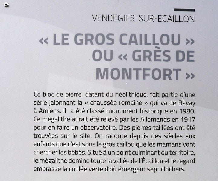 Le Gros Caillou, ou Grès Montfort, est un mégalithe en grès landénien situé au lieu-dit Bruyère de Sommaing à Vendegies-sur-Écaillon (Nord). Vers 1870-1872, un transport vers le cimetière pour servir de soubassement de calvaire fut tenté à l'aide d'un chariot prêté par la compagnie des mines d'Anzin et attelé de vingt chevaux, mais la pierre, soulevée sur des madriers, ne put être déplacée et fut laissée sur place. En 1918, une compagnie de l'armée allemande releva la dalle et procéda à une petite fouille archéologique dont les résultats sont perdus ; une inscription fut alors gravée puis effacée ultérieurement par grattage. L'édifice est classé au titre des monuments historiques en 1980.