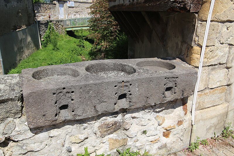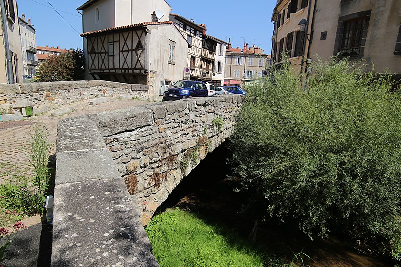 Petit pont à une arche en ellipse, au tablier légèrement bombé. La partie du parapet qui s'appuie contre l'ancienne maison du poids public contient une longue dalle de lave creusée de trois boisseaux, mesures circulaires de différentes contenances, chacune percée d'une ouverture latérale. Ces ouvertures étaient munies de petites trappes glissant dans des coulisses métalliques. En position relevée, la trappe laissait s'écouler le grain du récipient mesureur dans des sacs maintenus sous l'ouverture par des crochets de fer. L'ancienne maison du poids public, adossée à cette extrémité du pont, présente une façade en encorbellement sur la rivière, construite en pans de bois dont l'ossature est dissimulée sous un crépi.