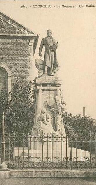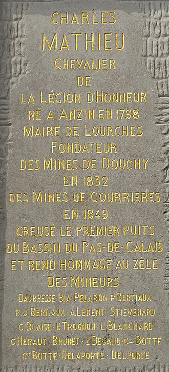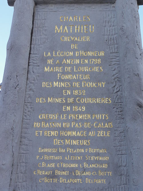 Le Monument à Charles Mathieu, installé devant l'église de Lourches, rend hommage au directeur de la Compagnie des mines de Douchy. Une société de recherches fondée en 1829 par la Compagnie Dumas découvrit la houille, puis la Compagnie des mines de Douchy fit appel, au début de 1832, à l'ingénieur Charles Mathieu pour effectuer les premiers fonçages à Lourches. Il fit creuser la fosse Saint‑Mathieu ; le charbon y fut rencontré à 78 mètres en 1832 et la mise en exploitation commença en 1833. L'habitation du directeur, devenue la mairie, fut bâtie en 1845. L'activité minière transforma considérablement la commune : sa population passa de 155 habitants en 1804 à 5 834.