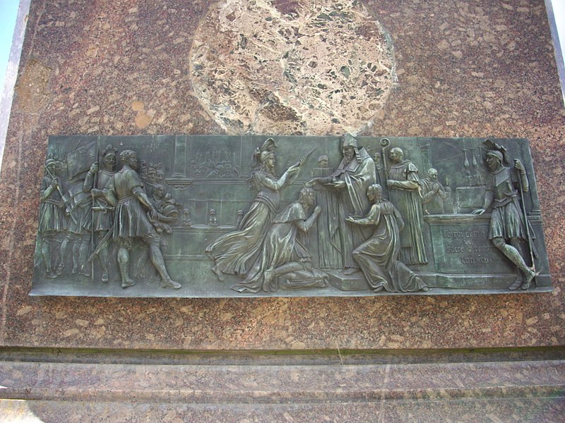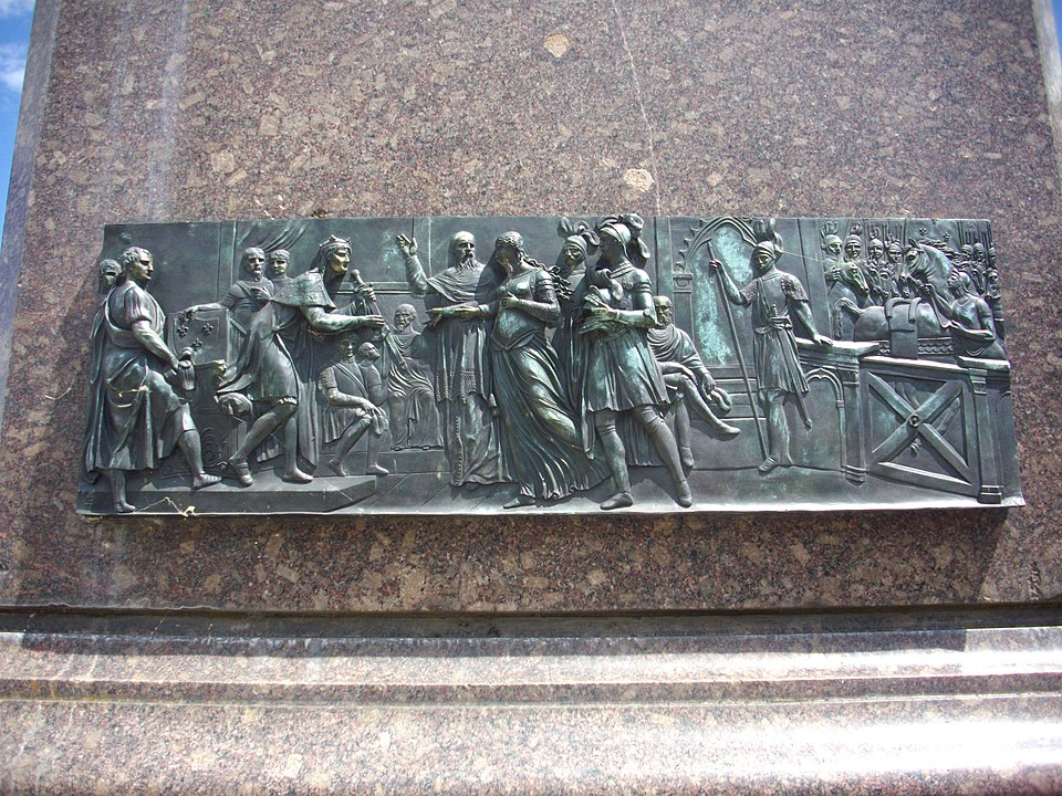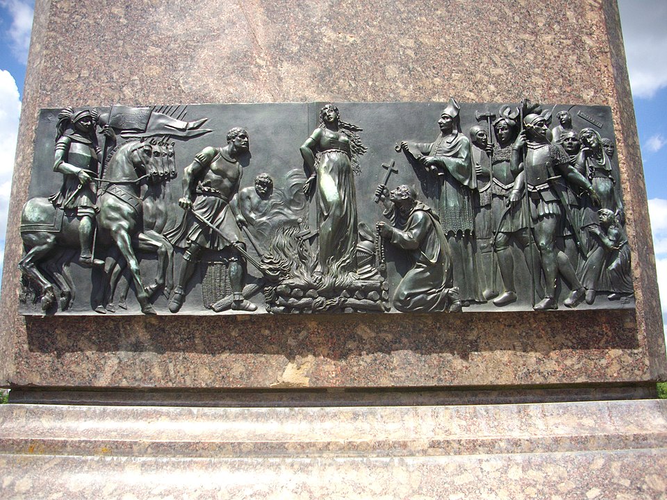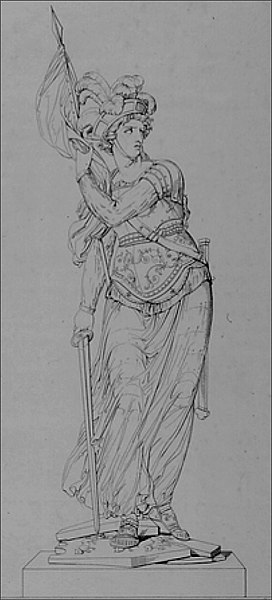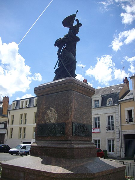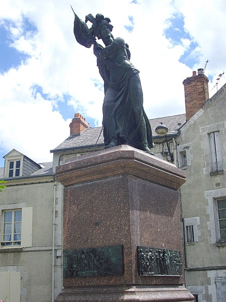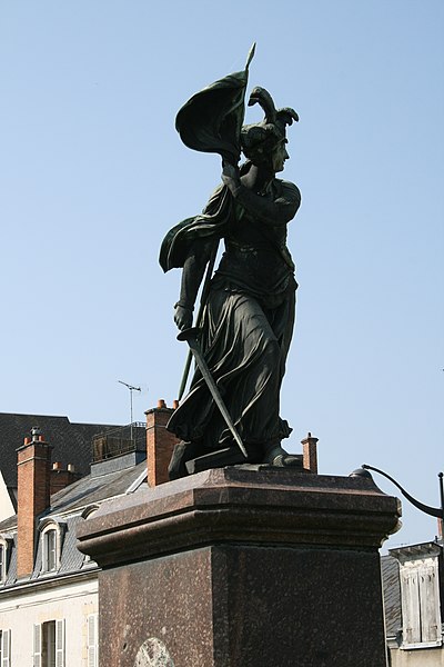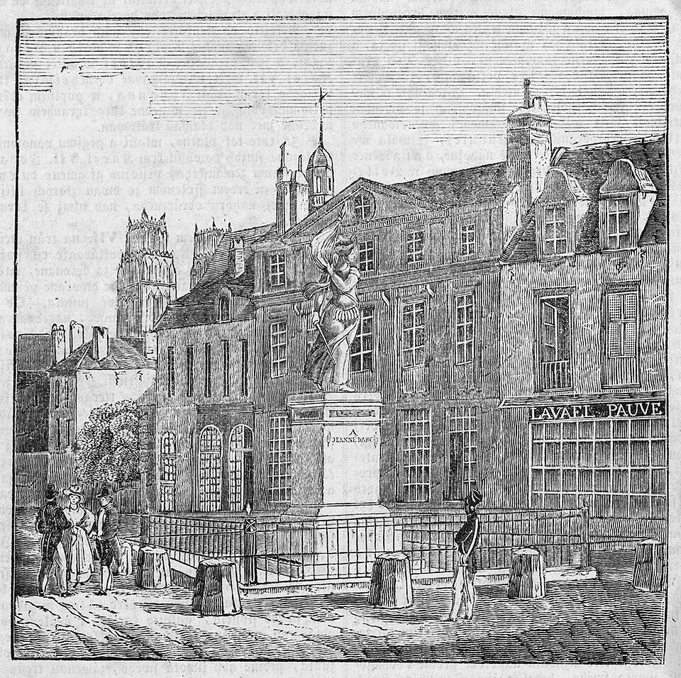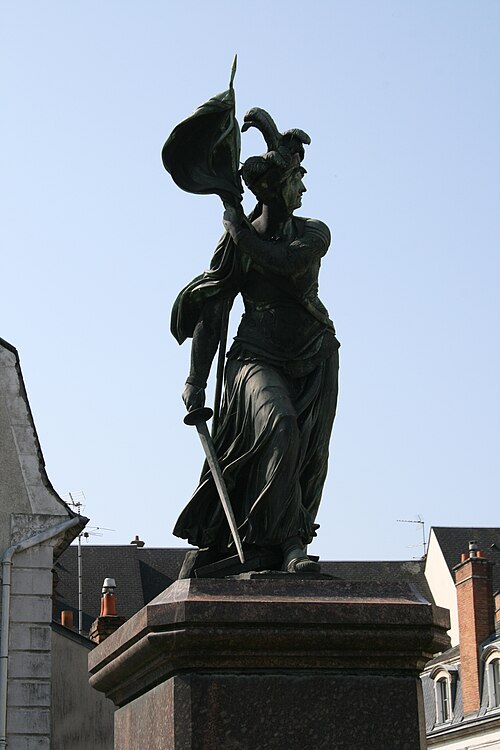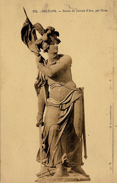 Ce monument constitue le premier grand hommage public rendu à Jeanne d'Arc dans la région Centre et représente la Pucelle à Orléans sous les traits d'une Jeanne guerrière. La statue, datée du XIXe siècle, a été réalisée par Edme-François-Étienne Gois. Elle a d'abord été installée sur la place du Martroi (1804–1855), puis placée à la tête du pont George-V sur la rive gauche de la Loire, où elle est restée jusqu'au milieu du XXe siècle. Des sources précisent qu'elle se trouvait en tête sud du pont en 1856 et qu'elle fut déplacée d'environ 60 mètres en amont à l'emplacement de l'ancien pont des Tourelles en 1956. Par la suite, elle a été installée sur le quai du Fort-des-Tourelles jusqu'en 2013, année de son transfert dans le square de La Pucelle sur la rive gauche. La statue a été commandée et exécutée au cours du Premier Empire. Classée monument historique en 2017 avec cinq autres statues d'Orléans, son inscription a fait l'objet d'un arrêté publié au Journal officiel en mai 2018. Inspiré par un tableau perdu de Philippe de Champaigne, connu par des gravures, et par le portrait dit des échevins, Gois a conçu une Jeanne d'Arc en pied, militarisée. Elle porte un béret orné d'un panache de plumes et une cuirasse ; sa pose est dynamique, exaltée, et elle foule au pied un bouclier anglais tout en étreignant une bannière proche du drapeau bleu-blanc-rouge. La statue mesure 2,60 m sur un socle de 2,90 m, proportions qui ont déçu une partie des Orléanais. Vue en pied, elle présente une robe flottante, esthétique singulière pour la période néo-classique ; en plan rapproché, le chapeau est orné d'un panache. Les sources iconographiques comprennent le portrait dit des échevins (vers 1580), une gravure de 1690 d'après le tableau perdu de Champaigne, une gravure romantique peut‑être inspirée par la statue, le dessin préparatoire de Gois (1803) et la statue réalisée en 1804.