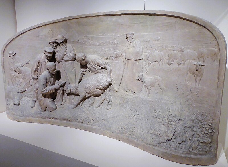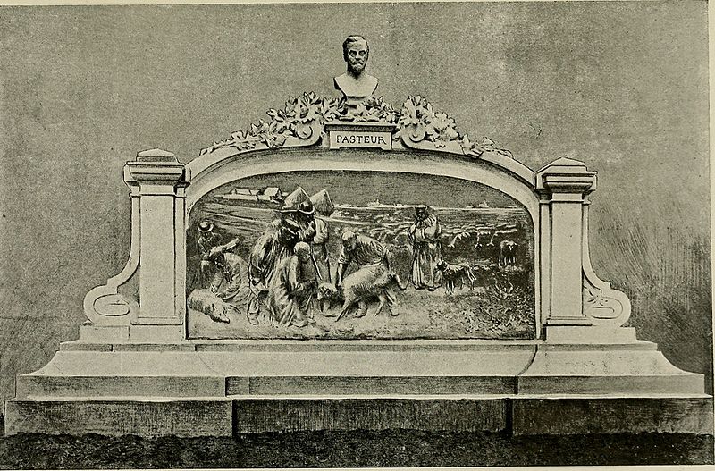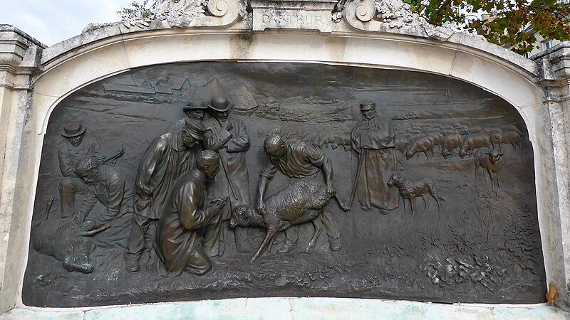 Dans un encadrement de pierre et surmonté du buste en marbre de Pasteur, le haut-relief en bronze réunit huit personnages et restitue une expérience majeure menée en 1878 à Saint-Germain-la-Gâtine, avec, à l'horizon, le village de Poisvilliers. La scène montre, sous l'observation des vétérinaires Daniel Boutet et Jules Vinsot et des propriétaires et praticiens Jules et Alphonse Maunoury, le docteur Émile Roux s'apprêtant à inoculer à un mouton vacciné le sang d'un animal mort du charbon, dont Charles Chamberland procède à l'autopsie, tandis que Séverin Jacquet, berger du troupeau, contemple la scène appuyé sur son bâton.