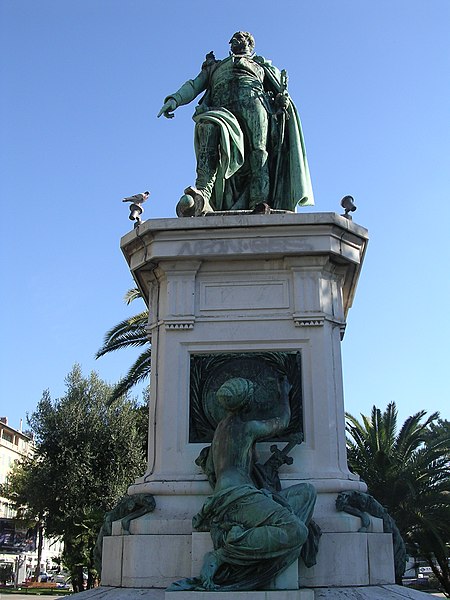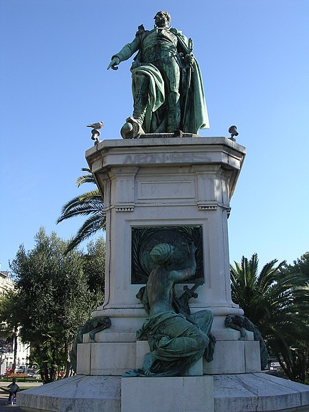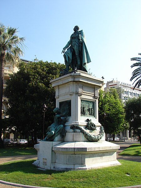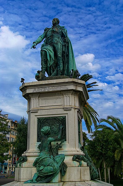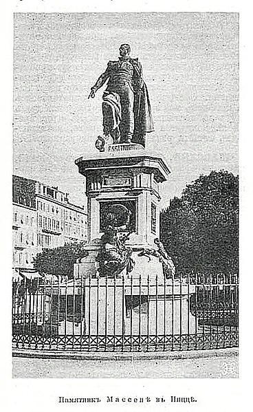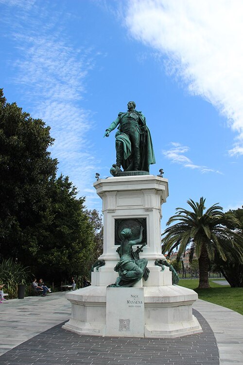 Monument commémoratif en hommage au maréchal André Masséna, natif de Nice, l’œuvre est de l’atelier d’Albert‑Ernest Carrier‑Belleuse, lauréat du concours organisé en 1865. La statue en bronze, coulée par la fonderie Thiébaut Frères et réalisée en 1867, représentait à l’origine le maréchal installé dans l’ancien square Général‑Leclerc, sur la partie la plus anciennement couverte du Paillon (1866‑1868), et se trouve aujourd’hui intégrée à la promenade du Paillon. La figure du maréchal évoque la bataille d’Essling : debout, tête découverte, en grand uniforme de maréchal de France en campagne, il pose le pied droit sur un canon à terre, fait un geste impératif de la main droite et serre de la main gauche la poignée de son sabre encore en fourreau ; le socle porte la gravure « Essling ». La face avant du piédestal porte une statue en bronze représentant une jeune femme au torse nu, figure de la Victoire — ou peut‑être de l’Histoire — qui tient un sabre de la main gauche et grave le nom de Masséna sur un médaillon de la main droite. Sur les faces latérales, deux bas‑reliefs en bronze illustrent la carrière militaire : à gauche Masséna à cheval lors de la bataille de Zurich, à droite la scène du siège de Gênes, où entouré de ses officiers il dicte, debout devant une table, les conditions de la reddition de la ville. Un emplacement place Masséna avait été envisagé mais abandonné car la statue y aurait tourné le dos à la vieille ville ; elle fut donc placée au centre du nouveau square aménagé sur le Paillon, entre la vieille ville et les nouveaux quartiers. L’inauguration a été célébrée le 15 août (fête dite de Saint‑Napoléon) ; les sources signalent tantôt 1868, tantôt 1869, cette dernière date étant liée au centenaire de la naissance de Napoléon I. Les discours furent prononcés par André Reille, François Malausséna et Victor Masséna, en présence du préfet Denis Gavini. Le monument affirmait l’attachement de Nice à la France et au Second Empire. Il a été inscrit aux monuments historiques en 2009.