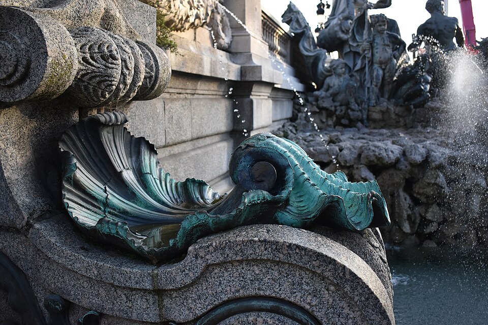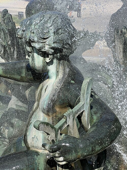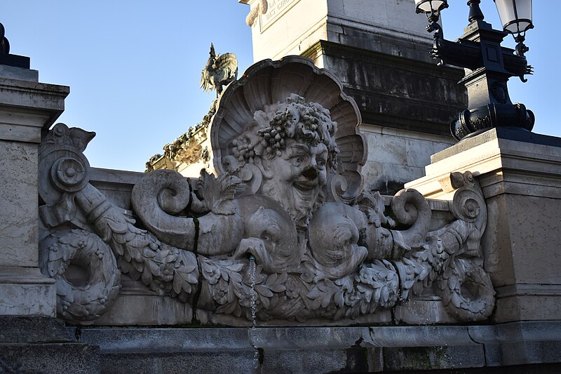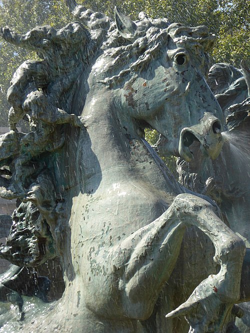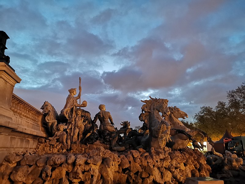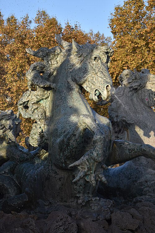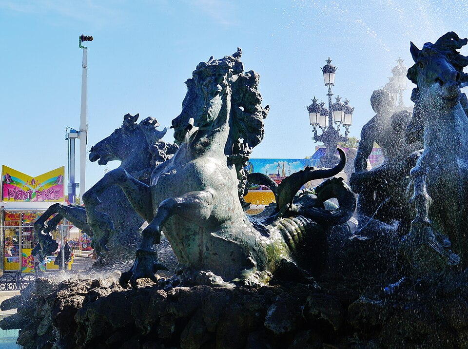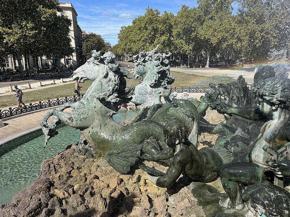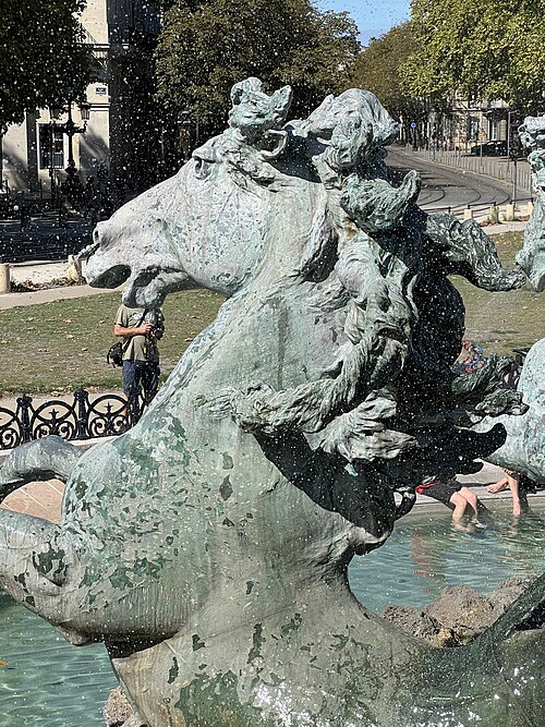 En septembre 1942 est décidée la mise au rebut des ornements en bronze dans le cadre de la mobilisation des métaux non ferreux ; le déboulonnage commence à partir de mi-août 1943 et les pièces sont expédiées à la fonderie Savigner à Angers, où le fondeur les conserve puis les restitue à la ville le 5 juillet 1945. Les bronzes sont entreposés puis déplacés à l'avenue du docteur Schinazi ; une association formée en 1968 réclame leur réinstallation et, après une campagne de presse, ils sont finalement remis en place en 1983. Une statuette figurant la Liberté, l'Égalité et la Fraternité, posée sur la sphère tenue par la statue assise de la fontaine sud, a disparu, vraisemblablement volée.