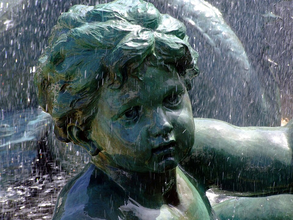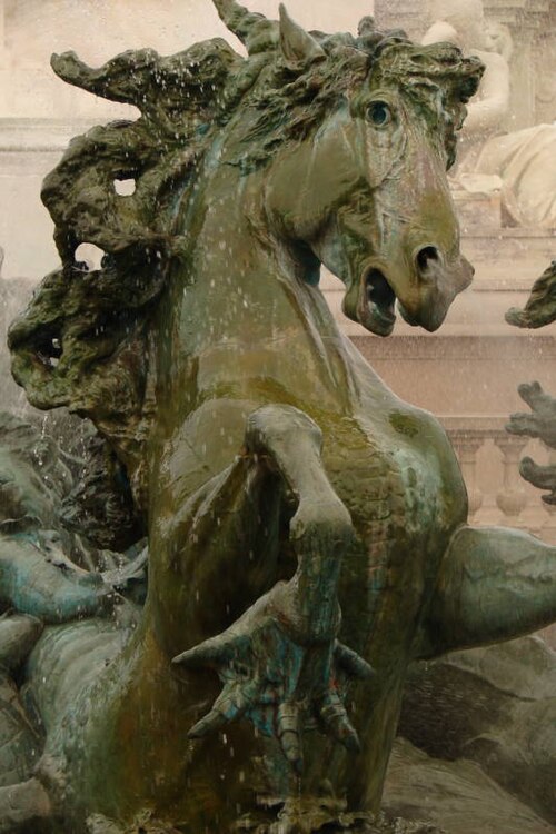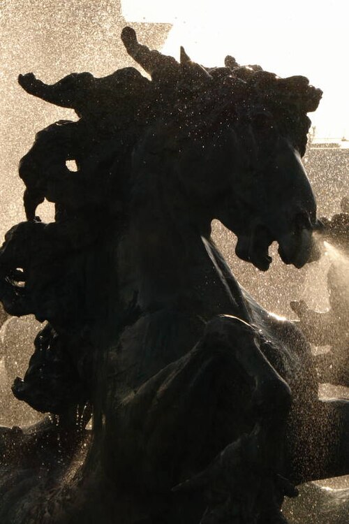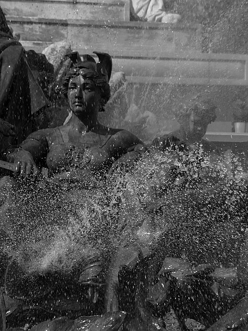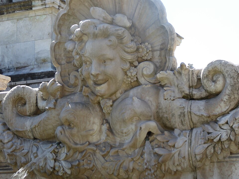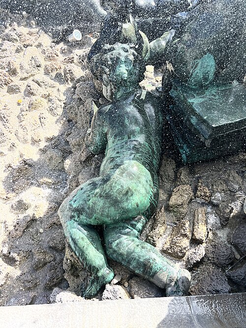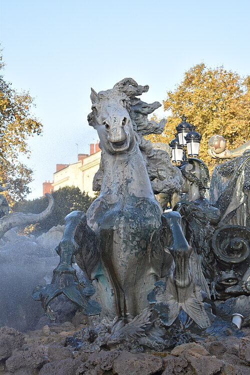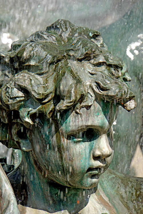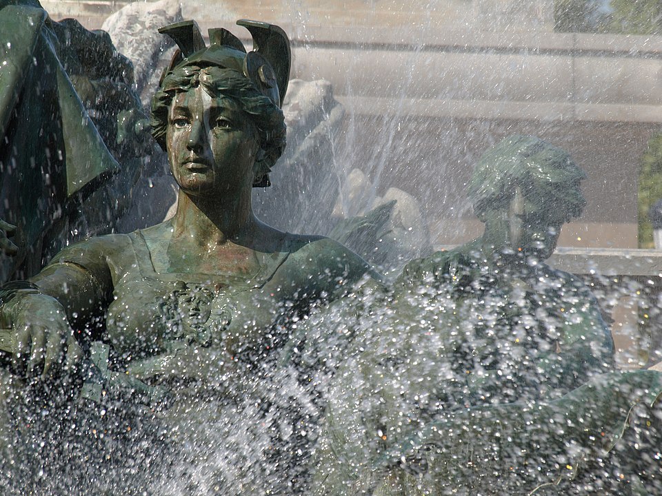 En septembre 1942 est décidée la mise au rebut des ornements en bronze dans le cadre de la mobilisation des métaux non ferreux ; le déboulonnage commence à partir de mi-août 1943 et les pièces sont expédiées à la fonderie Savigner à Angers, où le fondeur les conserve puis les restitue à la ville le 5 juillet 1945. Les bronzes sont entreposés puis déplacés à l'avenue du docteur Schinazi ; une association formée en 1968 réclame leur réinstallation et, après une campagne de presse, ils sont finalement remis en place en 1983. Une statuette figurant la Liberté, l'Égalité et la Fraternité, posée sur la sphère tenue par la statue assise de la fontaine sud, a disparu, vraisemblablement volée.