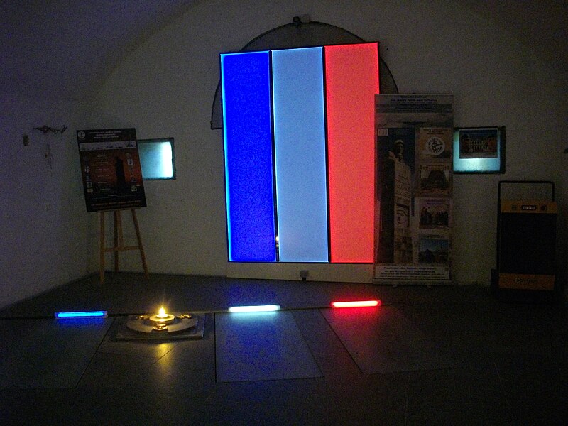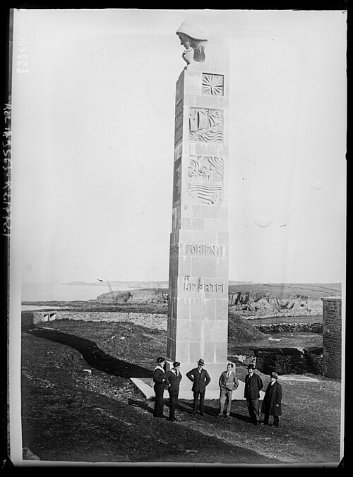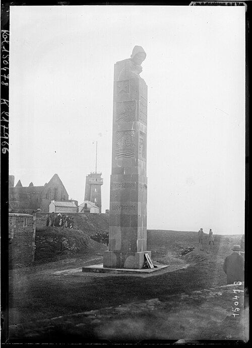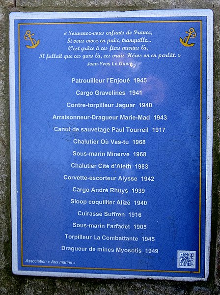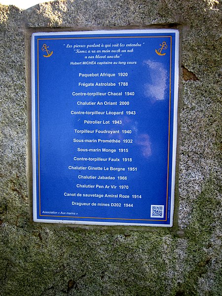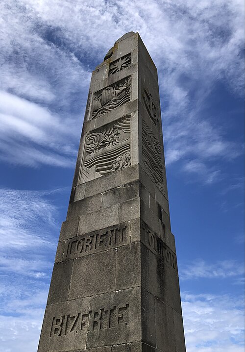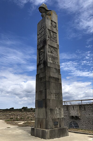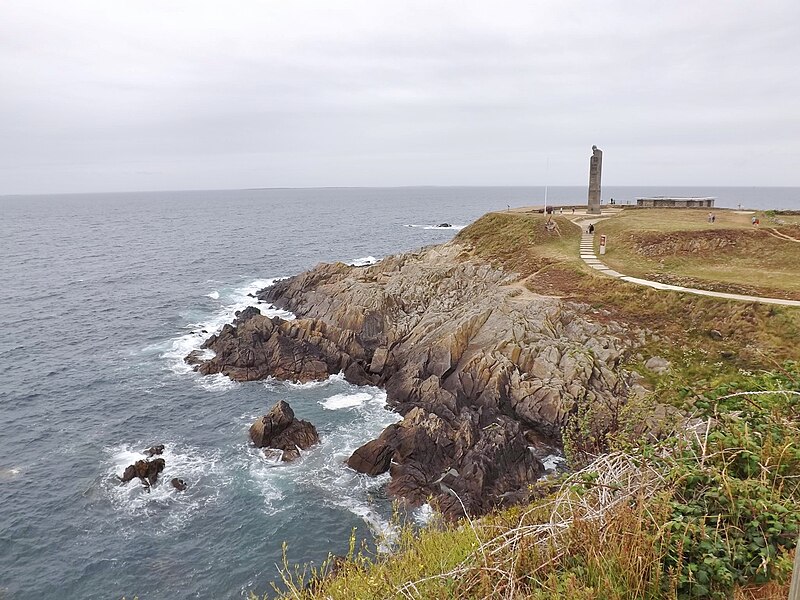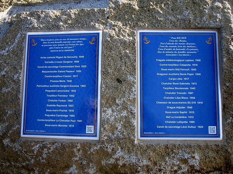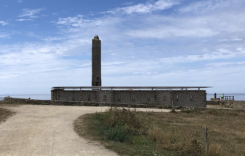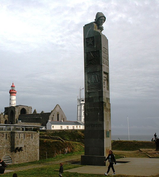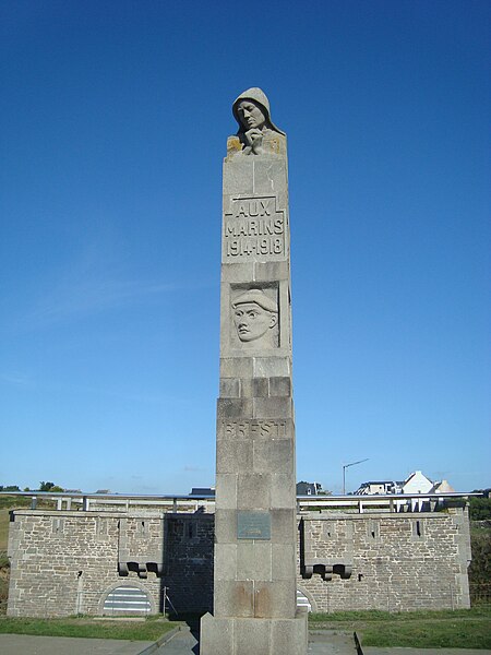 Situé à l'extrémité de la pointe Saint-Mathieu, près de l'abbaye, le Monument aux marins morts pour la France durant la Première Guerre mondiale constitue le premier élément du Mémorial national aux marins morts pour la France. Inauguré le 12 juin 1927, il est complété au début des années 2000 par l'Esplanade du souvenir français et le Cénotaphe aux marins, dédié à la mémoire des marins morts lors de tous les conflits. L'édification du monument résulte d'une proposition du ministre de la Marine Georges Leygues et de l'amiral Émile Guépratte, député du Finistère, visant à ériger un mausolée honorant les marins de guerre et de commerce disparus pendant les hostilités. Le projet prévoyait une œuvre taillée face au large dans l'une des falaises, placée à un carrefour stratégique de routes maritimes. La loi consacrant la construction sur la pointe Saint-Mathieu fut promulguée le 26 juillet 1923 par le président Millerand, et la réalisation confiée au sculpteur finistérien René Quillivic (1879-1969).