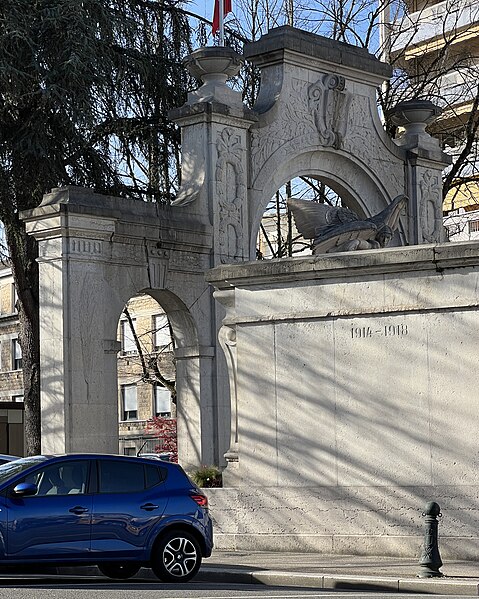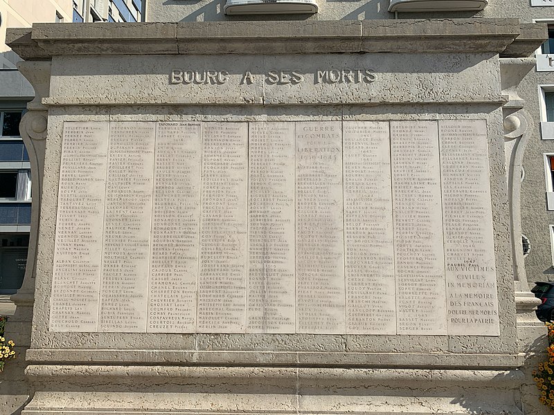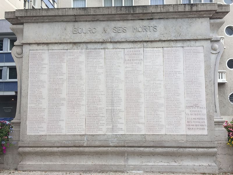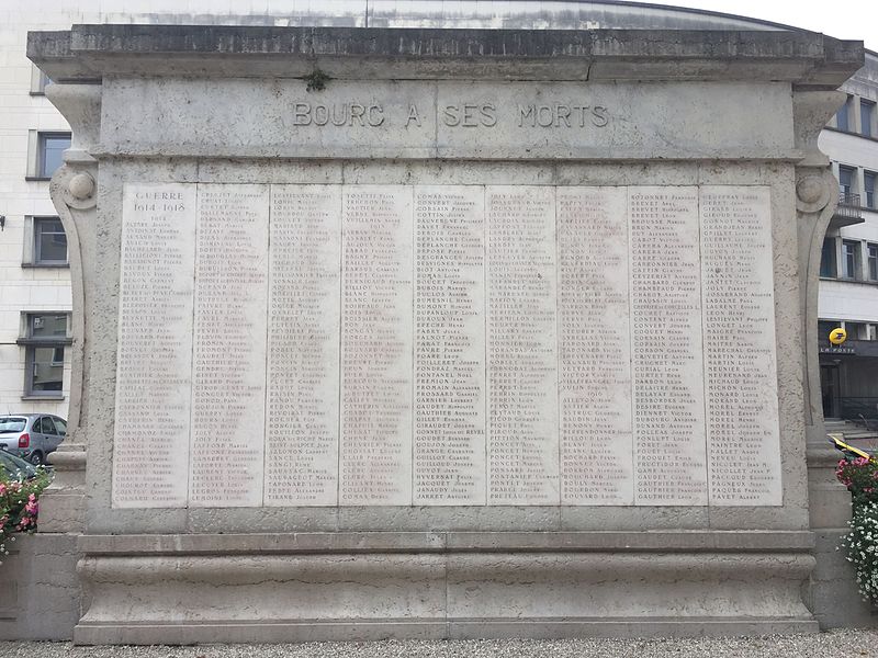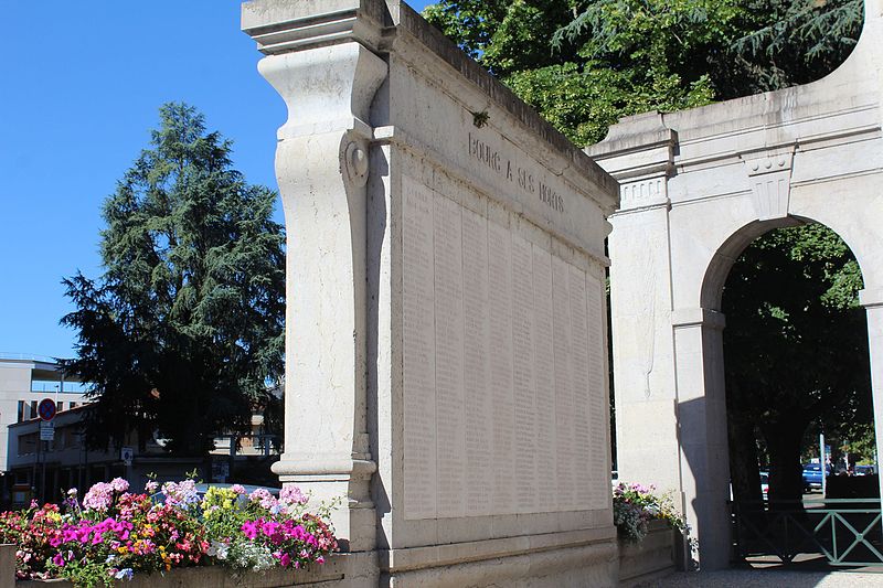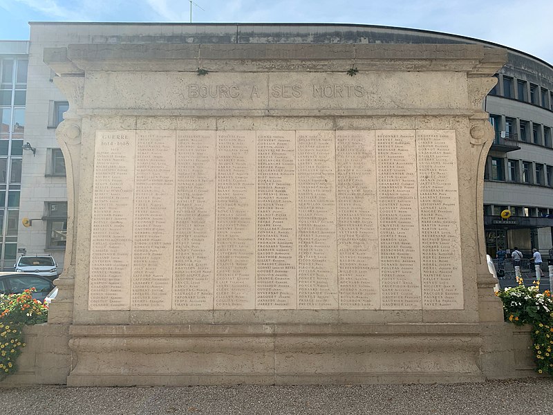 Le monument aux morts de Bourg-en-Bresse est un mémorial situé dans la commune de Bourg-en-Bresse, dans le département de l'Ain. Il est inscrit au titre des monuments historiques depuis le 13 mars 2019. Des ressources et références complètent la notice, notamment des illustrations sur Wikimedia Commons, des fiches et bases de données comme Mérimée et « À nos grands hommes », ainsi que des listes thématiques : monuments historiques de Bourg-en-Bresse, édifices labellisés « Patrimoine du XXe siècle » de l'Ain et monuments aux morts de France protégés. On peut par ailleurs consulter les portails des monuments historiques français et de l'Ain pour des informations complémentaires.