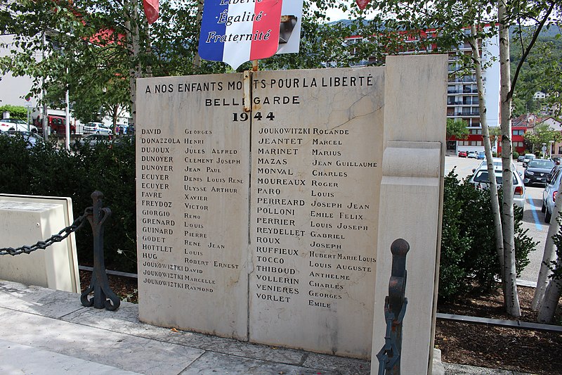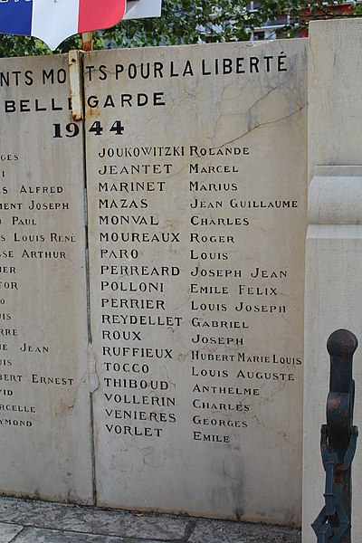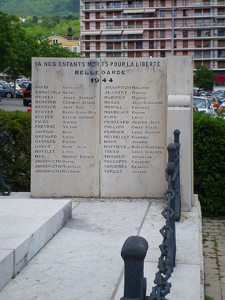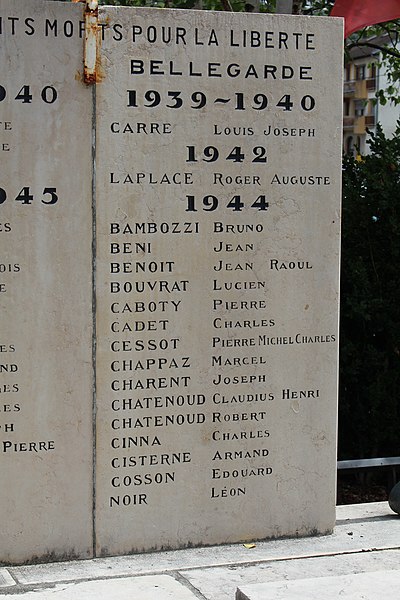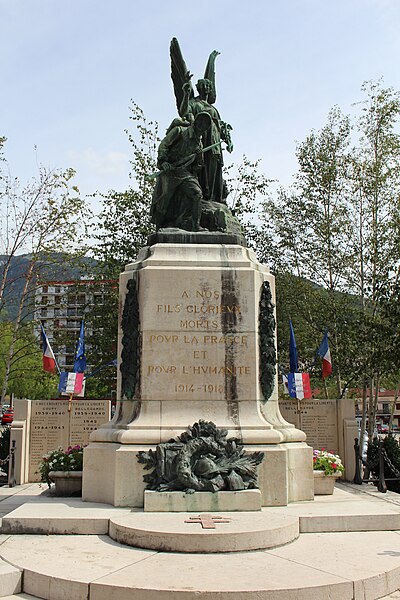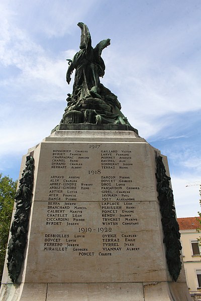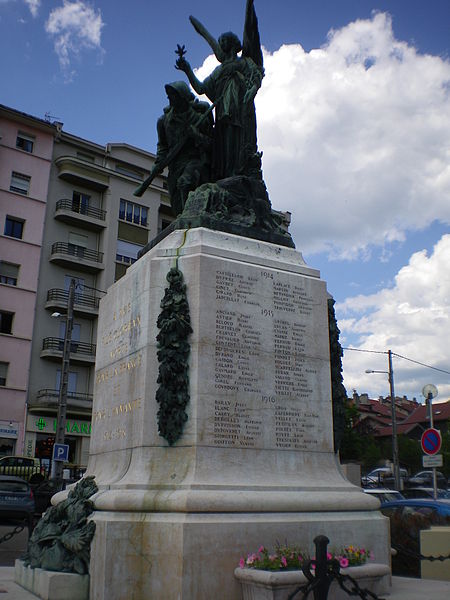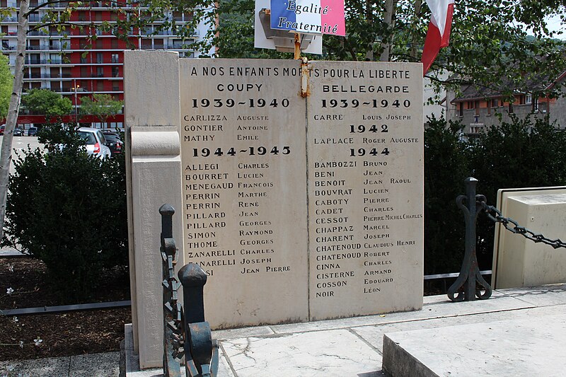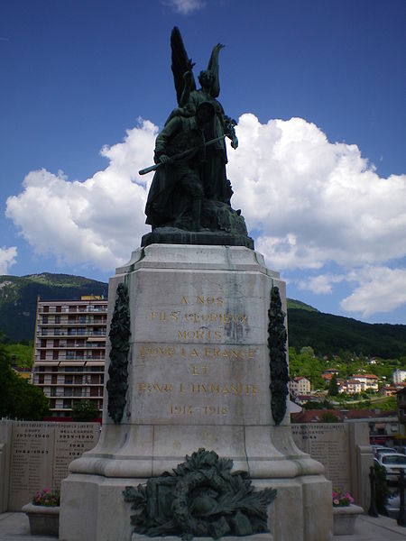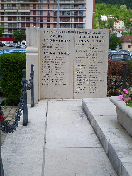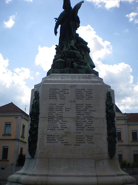 Le monument aux morts de Bellegarde-sur-Valserine, situé place Carnot dans la commune de Valserhône (Ain), a été réalisé par l'architecte en chef des monuments historiques Lucien Sallez et le sculpteur Jules Déchin, les bronzes ayant été coulés par la fonderie Durenne. Déchin, connu pour ses monuments aux morts produits en série — dont le Poilu mourant — faisait souvent appel à des éléments catalogués et fondus par Durenne ; cependant, des recherches dans les archives du fondeur montrent que le monument de Bellegarde constitue une œuvre originale au sein de leur corpus. Le monument a été inauguré le 3 juin 1923 et est inscrit au titre des monuments historiques depuis le 13 mars 2019. Il se compose d'un socle surmonté d'une sculpture représentant un poilu au combat placé sous la protection de la Victoire, figurée par une femme ailée tenant un rameau d'olivier. Sur la base figure la mention Verdun. Les noms des morts de Bellegarde pendant la Grande Guerre sont gravés sur les faces avant, gauche et droite du socle, tandis que la face arrière porte ceux de l'ancienne commune de Coupy. Certains morts de Coupy, en particulier ceux du hameau de Vanchy (ancien chef-lieu de la commune), ne figurent pas sur ce monument, leurs noms étant inscrits sur un monument distinct érigé au cœur du hameau et inauguré le 2 octobre 1921.