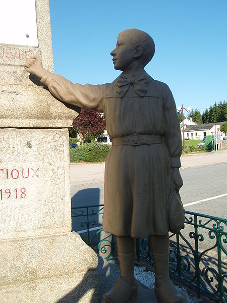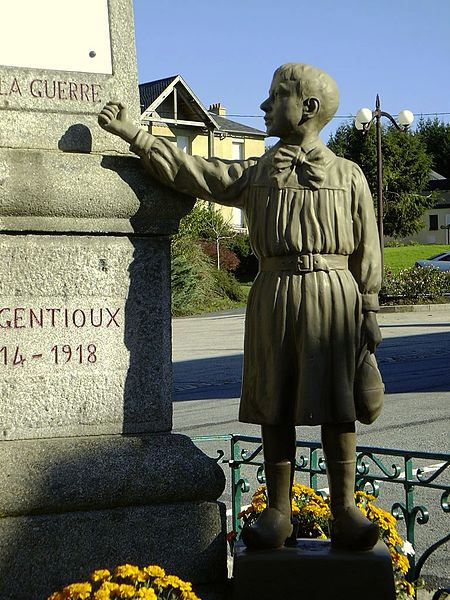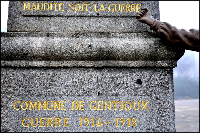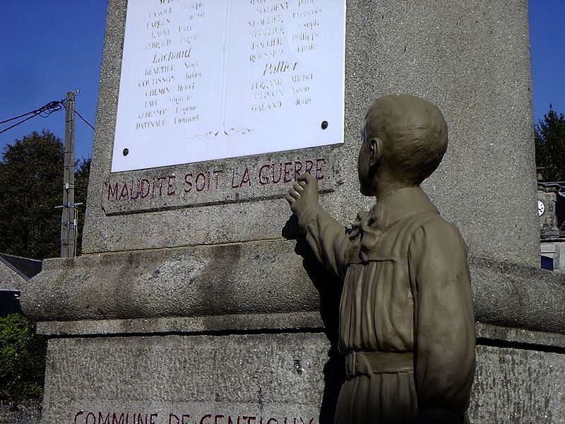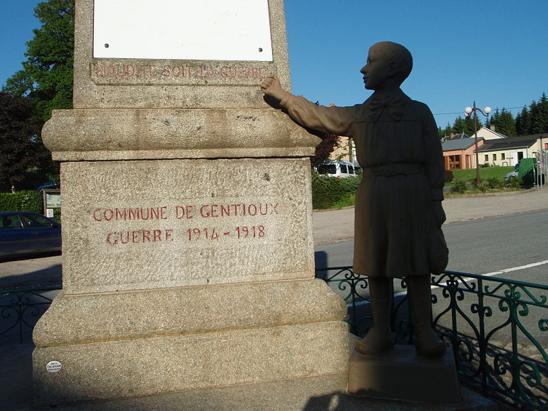 Le monument aux morts de Gentioux-Pigerolles, situé sur la place principale du bourg, est un édifice d’inspiration pacifiste réalisé dans les années 1920 d’après un modèle en bois dessiné par le conseiller municipal Jean‑Marie Duburgt. Conçu et financé par la commune, il a été exécuté par des artisans locaux : le sculpteur Jules Pollachi, le fondeur Ed. Guichard et l’entrepreneur Émile Eglizeaud. Le projet, adopté par le conseil municipal sous l’autorité du maire Jules Coutaud, militant jaurésien de la SFIO et ancien combattant, a suscité l’opprobre des autorités et n’a pas reçu de représentation préfectorale lors de sa mise en place, si bien qu’il ne fut officiellement reconnu que lors d’une inauguration en novembre 1985. Le monument, l’un des rares en France à porter un message pacifiste, porte en évidence l’inscription « Maudite soit la guerre », incarnée par la statue d’un enfant orphelin en sarrau et sabots, casquette dans la main gauche et poing droit levé, qui désigne les noms gravés. L’ouvrage, en granite, fonte et marbre, se présente comme une colonne élevée sur un socle à trois marches, décorée de palmes et mesurant 3,80 mètres de hauteur pour 2,78 mètres de largeur. La face principale porte une stèle où figurent en lettres d’or 58 noms de victimes de la Première Guerre mondiale, auxquels cinq autres noms issus d’autres conflits ont été ajoutés, pour un total de 63 noms. Sur le socle et la statue figurent des plaques signalant la commune et les auteurs : « Commune de Gentioux/guerre 1914‑1918 », « Emile Eglizeaud, tailleur de pierres » et « J. Pollachi, sculpteur / Ed Guichard fondeur ». Inscrit au titre des monuments historiques le 9 février 1990, le monument conserve sa plaque « Maudite soit la guerre » qui est considérée comme inamovible. Les communes de Gentioux et de Pigerolles, réunies depuis 1972, conservent chacune leur mairie et leur monument aux morts ; celui de Gentioux est devenu l’un des plus connus des monuments pacifistes français. Chaque 11 novembre, des rassemblements de militants et d’associations ont lieu devant la stèle, accompagnés du chant de la chanson de Craonne et de dépôts de gerbes ; ces commémorations se prolongent parfois jusqu’à la tombe de Félix Baudy, soldat fusillé pour l’exemple en 1915 et réhabilité en 1934, dont la sépulture à Royère‑de‑Vassivière porte une plaque rénovée en 2005. Le monument est depuis longtemps un symbole du pacifisme et du rejet du militarisme, lieu de manifestations et de rendez‑vous associatifs, parfois aussi la cible de dégradations : il a été tagué dans la nuit du 8 au 9 juillet 2023 avec des prénoms de jeunes morts lors d’interventions policières, tags effacés le matin du 9 juillet, puis de nouveau tagué dans la nuit du 10 au 11 novembre 2023 avec un drapeau palestinien et des inscriptions.