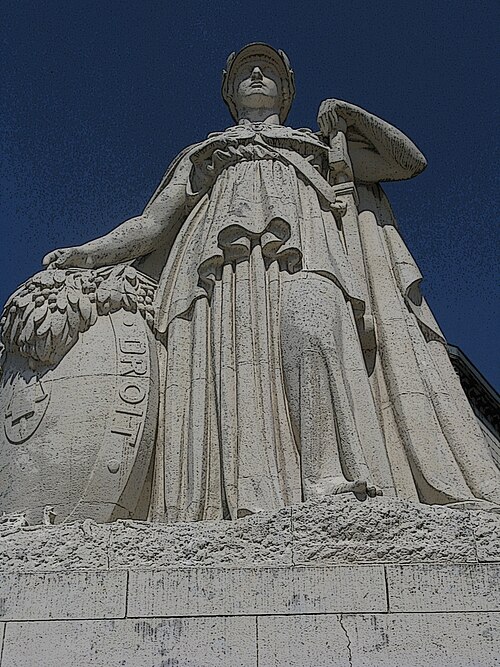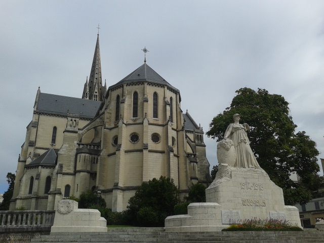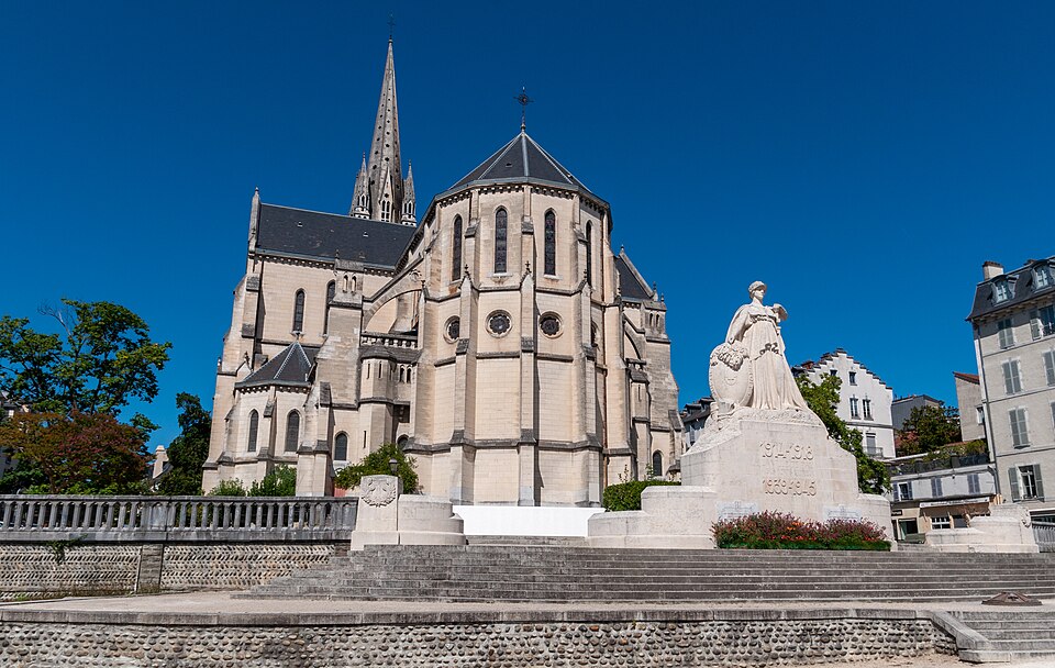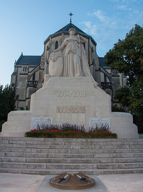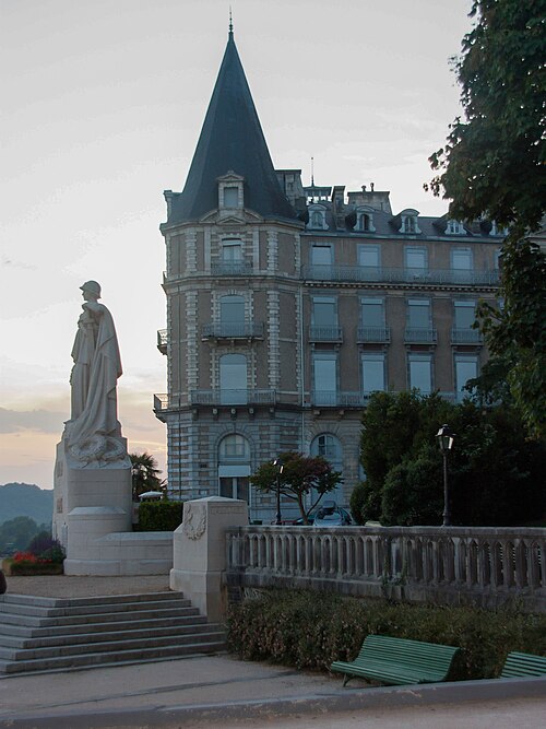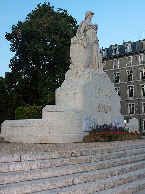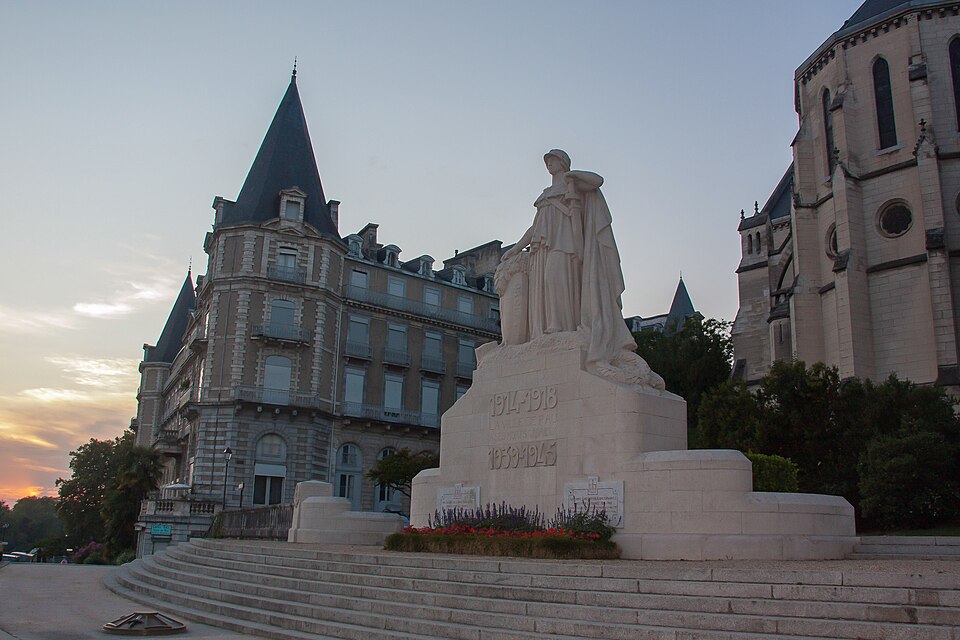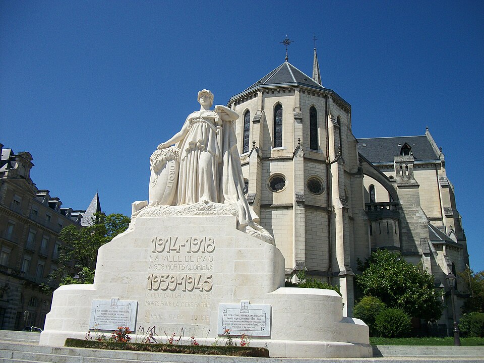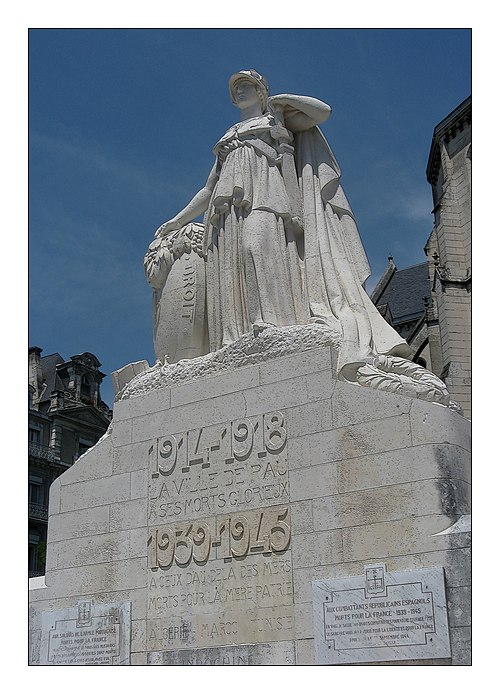 Le monument, réalisé entre 1924 et 1927 par l'architecte Henry Challe et le sculpteur Georges Vérez, représente la France victorieuse figurée par Athéna casquée et armée. La statue repose sur un piédestal imposant précédé d'une marche. À l'arrière, un bas-relief montre une veuve et son fils. De chaque côté, des piles cubiques portent les noms des batailles auxquelles a participé le 18e régiment, basé à Pau.