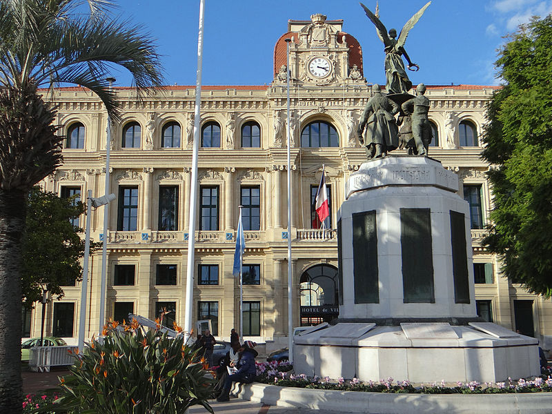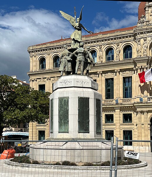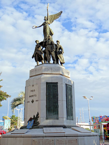 Le monument aux morts de la guerre de 1914-1918 est situé à Cannes, sur la route du bord de mer, au niveau des allées de la Liberté et de la promenade de la Pantiero, face à l'hôtel de ville, dans le quartier Centre-ville - Croisette. La statuaire a été confiée au sculpteur Albert Cheuret; le monument a été inauguré le 11 novembre 1927 et inscrit au titre des monuments historiques le 22 février 2010. Il se compose d'un haut piédestal octogonal en pierre dure surmonté d'un groupe en bronze représentant quatre militaires — un aviateur, deux fantassins et un marin — autour d'une Victoire ailée posée sur un bouclier. La Victoire tient dans une main une couronne de laurier et dans l'autre un rameau d'olivier. Les noms des combattants morts pour la France sont gravés en relief sur huit plaques de bronze disposées sur les côtés du piédestal, au‑dessus desquelles sont mentionnées les grandes batailles ou zones de la guerre. Si la figure allégorique de la Victoire est courante sur les monuments publics depuis la fin du XIXe siècle, la présentation des noms sur ces plaques confère une originalité à cet ensemble.