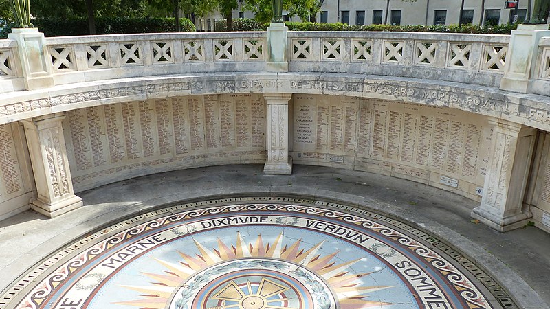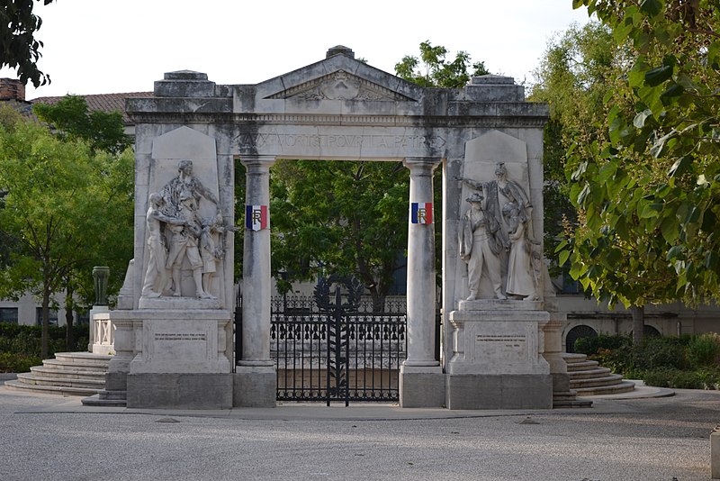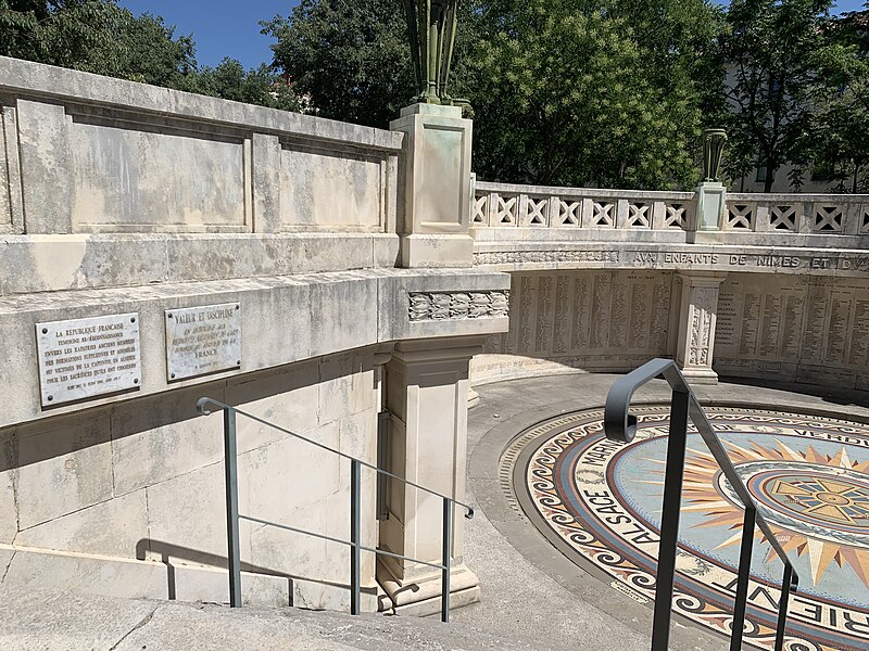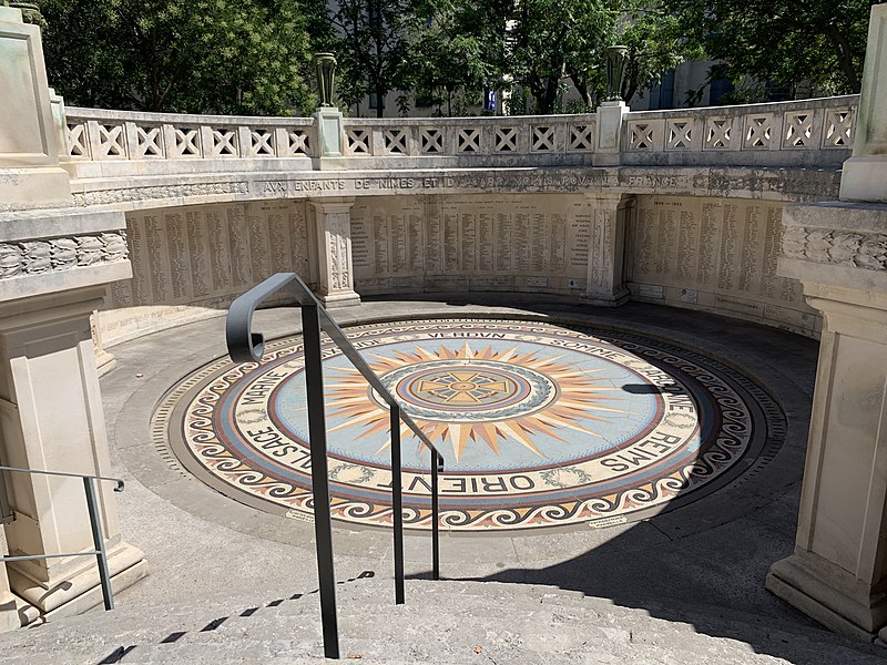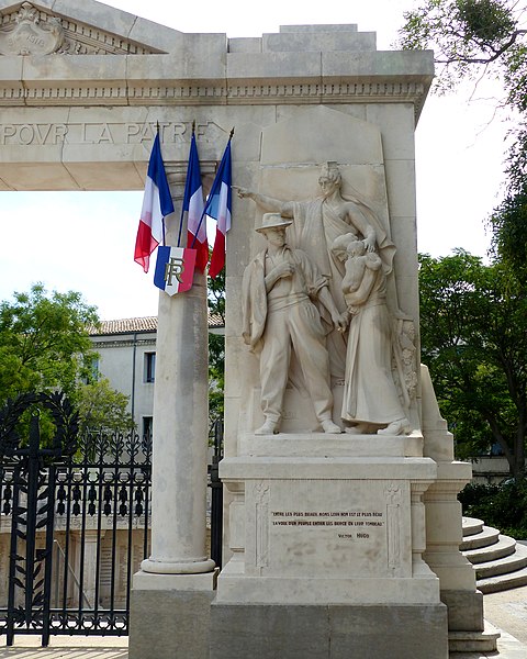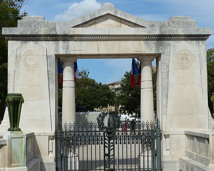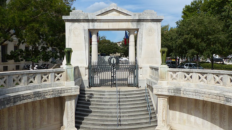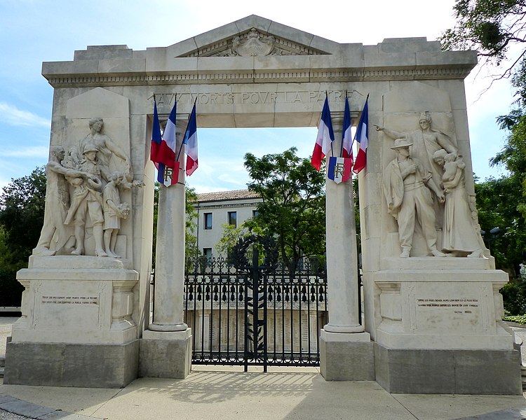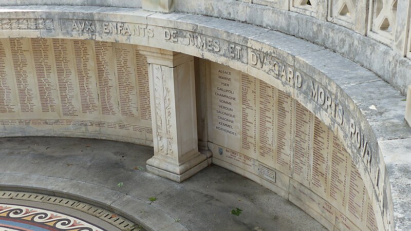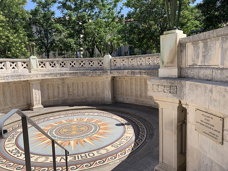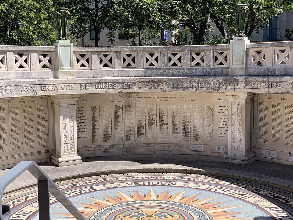 Le monument aux morts de Nîmes, dans le Gard, est consacré aux soldats de la commune morts lors des conflits du XXe siècle. Il se dresse au centre de la ville, sur le square du Onze-Novembre-1918, non loin des arènes. Il prend la forme d'une crypte à ciel ouvert, circulaire, dotée d'un portique d'entrée encadré par deux colonnes qui supportent chacune un haut-relief : à gauche la Patrie victorieuse, à droite la ville de Nîmes. Le portique est fermé par une grille en fer forgé. Le sol de la crypte est couvert d'une mosaïque qui mentionne certaines batailles de la Première Guerre mondiale. Sur le pourtour figurent les noms des soldats nîmois morts lors des conflits : 2 083 pour la Première Guerre mondiale, 2 au Levant, 210 pour la Seconde Guerre mondiale, 7 en Indochine, 54 en Algérie et 1 sur les théâtres d'opérations extérieurs. Le monument, en calcaire, mesure environ 7 mètres de hauteur. Les travaux ont débuté le 29 avril 1923 à l'emplacement d'un monument à Paul Soleillet, déplacé à cette occasion. L'architecture est due à Henri Castan et la sculpture à Auguste Carli ; le monument a été inauguré le 13 octobre 1924. Il a été inscrit au titre des monuments historiques le 18 octobre 2018 et fait partie d'un ensemble de 42 monuments aux morts de la région Occitanie protégés à cette date pour leur valeur architecturale, artistique ou historique.