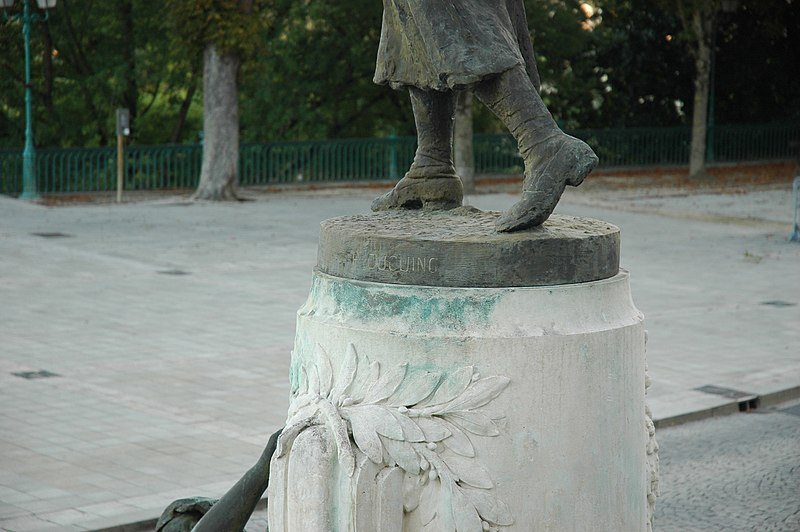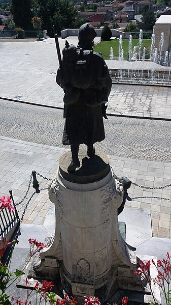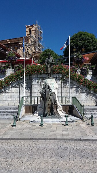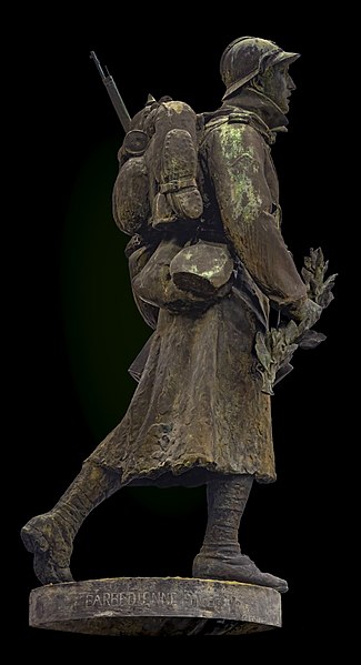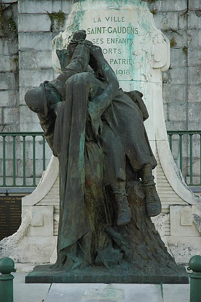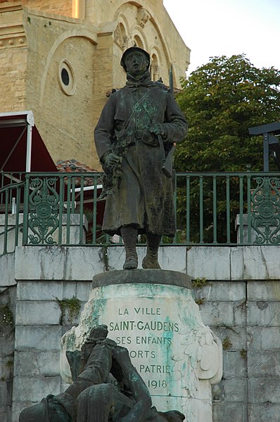 Intitulé Monument aux morts de la guerre de 1914-1918, il est consacré aux soldats de la commune morts lors des conflits du XXe siècle. Érigé légèrement au sud du centre-ville de Saint-Gaudens, il se situe en contrebas de l'escalier menant à l'esplanade de la Libération, un espace dégagé qui surplombe la plaine vers la Garonne. L’œuvre se compose d'un poilu en bronze, en uniforme et en marche, reposant sur un piédestal en pierre ; devant ce socle, une seconde statue de bronze représente une femme qui détache d'un arbre un poilu mort. Les noms des soldats de la commune morts au combat au XXe siècle sont gravés sur des plaques de bronze au revers du monument. À proximité, au centre de l'esplanade de la Libération, s'élève le monument des trois maréchaux, en mémoire de Ferdinand Foch, Joseph Joffre et Joseph Gallieni. L'ensemble est l'œuvre du sculpteur Paul Ducuing et a été réalisé par la fonderie Barbedienne. Le monument aux morts a été inscrit au titre des monuments historiques le 18 octobre 2018 et fait partie des 42 monuments aux morts de la région Occitanie protégés à cette date pour leur valeur architecturale, artistique ou historique.