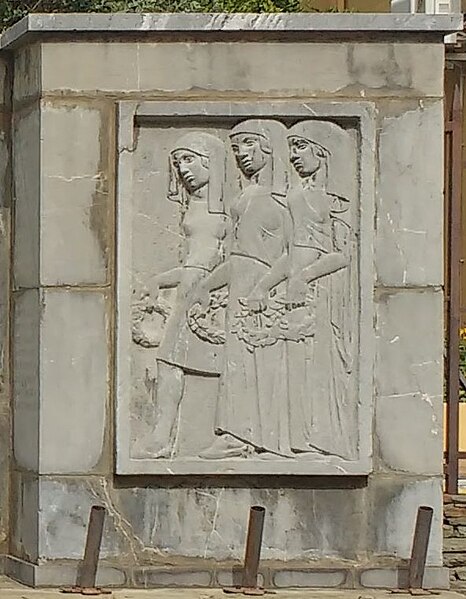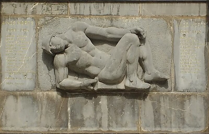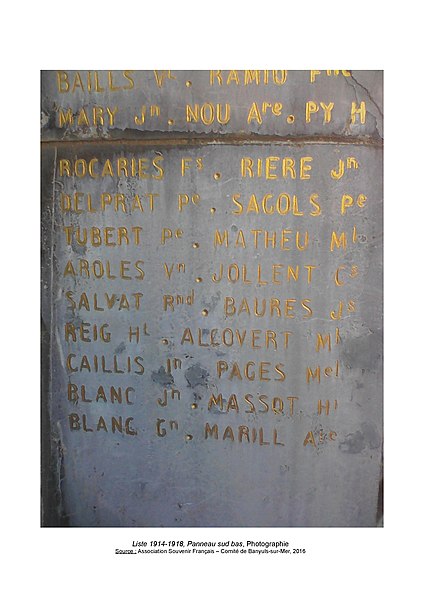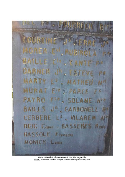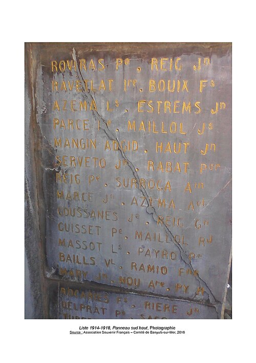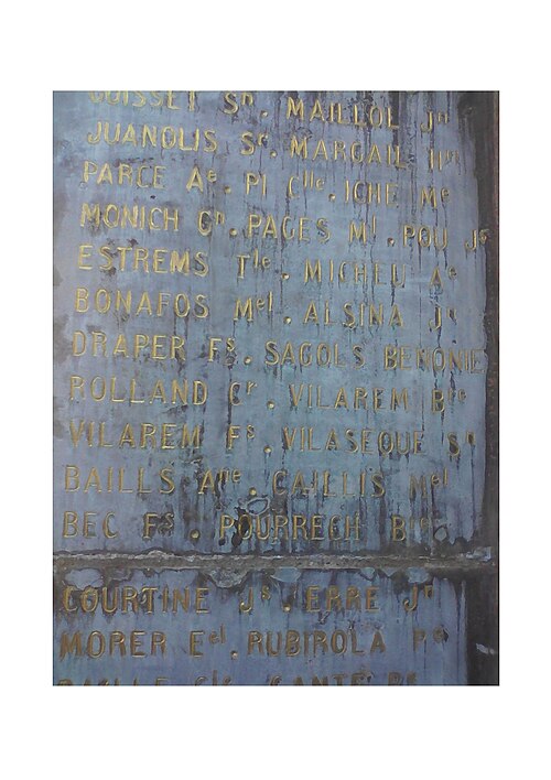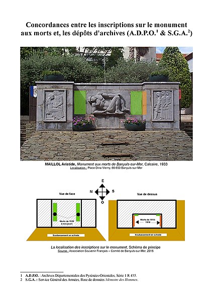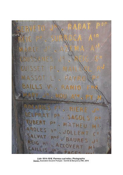 Devant la copie en bronze placée sur l'Illa Grossa une plaque porte l'inscription « Monument aux Morts Oeuvre d'ARISTIDE MAILLOL 1861 - 1944 » ; cette version ne comporte pas de noms. L'original urbain présente, autour de la figure centrale, deux plaques gravées du titre « A NOS MORTS 1939 - 1945 » accompagnées chacune d'une liste de douze noms, la plaque de gauche ajoutant après un trait trois noms avec le sous-titre AFN. Les rebords intérieurs des avancées sont inscrits : à gauche « A NOS MORTS » suivi d'une liste, à droite « 1914 - 1918 » suivi d'une autre liste, et la liste des morts de 1914-1918, complétée par seize noms oubliés lors de l'érection du monument, est également gravée sur une plaque du cimetière communal.