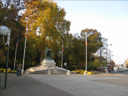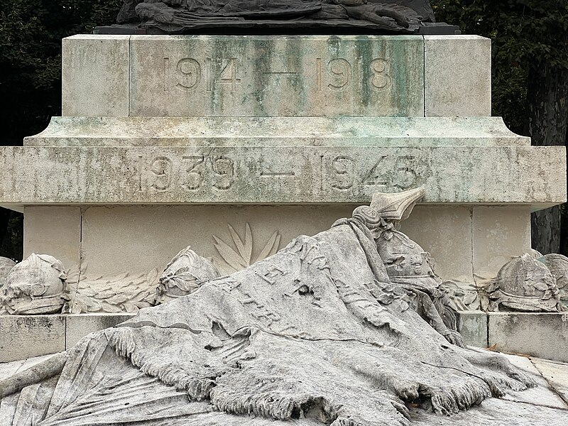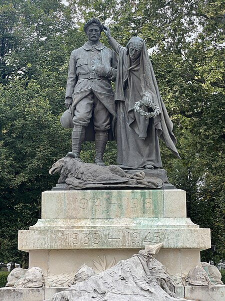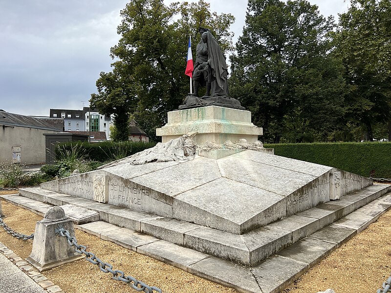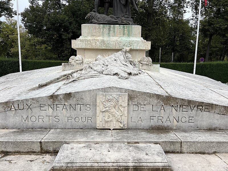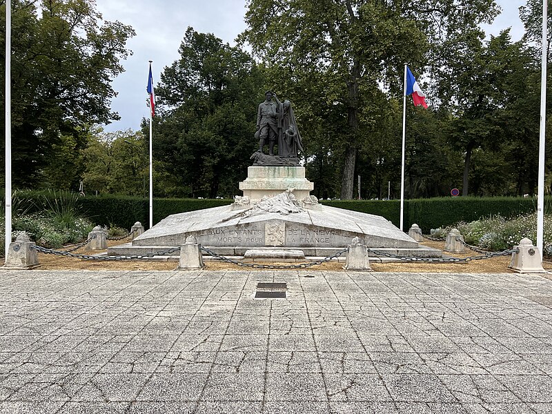 Le monument aux morts de la Nièvre comprend la statue de Marquet, un socle monumental réalisé par l'architecte Camuzat, ainsi que des bornes et des chaînes. Aux points cardinaux du socle figurent les écussons de Nevers, Cosne, Clamecy et Château-Chinon. Au sommet, le groupe de Marquet représente un poilu blessé qui piétine l'aigle allemand. À ses côtés, une femme en deuil le couronne de lauriers puis se penche pour déposer, sur la tombe des morts pour la France, une couronne du souvenir. Il pourrait s'agir d'une allégorie de la France ou de la ville de Nevers.