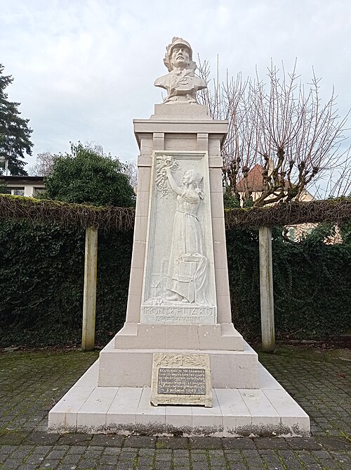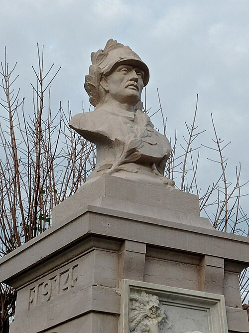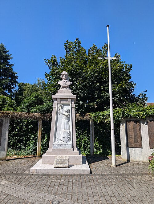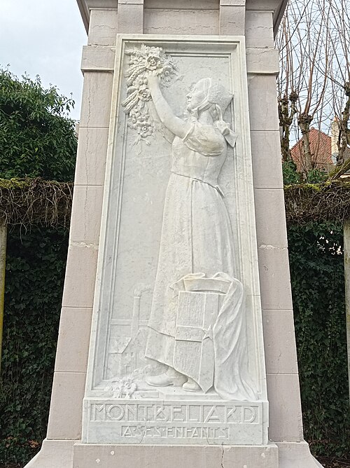 Le monument aux morts de Montbéliard honore les soldats de la commune morts lors des conflits du XXe siècle. Il se situe dans le square du Souvenir, près de la rue de Belfort, au pied du château, en centre‑ville. Il prend la forme d'un petit obélisque surmonté du buste d'un poilu, autour duquel s'enroule une branche de laurier. Sur le piédestal, une sculpture représente une « diaichotte », allégorie féminine du pays de Montbéliard, offrant fleurs et épis de blé au soldat. Les vêtements traditionnels et la représentation d'usines en arrière‑plan renvoient à l'identité locale et à l'industrialisation, notamment les usines Peugeot. Le laurier symbolise la gloire et la victoire, tandis que les fleurs et les épis évoquent la résurrection. Des branches de laurier en bronze ornent les flancs de l'obélisque; la sculpture et les gravures sont en marbre de Carrare. Une inscription sobre porte la mention « MONTBELIARD À SES ENFANTS ».