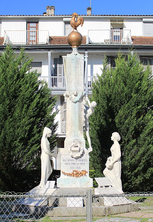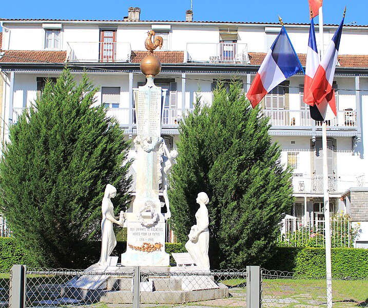 Le monument aux morts de Bagnères-de-Bigorre honore les soldats de la commune tombés lors des conflits du XXe siècle. Il occupe un petit espace vert au centre-ville, sur la place Georges-Clemenceau. L’élément principal est une colonne en marbre de Carrare surmontée d’un globe en bronze, coiffé d’un coq qui tient une branche de laurier dans son bec. Un groupe sculpté en marbre complète l’ensemble : un adolescent entoure la colonne d’une guirlande de fleurs tandis que deux femmes gravissent les marches du socle. La colonne porte quatre plaques inscrites des noms des morts de la commune. De part et d’autre se dressent les bustes en bronze de Georges Clémenceau et de Ferdinand Foch, fondus par la fonderie Louis Roques, de Toulouse, et achevés au second trimestre de 1919. La commune a commandé l’ensemble au sculpteur Joseph Gardy le 29 mars 1919 pour un montant total de 32 000 francs, dont 28 000 francs pour le monument. Les bustes furent d’abord installés sur des socles provisoires près du jet d’eau de l’allée des Coustous et inaugurés le 14 juillet 1919. En mars 1921, le monument commémoratif de la guerre de 1870 fut transféré au cimetière pour permettre l’implantation du nouvel ensemble à un angle de la place des Vigneaux ; les bustes furent alors posés sur des faisceaux d’affûts de canons prussiens, trophées de la guerre de 1870 provenant du dépôt d’artillerie de Neuf-Brisach. L’ensemble fut inauguré le 13 novembre 1921. Le monument aux morts a été inscrit au titre des monuments historiques le 18 octobre 2018 et faisait alors partie d’un ensemble de 42 monuments aux morts de la région Occitanie protégés pour leur valeur architecturale, artistique ou historique.