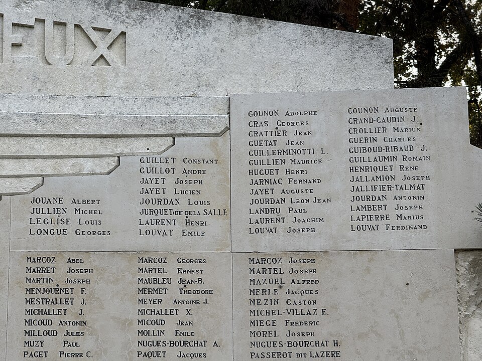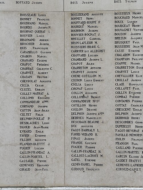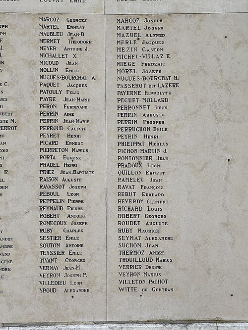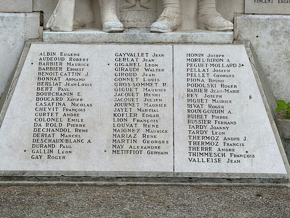En août 1888, le conseil municipal vote un premier financement pour élever un monument à la Défense nationale destiné à perpétuer la mémoire des soldats morts pendant la guerre de 1870-1871. Le projet est régulièrement évoqué jusqu'en 1912 sans aboutir, puis reprend après la Première Guerre mondiale : en novembre 1919 la Ville lance une souscription et un comité est constitué en mars 1920. En 1922, le site retenu est le « jardin de Ville », l'ancien parc arboré de la demeure léguée à la Ville en 1920 par Marie-Thérèse Castelbon, veuve Becquart, avec sa villa. Le concours aboutit au choix du sculpteur lauréat, Gaston Dintrat, approuvé par la préfecture de l'Isère le 18 septembre 1923. La commune opte pour un monument original, se distinguant par sa sévérité et l'aspect frontal de la représentation, conçu pour s'inscrire dans l'espace arboré du parc. L'élévation porte sur son socle l'inscription « Guerres 1870 1914-1918 » et comprend un mobile de 1870, témoignant de la volonté municipale d'ériger un monument aux guerres et non uniquement à la « Grande Guerre ». Cette inscription a disparu sous une plaque nominative, mais le garde national de 1870 est figuré sur le même plan que le poilu, caractéristique rare de ce monument double. Le monument est réalisé rapidement et inauguré le 12 octobre 1924.