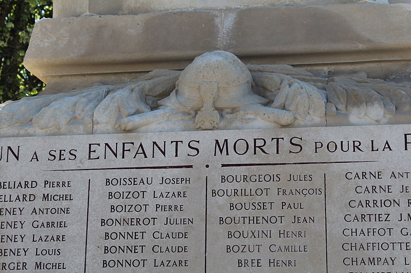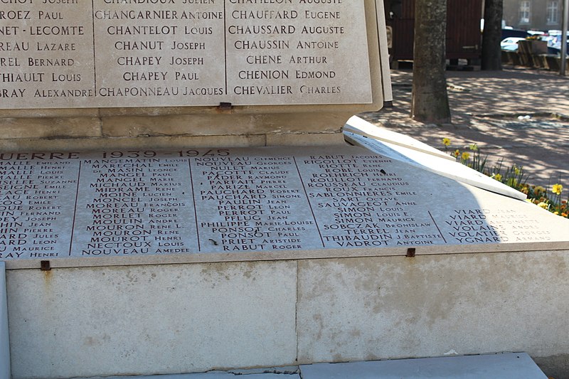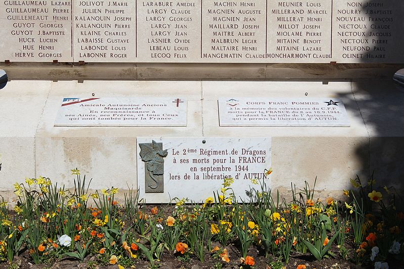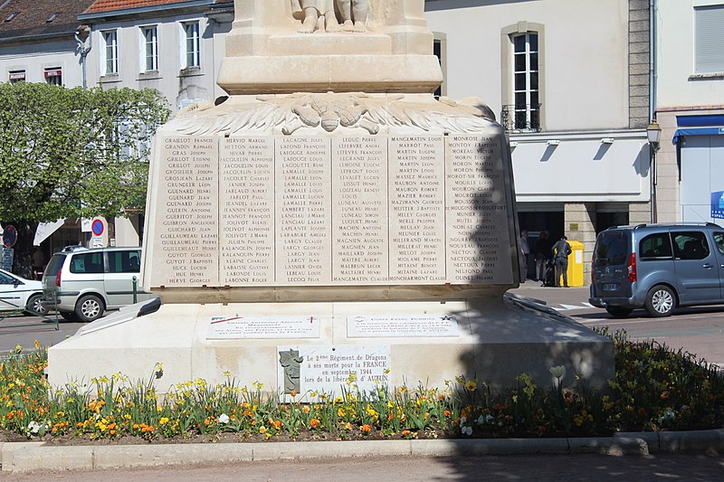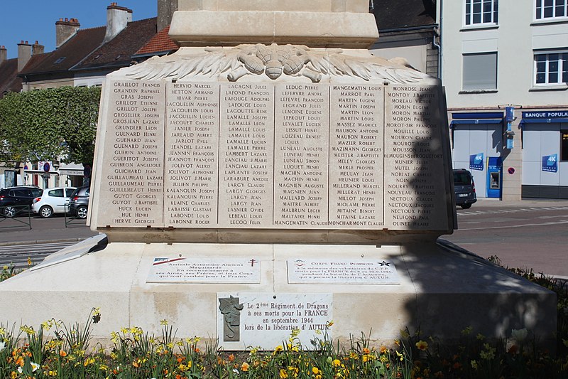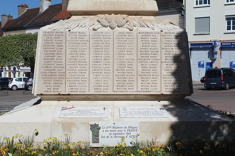 À Autun, le monument aux morts est un monument commémoratif situé en Saône-et-Loire, érigé en 1923 par l'architecte Claudius Malord et le sculpteur Alfred Jean Halou. Il commémore les citoyens autunois morts lors de la Première Guerre mondiale et a été inscrit au titre des monuments historiques en 2016. Le conseil municipal a décidé l'érection du monument le 13 juillet 1919 et a choisi son emplacement, place du Champ-de-Mars, le 8 août 1920. Le projet d'Alfred Jean Halou a été voté par un comité à 26 voix sur 43 et approuvé par le conseil municipal, qui a alloué un devis de 108 000 francs ; la réalisation a coûté au total 140 000 francs. La construction s'est achevée en septembre 1923 et l'inauguration a eu lieu le 2 décembre suivant, présidée par le ministre Léon Bérard. La même année, le modèle en plâtre a été exposé au Salon d'automne de Paris. À l'origine, le monument porte les noms des morts autunois de la Première Guerre mondiale ; y ont été ajoutés par la suite ceux de la Seconde Guerre mondiale, de la guerre d'Indochine et de la guerre d'Algérie. Il est protégé dans son intégralité, aménagements compris.