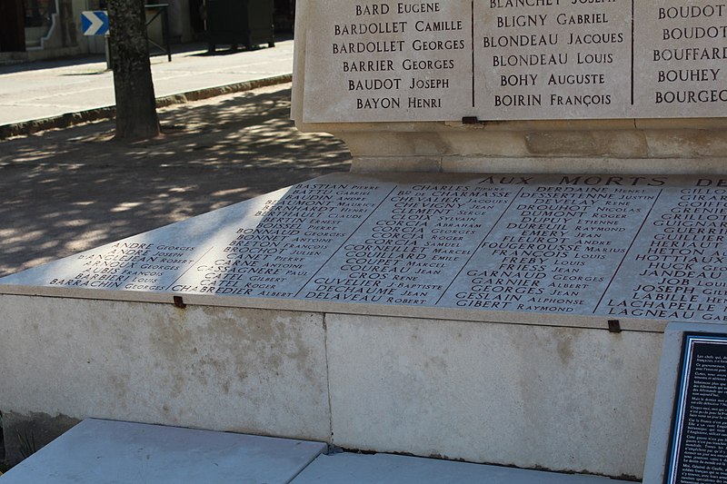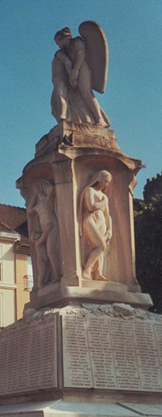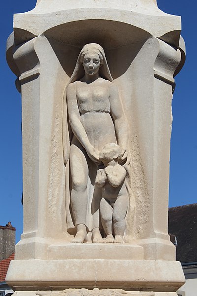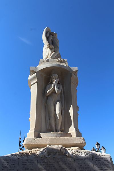 Le monument est réalisé en calcaire : sur le piédestal, à ses quatre faces, figurent des femmes veuves en pleurs accompagnées de leur enfant orphelin, et, au sommet, une figure de la Victoire soutient un homme mourant. Le monument porte également le début de la liste des poilus morts.