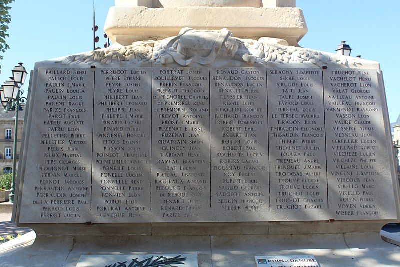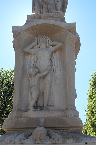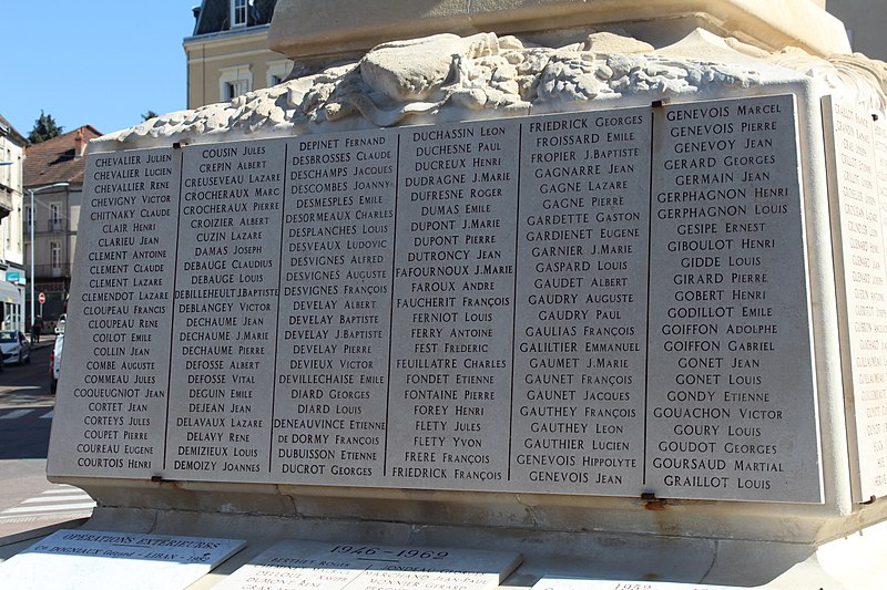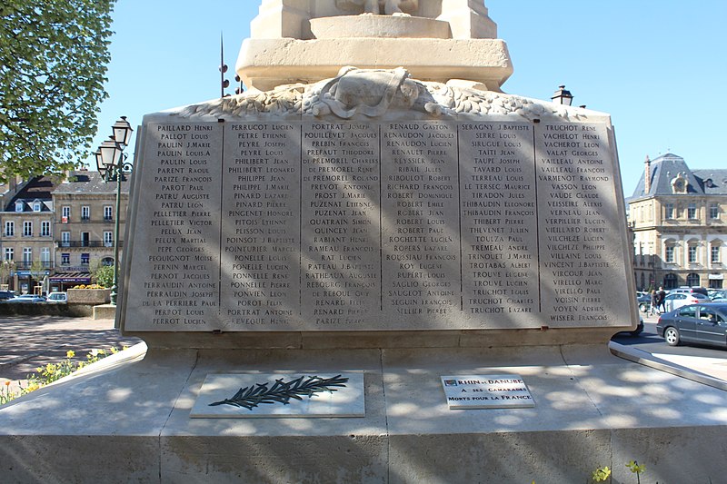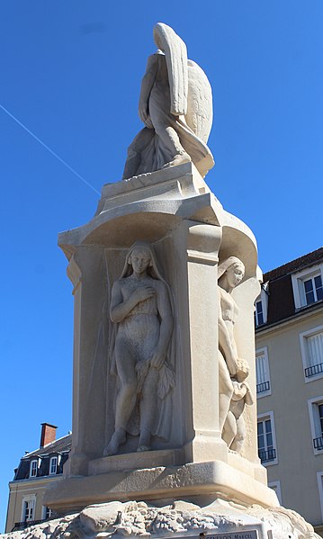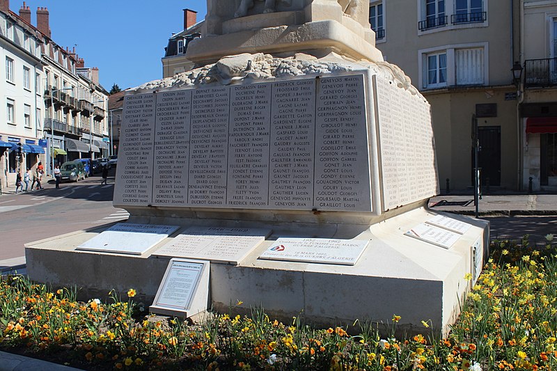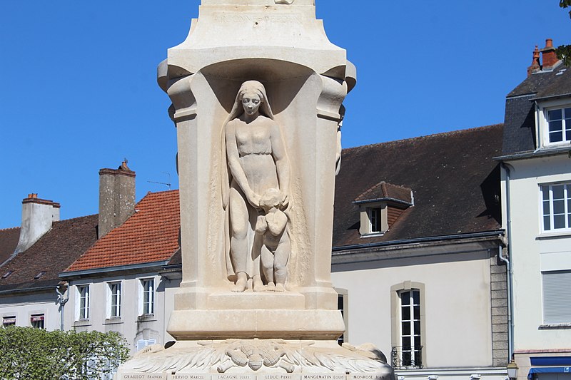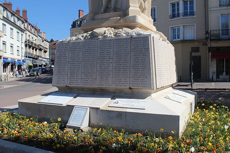 Le groupe sculpté de Nevers représente un poilu blessé soutenu par une figure féminine en deuil qui le couronne de lauriers et pose une autre couronne aux soldats morts au combat. Les armes de Nevers, Cosne-sur-Loire, Clamecy et Château-Chinon ornent le socle. Conçu dès l'origine comme monument aux morts départemental, il conserve cette destination.
