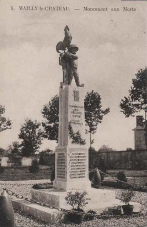 Le monument aux morts de Mailly-le-Château se dresse place du Champ-de-Mars, dans un jardin public au 2 rue de la République, dans l'Yonne. Il s'inscrit dans la série des "enfants soldats" que le sculpteur Max Blondat réalise à partir de 1916 ; Blondat s'est fait connaître comme sculpteur de l'enfance après le succès de sa fontaine Jeunesse présentée au Salon de 1904. En janvier 1920, le conseil municipal décide d'ériger un monument et lance une souscription ; la municipalité organise un concours pour l'attribution de la commande et le maire de l'époque, Léon Blondat, contacte son cousin Max Blondat, qui propose la maquette présentée au Salon de la Société des Artistes Français en 1921. La statue représente un bambin casqué portant un globe surmonté d'un coq. Quatre obus français de 270 mm, reliés par une chaîne et issus du dépôt de munitions de Chemilly-sur-Yonne, entourent la composition. Le monument est inauguré le 22 juillet 1923, après un an de travaux. L'ensemble a été inscrit le 1er août 2016 et l'édifice classé en septembre 2020.