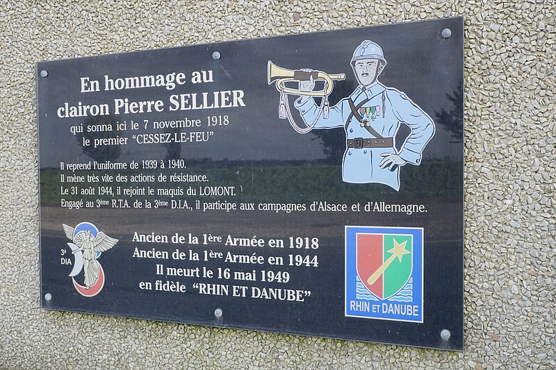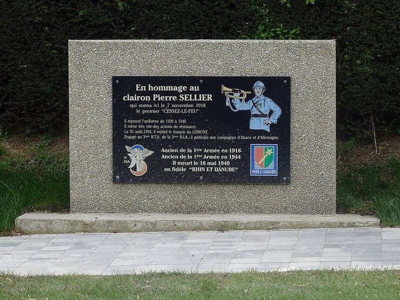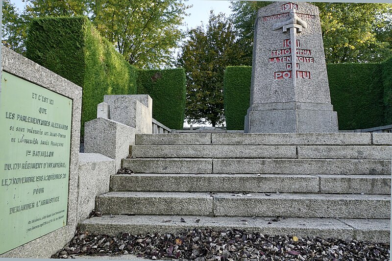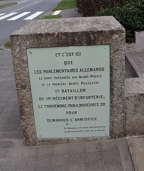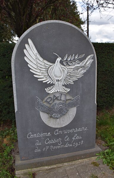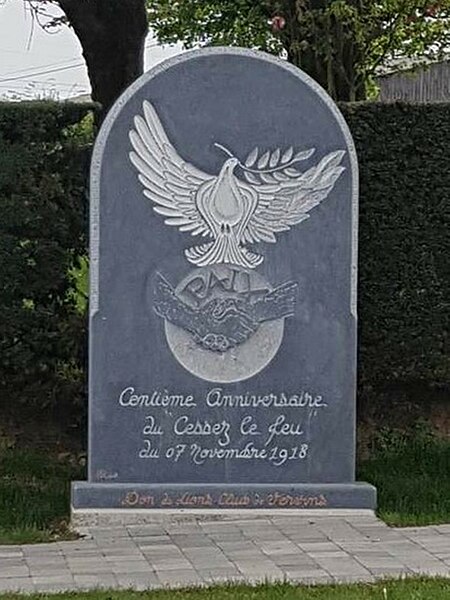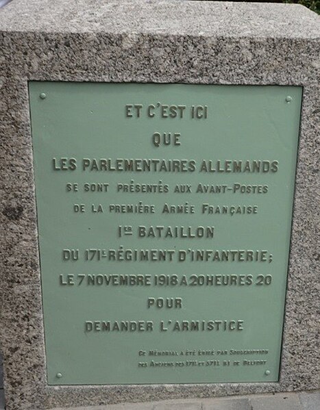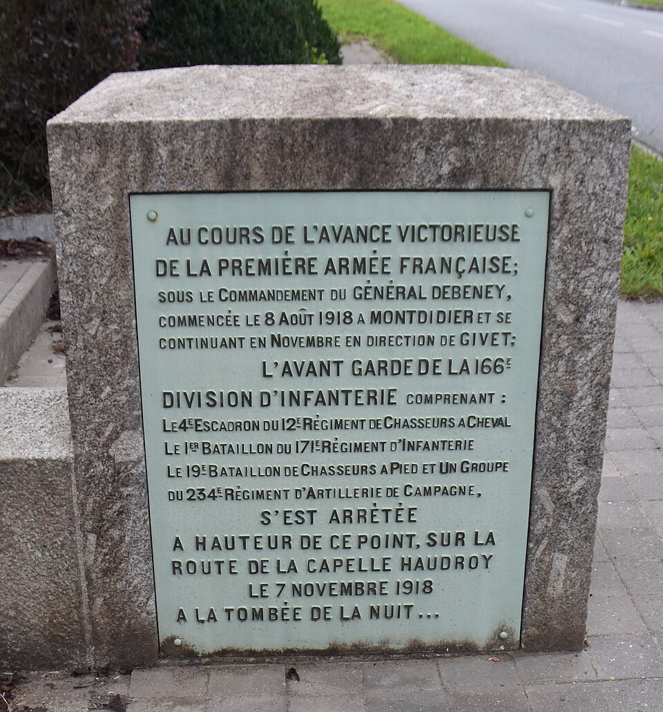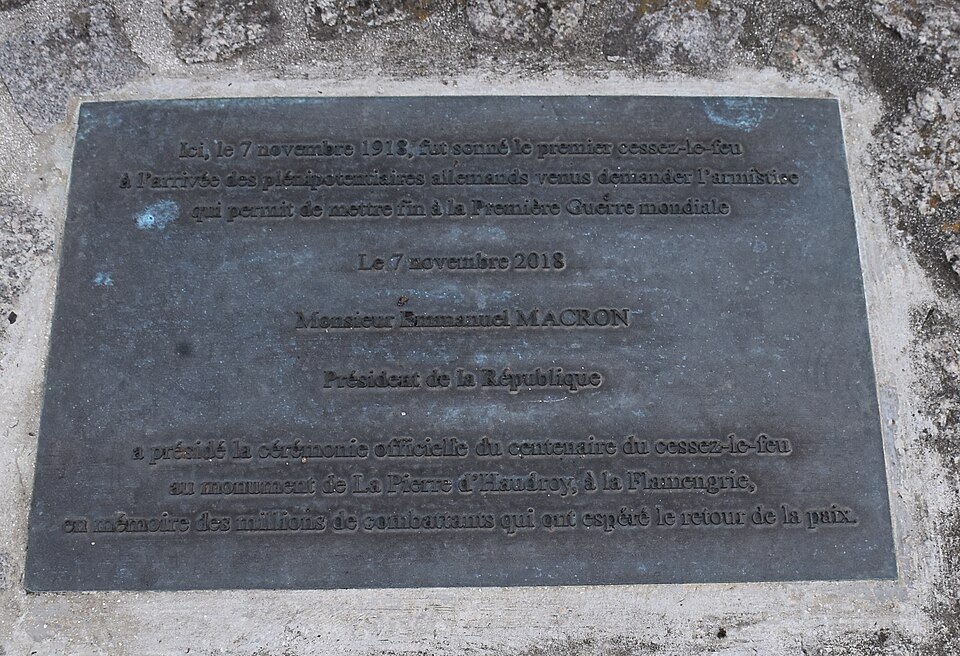 Le monument de la Pierre d'Haudroy se situe à La Flamengrie (Aisne), au bord de la D285, entre La Capelle et Haudroy, sur la route reliant Wignehies à La Capelle. Il marque l'endroit précis où, le 7 novembre 1918 à 20 h 20, arrivèrent les voitures transportant les plénipotentiaires allemands venus recevoir les conditions de l'armistice. Le capitaine Lhuillier, commandant alors le 1er bataillon du 171e régiment d'infanterie, reçut ces plénipotentiaires ; il demanda au caporal-clarion Pierre Sellier de sonner le « cessez-le-feu », suivi du « garde à vous », geste qui ouvrit les négociations et symbolisa la fin des hostilités. Jusqu'à sa mort en 1948, Pierre Sellier sonna chaque année sur place le « cessez-le-feu » en mémoire de cet événement. Érigé en granit des Vosges en 1925, le monument comportait une inscription portant la date et l'heure de l'arrivée des plénipotentiaires ainsi que la mention : « 1918 - 7 novembre - 20 heures 20 - Ici triompha la ténacité du poilu. » Une plaque rappelle en outre qu'il fut élevé par souscription publique à l'initiative de l'UNC et du comité AC 1914-18 de la Pierre d'Haudroy, présidé par A. Daublain, et mentionne que c'est en cet endroit que le clairon Sellier sonna le cessez-le-feu. Dynamité par les Allemands le 14 août 1940, le monument fut reconstruit sous l'égide d'un comité présidé depuis 1946 par le colonel G. Hestre, avec le concours de M. P. Schneiter, secrétaire d'État. Conçu par l'architecte Louis Rey, le nouveau monument fut inauguré le 14 novembre 1948. Lors de la reconstruction, une pierre centrale apportée par Ernest Gernez du chantier de Ravensbrück fut intégrée au monument ; quelques vestiges de la pierre originelle détruite en 1940 subsistent en retrait. Le site est inscrit au titre des Monuments historiques depuis 1997.