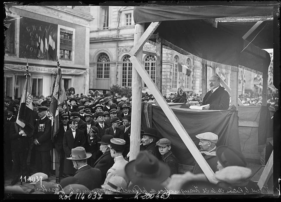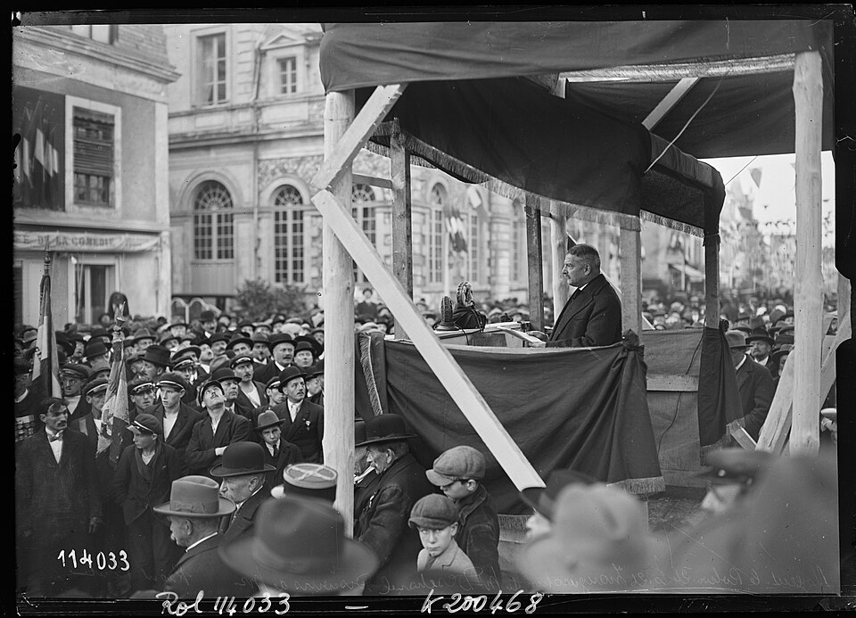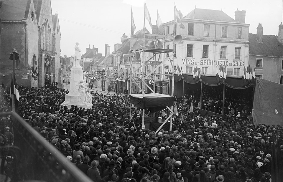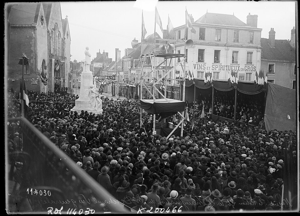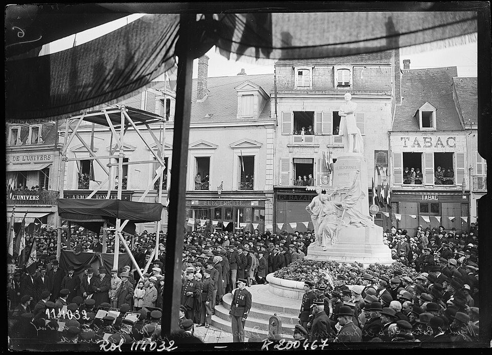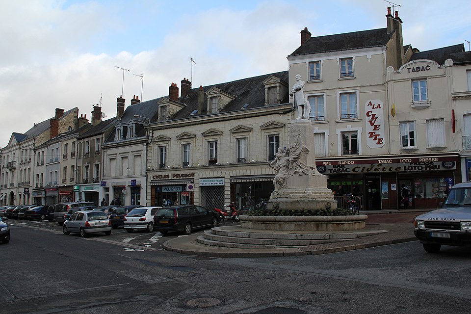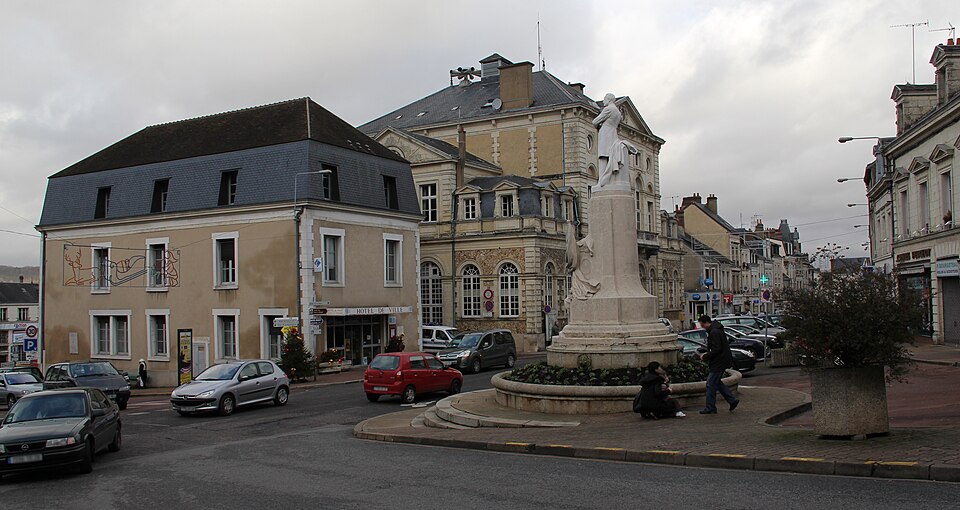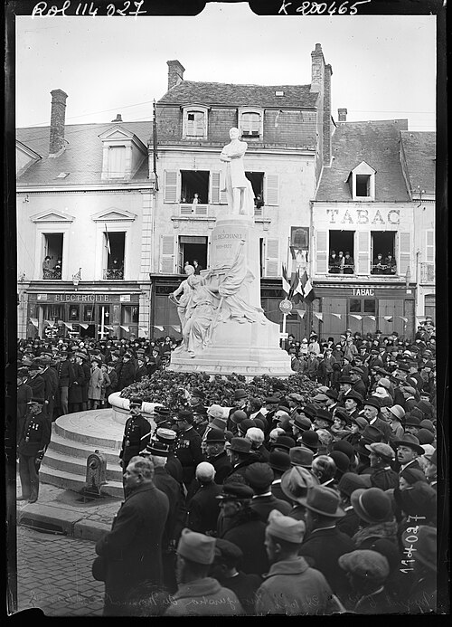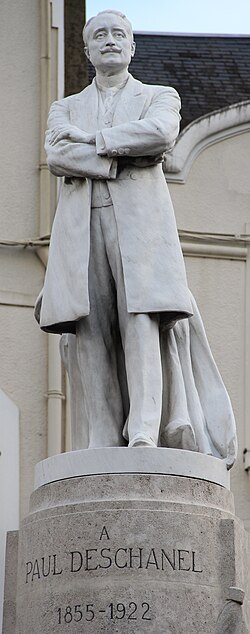 La statue en pied de Paul Deschanel (1855-1922) se dresse au sommet d'un piédestal orné d'un groupe de deux figures allégoriques, la France et l'Éloquence, drapées à l'antique, à la jonction de la rue Sully et de la rue Villette-Gâté, face à l'hôtel de ville. La souscription publique est lancée en 1925 par le Comité du Monument Paul Deschanel, constitué d'un comité local et d'un comité d'honneur réunissant Gaston Doumergue, président de la République ; M. de Selves, président du Sénat ; Raymond Poincaré, alors premier ministre ; et le maréchal Pétain. La ville décide, le 14 février 1925, d'accorder 4 000 francs au Comité « désirant associer la Ville à l'hommage qui doit être rendu à la mémoire de celui qui fut pendant plus de trente ans le représentant de la Ville et de l'arrondissement de Nogent-le-Rotrou au Parlement et qui fut élevé à la suprême magistrature de chef de l'État ». Le monument, en pierre pour le socle et en marbre pour la statue, est inauguré le 24 octobre 1926 lors d'une cérémonie organisée par la municipalité (DM 4 octobre 1926). Contrairement à de nombreux monuments de la région, il a conservé son emplacement d'origine et son emmarchement. Sa position, dominante mais insérée dans un contexte urbain contraint — dénivelé important de la rue Sully, croisement de la rue Villette-Gâté puis nouvelle pente descendante vers la place du marché — gêne toutefois sa lisibilité : la statue est difficilement perceptible depuis le trottoir ou de loin. L'œuvre est signée par le sculpteur Ernest Dubois (1863-1930) et par l'architecte René Patouillard-Demoriane (1869-1957) pour le socle, et répond à la volonté du Comité de rendre hommage au grand homme politique et à son engagement pour le département d'Eure-et-Loir. La figure de Deschanel, solidement campée sur ses jambes, est tournée vers la mairie qui fait face au monument. Les signatures des deux auteurs figurent à la base du piédestal : « ERNEST DUBOIS STATUAIRE/ PATOUILLARD DE MORIANE ARCH ». Les deux auteurs avaient déjà collaboré à deux monuments pour la ville de La Rochelle, à la mémoire d'Eugène Fromentin en 1905 et à celui de Jean Gulton, érigé en 1911.