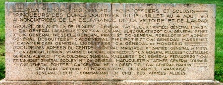 Le monument dit des Fantômes, érigé sur la butte de Chalmont à Oulchy-le-Château, commémore la deuxième victoire de la Marne et le rôle décisif du Tardenois lors de l'été 1918. Conçu et exécuté par le sculpteur Paul Landowski, il domine les coteaux et la plaine où s'est développée l'offensive lancée par Mangin. La composition associe une statue de La France, en granit et haute de huit mètres, un emmarchement monumental à quatre paliers symbolisant les quatre années de guerre, puis, au sommet de la butte, le groupe lié en granit intitulé Les Fantômes, lui aussi haut d’environ huit mètres. Le groupe sommitale comprend huit personnages aux yeux clos : il est généralement décrit comme composé de sept combattants représentant différentes armes et d’un jeune homme nu, martyr protégé par ses aînés ; les représentations recensées incluent notamment une jeune recrue, un sapeur, un mitrailleur, un grenadier, un soldat colonial, un fantassin et un aviateur. Les Fantômes figurent les victimes et les camarades disparus qui veillent sur la plaine apaisée. À l’entrée, la statue de La France, portant un bouclier, annonce le lieu et symbolise la victoire et l’espoir ; elle est encadrée de part et d’autre par deux stèles gravées qui retracent les combats de juillet 1918, la contre-offensive alliée et ses résultats. La réalisation du projet remonte à une commande d’État reçue par Landowski en novembre 1919 pour un projet en plâtre nommé Les Morts ; le groupe en granit obtint une médaille d’honneur au Salon des artistes français en 1923 et la commande officielle fut passée en juillet 1926. Plusieurs localisations furent étudiées, dont Verdun et l’ossuaire de Douaumont, avant que les Anciens Combattants ne choisissent la butte de Chalmont. La construction, financée par une souscription nationale, aboutit à un monument classé au titre des monuments historiques en 1934, avant son achèvement, et la sculpture Les Fantômes fait l’objet d’un classement depuis le 31 juillet 1934. Le monument fut inauguré solennellement le 21 juillet 1935 par le président de la République, Albert Lebrun. Il s’élève à près de 155 mètres d’altitude et rappelle la mémoire des soldats morts ou disparus pendant la seconde bataille de la Marne.