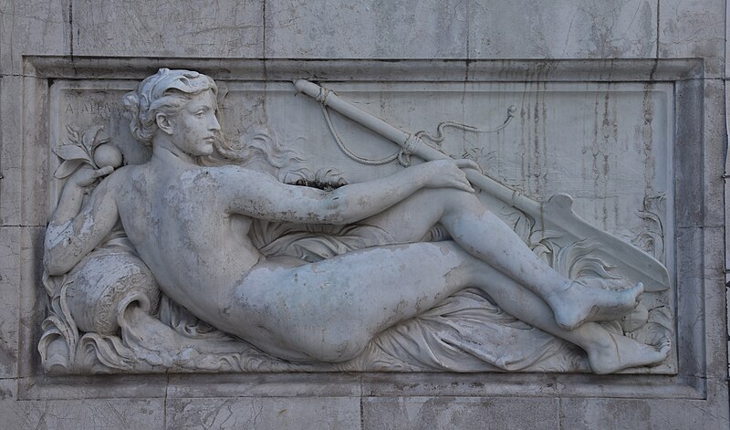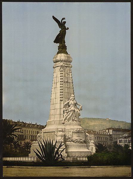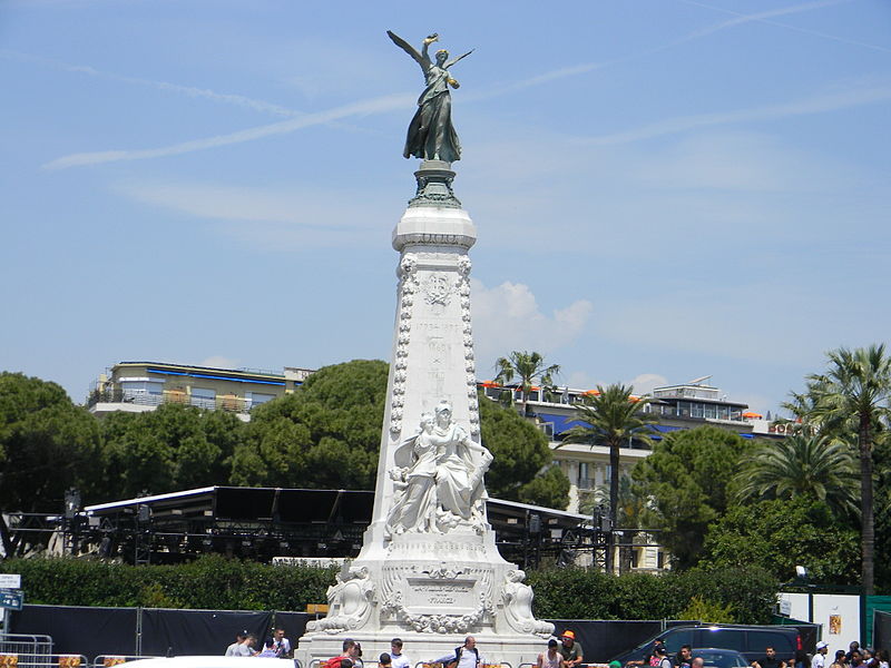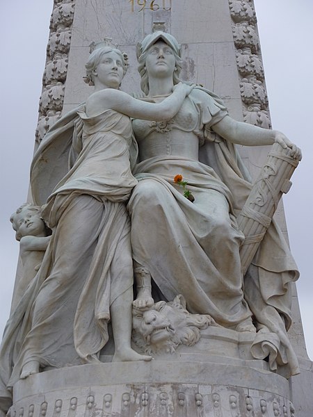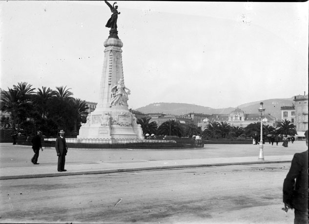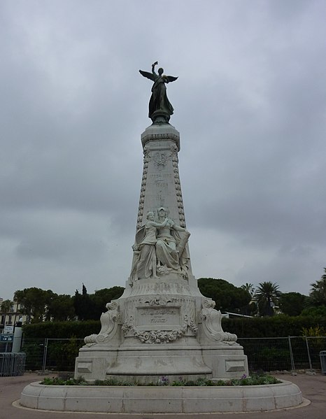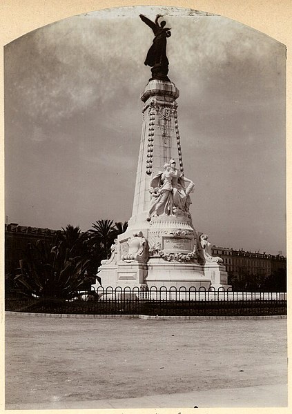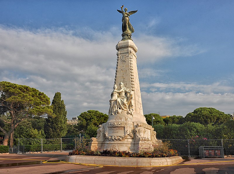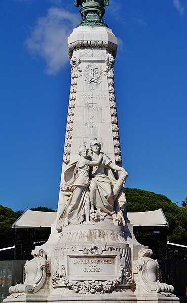 L’ensemble se présente comme une pyramide très effilée, assimilable à un obélisque, reposant sur une base ornée d’un bas‑relief représentant la Méditerranée. Adossé à cette élévation, le groupe principal en marbre blanc figure l’allégorie de Nice se donnant à la France : une jeune fille embrasse une femme tenant un faisceau. La France est représentée casquée et vêtue, sans bonnet phrygien ni sein dénudé ; son allure calme suggère une république modérée, prudente et légaliste, à la fois maternelle et pacificatrice.