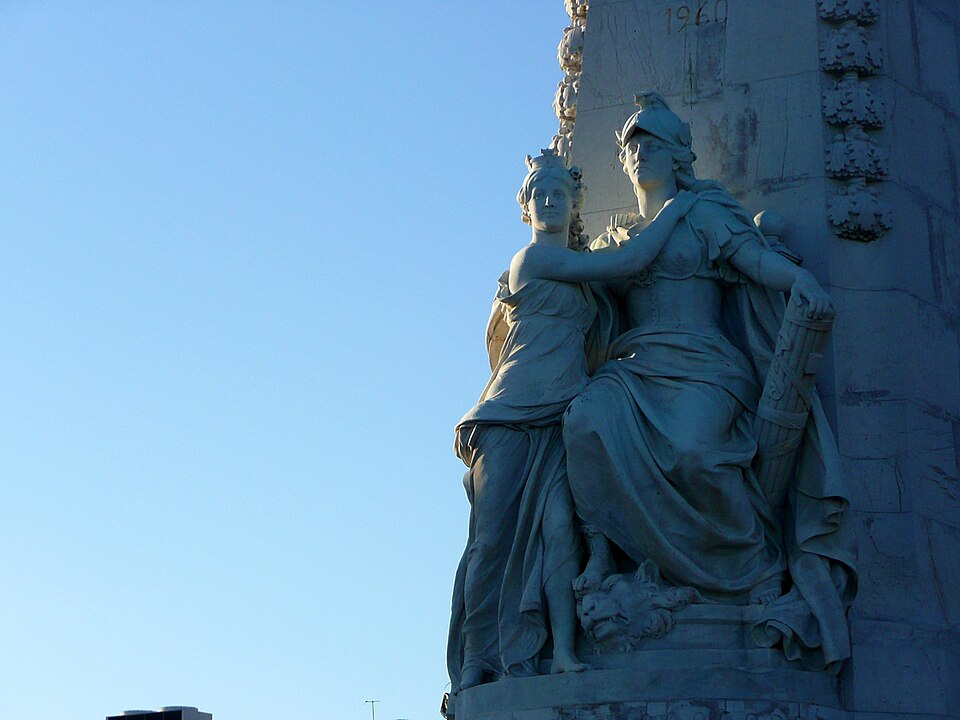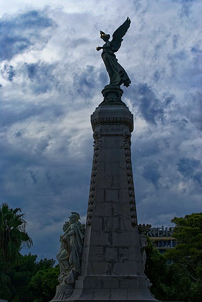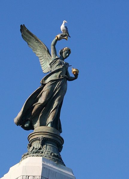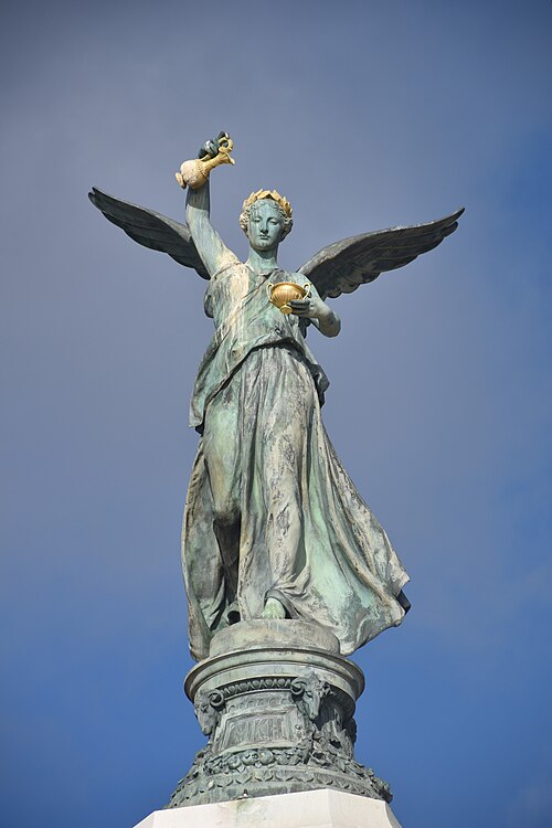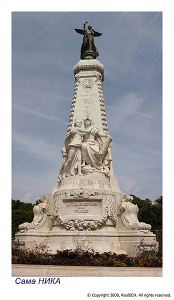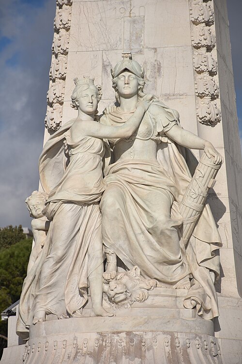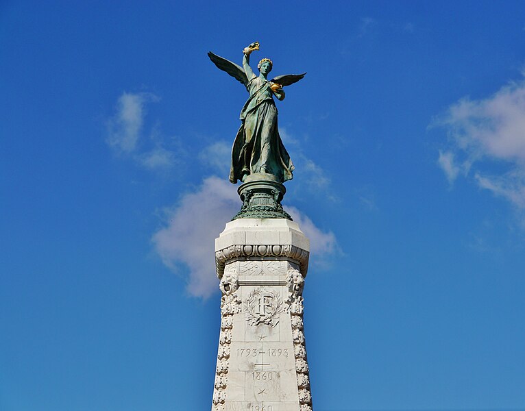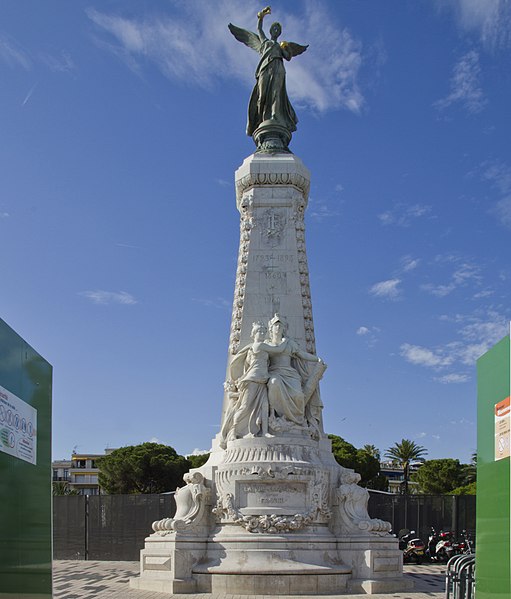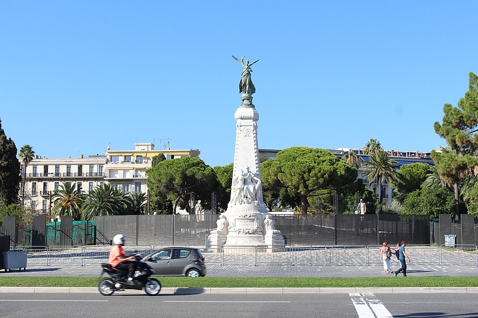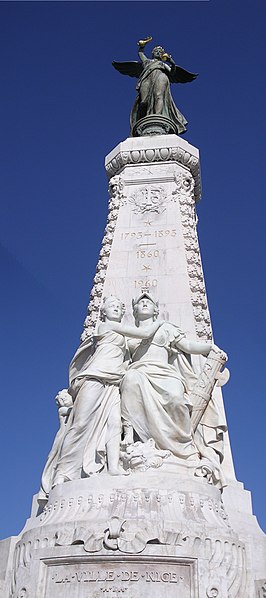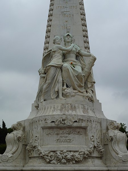 Au sommet, une Victoire ailée en bronze, enveloppée d’un drapeau tricolore, prête serment de fidélité, allusion à la devise municipale « Nissa fidelissima ». La jeune femme symbolisant Nice porte une coiffure en forme de murailles, reprise d’une iconographie médiévale et pouvant renvoyer, selon l’interprétation, à la dédition de 1388 aux comtes de Savoie, de sorte que la réunion de 1793 est présentée comme une nouvelle dédition, cette fois à la France. Les armes de la ville sont sculptées au centre du soubassement et l’arrière porte la représentation de la Méditerranée.