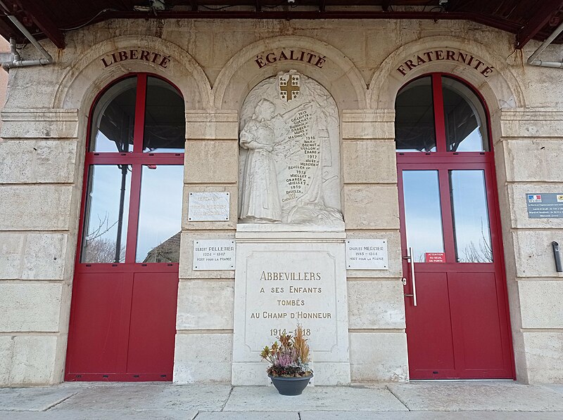 Dans le village alors profondément rural et protestant d'Abbévillers, le conseil municipal décide en 1919 d'élever un monument pour commémorer les 18 habitants morts pendant la Grande Guerre. Le monument, initialement prévu pour être placé sur la façade de la mairie et encastré dans la porte du milieu, se situe aujourd'hui sous le porche de la mairie, au 35 Grande Rue, et est intégré au mur du bâtiment. La mairie-école, reconstruite entre 1877 et 1901 par l'architecte de Montbéliard Jean Frédéric Jules Fallot, avait été achevée peu avant l'installation du monument, et le choix du sculpteur et de l'emplacement aurait pu être influencé par Julie Vergon, institutrice et cousine germaine d'Armand Bloch. La commune retient Armand Bloch pour la réalisation ; le devis s'élève à 11 700 francs et le contrat est signé le 14 février 1920. L'œuvre est achevée et inaugurée en 1921. Le monument, qui figure aujourd'hui parmi ceux commémorant les soldats de la commune morts lors des conflits du XXe siècle, est un moyen-relief en marbre blanc logé dans un arc cintré. Il représente la silhouette d'une jeune fille vêtue de l'habit traditionnel local, dite "diaichotte", accompagnée des armoiries de la ville ; la figure tient une branche de laurier dans la main droite, et une gerbe ainsi qu'une charrue sont sculptées au pied, rappelant la vocation agricole de la commune. Une inscription porte la dédicace : « ABBEVILLERS À SES ENFANTS TOMBÉS AU CHAMP D'HONNEUR 1914-1918 ». Armand Bloch, né à Montbéliard dans une famille de sculpteurs de monuments funéraires, s'était installé à Paris en 1882 dans l'atelier d'Alexandre Falguière et, malgré un parcours de formation interrompu vers 1885, reçoit de nombreuses commandes, expose aux Salons et réalise de nombreux monuments et bustes. Après la Première Guerre mondiale, il est largement sollicité par les communes autour de Montbéliard et exécute notamment onze monuments commémoratifs entre 1919 et 1924, dont celui d'Abbévillers.