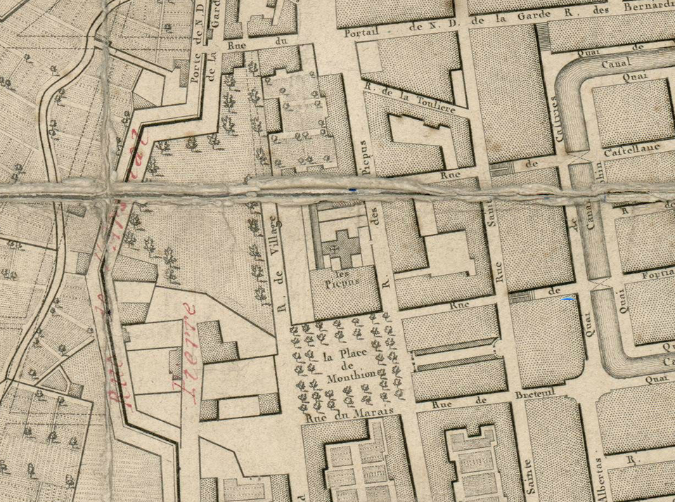 Un cimetière musulman existait dès la fin du XVIIe siècle près du carrefour de la rue Sainte et de la rue de la Paix Marcel Paul, puis fut transféré entre 1723 et 1725 sur un terrain de 540 toises carrées acquis et entouré de murailles par la confrérie de la Rédemption des captifs, à l'intérieur du pâté de maisons entre le cours Pierre-Puget et la rue Roux de Brignoles, au sud de la place Monthyon. Selon une lettre de l'intendant de marine François-Noël Laurent Levasseur de Villeblanche datée du 16 décembre 1749, cet espace comprenait « une mosquée, un puits, un hangar pour leurs dévotions funèbres et un local destiné à la chaux et outils nécessaires aux inhumations des Turcs ». Jean-Baptiste Grosson notait en 1777 la présence, au fond du cimetière, d'un petit édifice où les esclaves turcs prenaient part à des prières certains jours. Vers 1792, l'ensemble cultuel fut progressivement occupé par l'arsenal d'artillerie, malgré une décision du conseil municipal visant à restituer l'ancien cimetière.