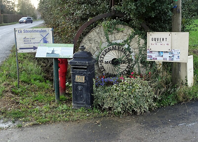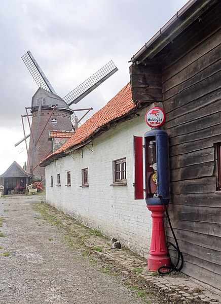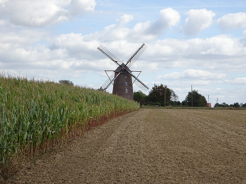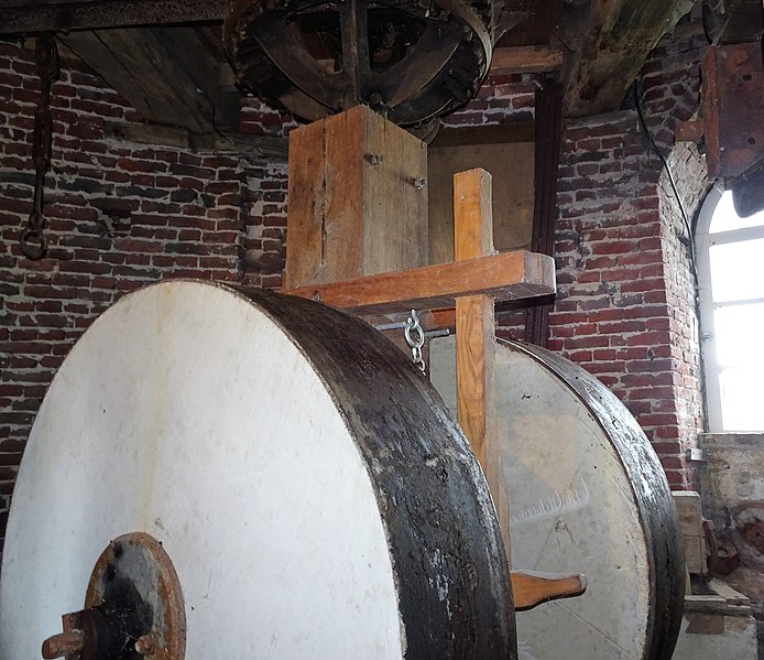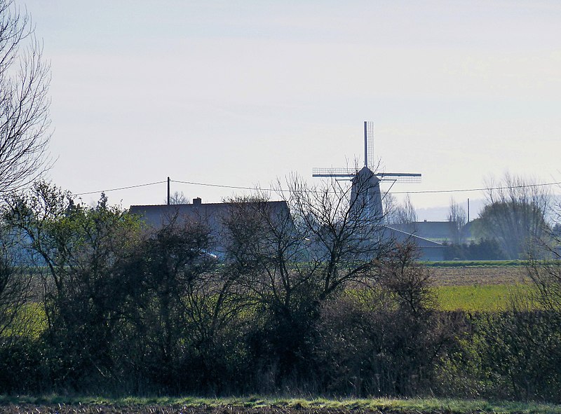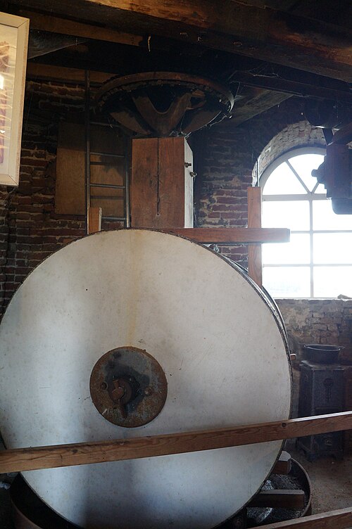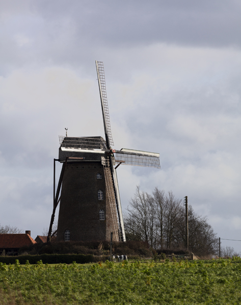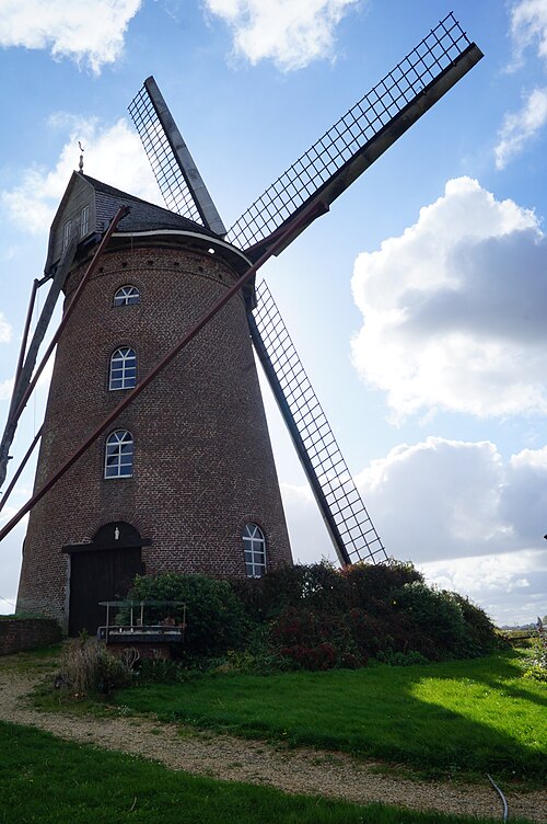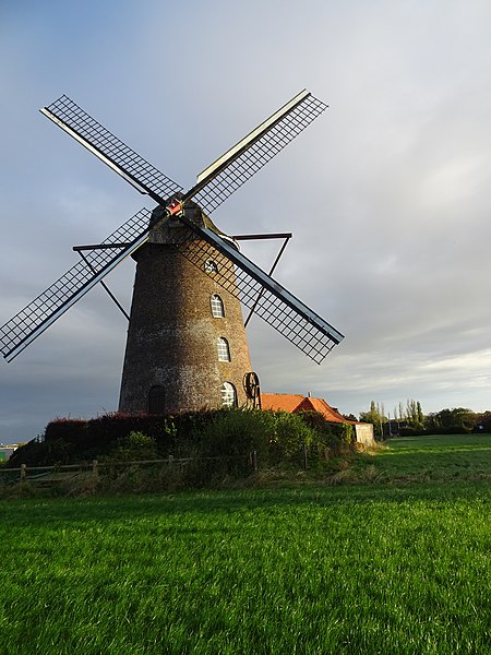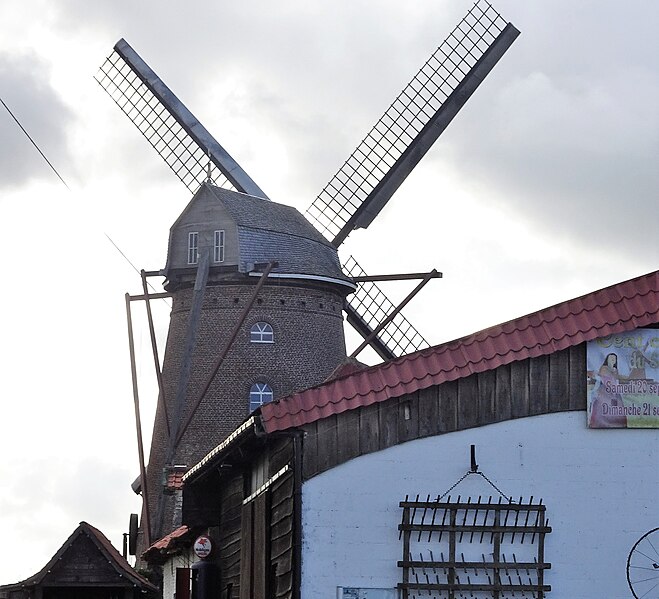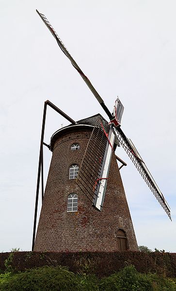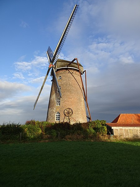 Édifié en 1864, le moulin tour tronconique en brique traduit par sa forme et son matériau l'un des ultimes efforts de captation de l'énergie éolienne, au moment où l'énergie thermique et le charbon à bon marché s'imposaient aux activités autres que meunières. Juché sur une motte, il est équipé d'ailes à traverses d'une envergure de 24 mètres ; relativement archaïque, ses ailes sont soumises à l'entoilage. Son intérêt réside dans le procédé flamand de queue à double chevron : un des chevrons, plus large que le tronc du moulin, déborde celui-ci et, par une barre transversale, entraîne en deux points la calotte et les ailes. La lourdeur de manipulation du corps de la queue est résolue par un chariot d'entraînement à roue dentée circulant sur un monorail à crémaillère. Remplaçant un moulin pivot, il servit d'abord de tordoir à huile puis fut équipé de deux paires de meules entraînées par l'engrenage classique en bois, dont le grand rouet est pourvu d'un frein. Restauré et entretenu, ce moulin peut être mis en rotation pour des démonstrations.