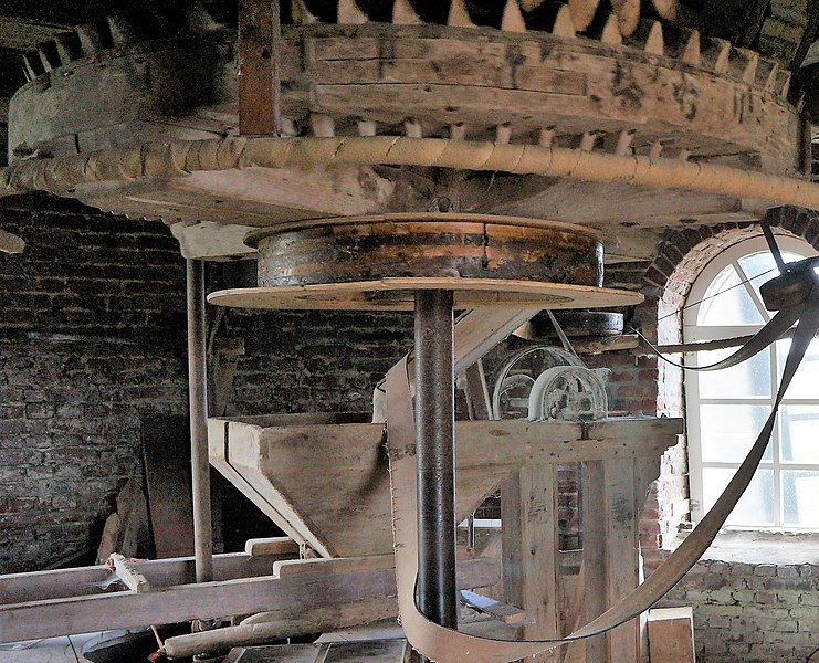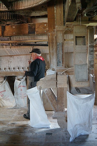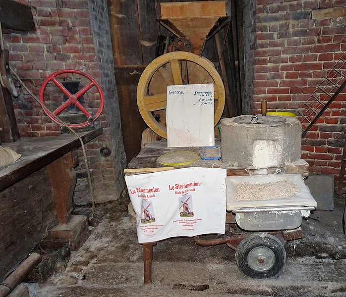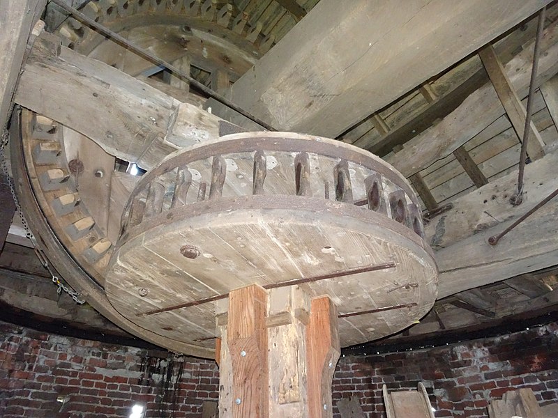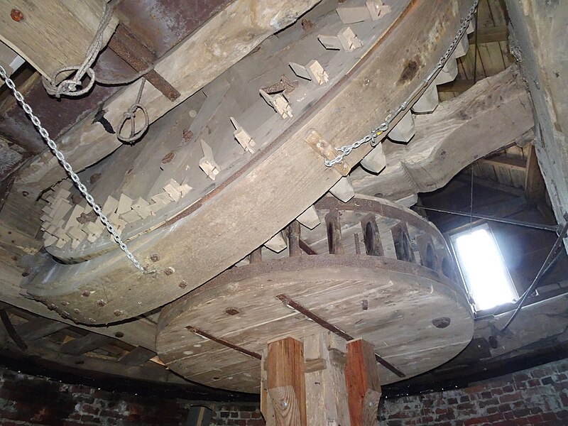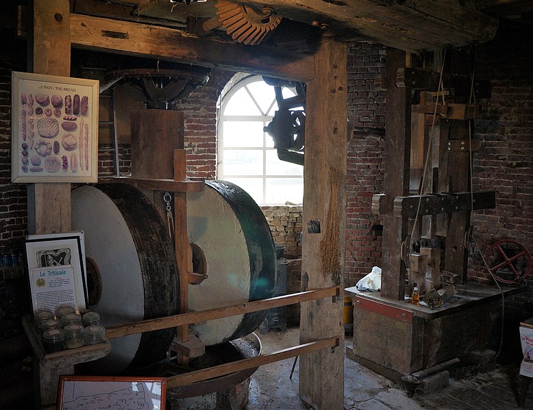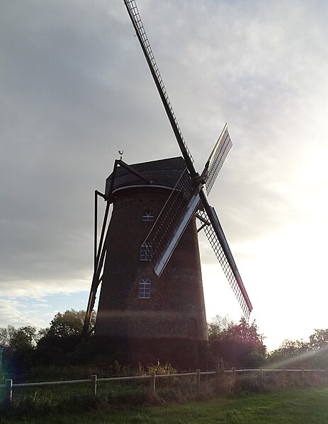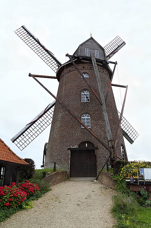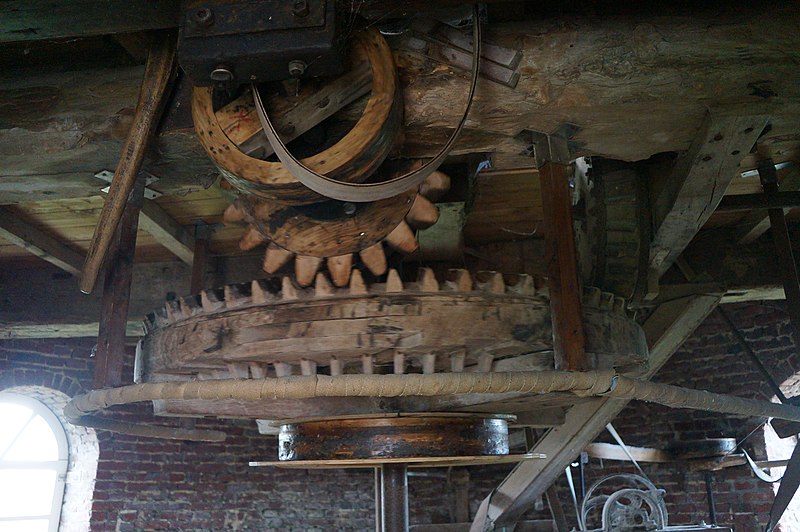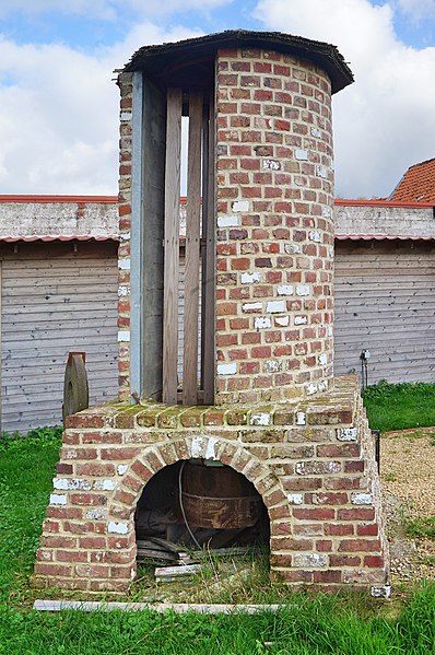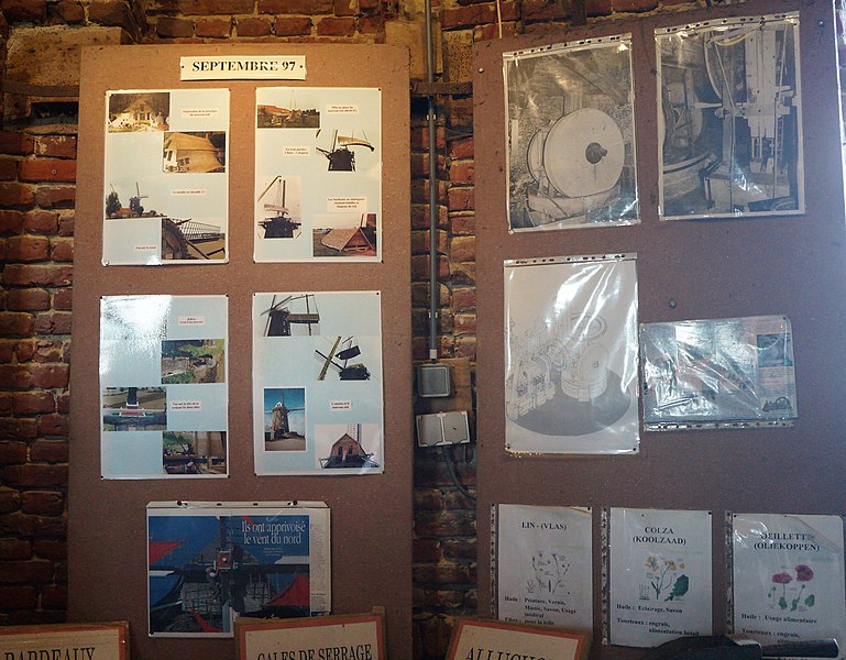Édifié en 1864, le moulin tour tronconique en brique traduit par sa forme et son matériau l'un des ultimes efforts de captation de l'énergie éolienne, au moment où l'énergie thermique et le charbon à bon marché s'imposaient aux activités autres que meunières. Juché sur une motte, il est équipé d'ailes à traverses d'une envergure de 24 mètres ; relativement archaïque, ses ailes sont soumises à l'entoilage. Son intérêt réside dans le procédé flamand de queue à double chevron : un des chevrons, plus large que le tronc du moulin, déborde celui-ci et, par une barre transversale, entraîne en deux points la calotte et les ailes. La lourdeur de manipulation du corps de la queue est résolue par un chariot d'entraînement à roue dentée circulant sur un monorail à crémaillère. Remplaçant un moulin pivot, il servit d'abord de tordoir à huile puis fut équipé de deux paires de meules entraînées par l'engrenage classique en bois, dont le grand rouet est pourvu d'un frein. Restauré et entretenu, ce moulin peut être mis en rotation pour des démonstrations.