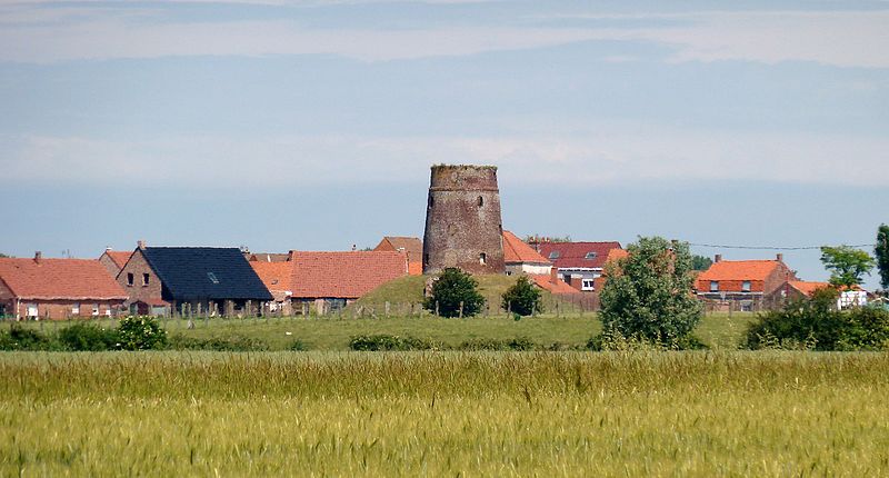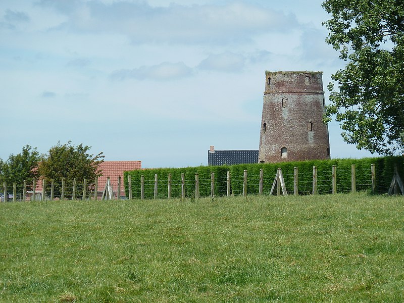 Le moulin à vent à farine, aujourd’hui hors d’usage, se situe à proximité du canal de la Haute-Colme. Datant du XIXe siècle, sa tour cylindrique en brique s’élève sur trois niveaux et est percée de fenêtres disposées en quinconce. Il repose sur un tertre dont l’intérieur a été creusé d’une galerie permettant d’atteindre le centre du moulin. Sa situation lui confère également la fonction de point géodésique.