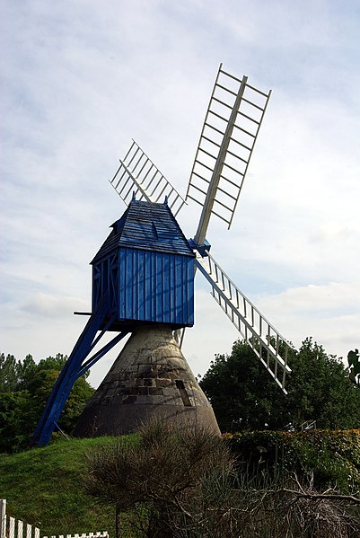 Les Bénédictins de l'abbaye de Bourgueil utilisèrent des moulins à vent dès le XIIe siècle; on suppose que ce principe leur fut rapporté par les Croisés. Le site se présente sous la forme d'une importante butte ronde de maçonnerie et de rocailles qui abrite une voûte en berceau et une coupole ouverte, surmontées d'un cône massif en maçonnerie dont l'extérieur est en pierre de taille. À l'intérieur, un bâti de charpente maintenait l'axe du mécanisme des meules. Toute la partie supérieure du mécanisme tournant et des ailes a été refaite en 1933. Les ailes dites Berton, brevetées en 1845, équipaient le moulin. Ce moulin cavier a servi jusqu'en 1873 pour moudre le blé, puis pour broyer l'écorce et préparer le tan destiné aux tanneries de Bourgueil; une batterie de huit pilons remplaça les meules. En 1875, une tornade arracha les ailes et la calotte. Lors de la dernière guerre mondiale, les Allemands utilisèrent la plateforme de la terrasse pour y installer une batterie de DCA et coulèrent, pour cela, une dalle en béton sur la voûte.