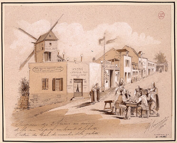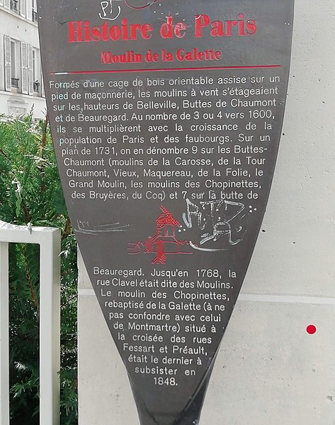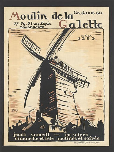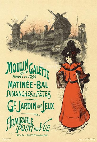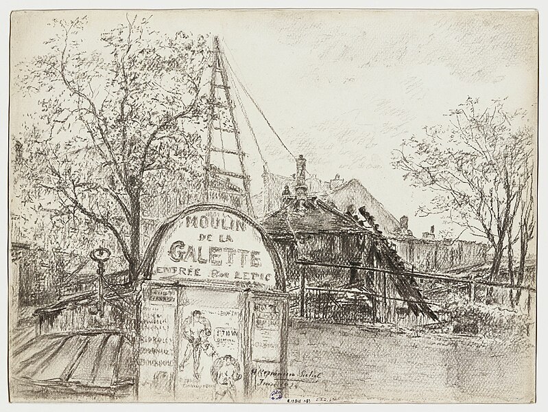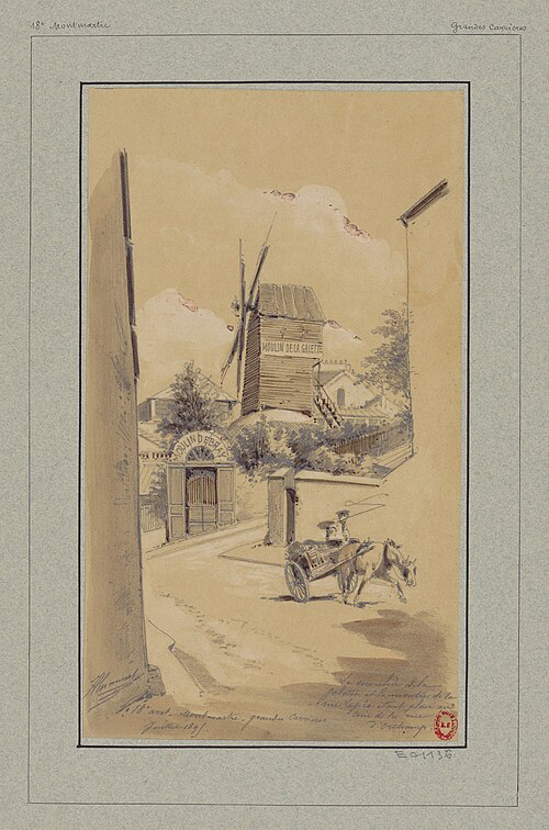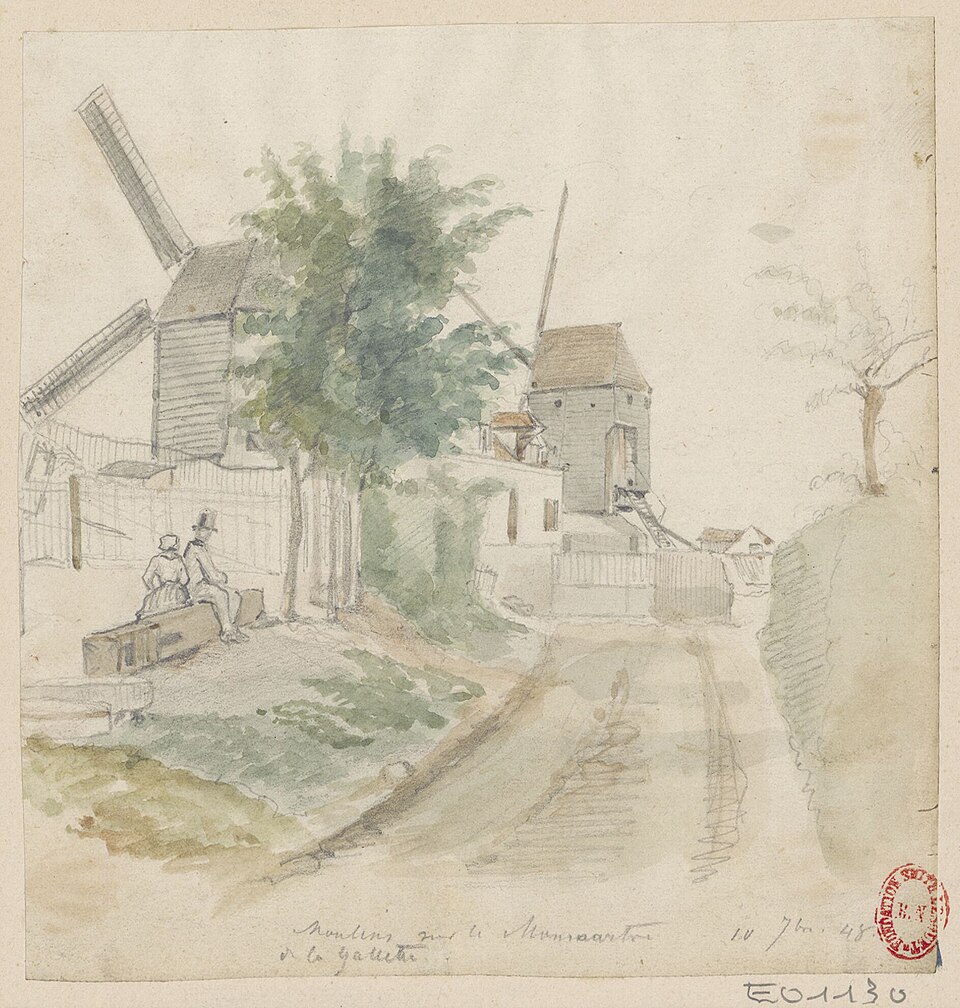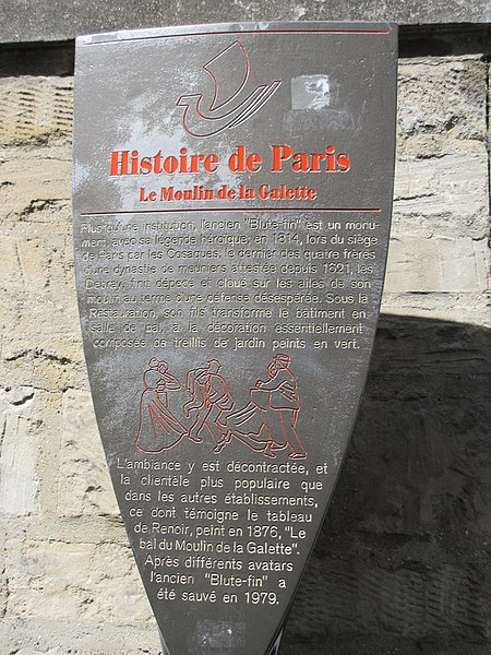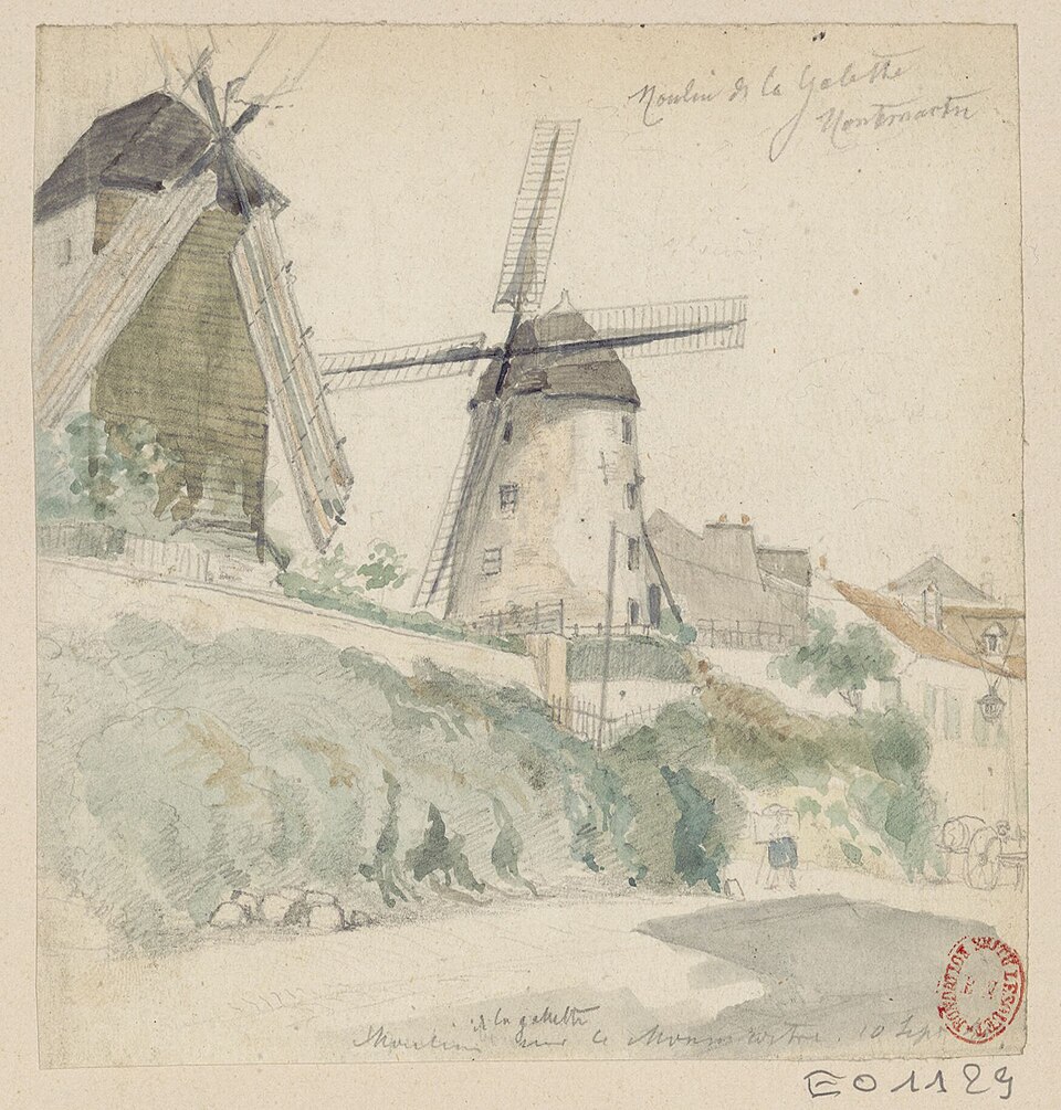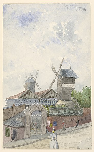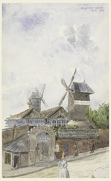 Le Moulin de la Galette désigne en réalité deux moulins de la butte Montmartre, le Blute-fin, situé rue Lepic, et le Radet, à l’angle de la rue Lepic et de la rue Girardon, qui ont servi de cadre à un célèbre bal ouvert par la famille de meuniers Debray depuis le XIXe siècle. Ces deux moulins, et parfois un troisième dit de la Poivrière, s’élèvent sur un petit tertre qui présente des vestiges d’occupations anciennes et qui a été associé aux appellations latines mons Martis ou mons Martyrum. L’édifice qui deviendra connu sous le nom de moulin de la Galette apparaît dans les sources en 1622 sous l’appellation « moulin du Palais ».