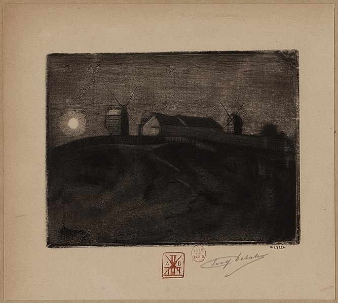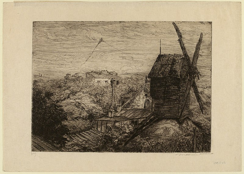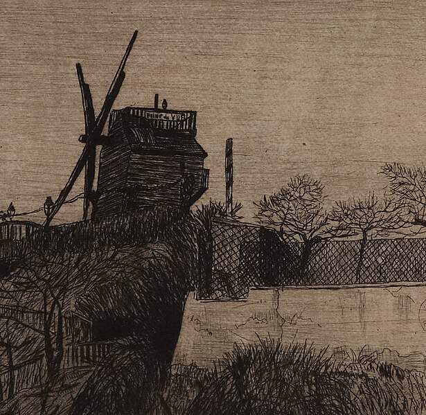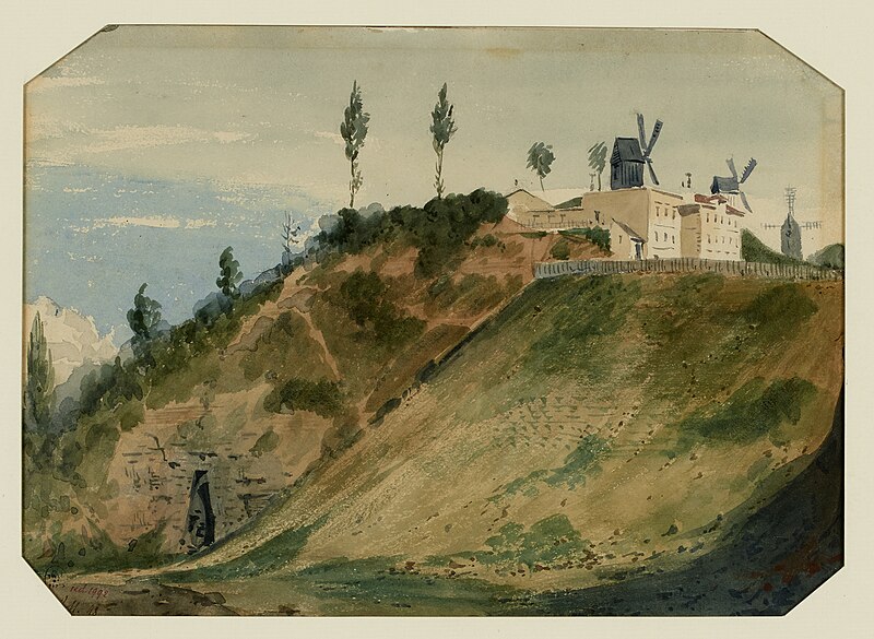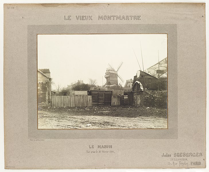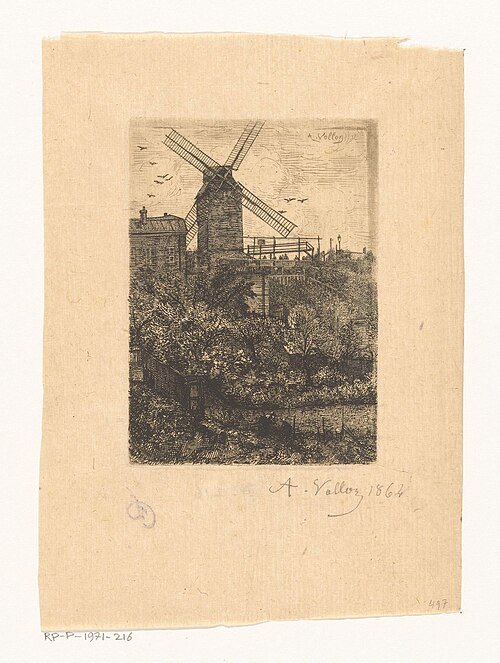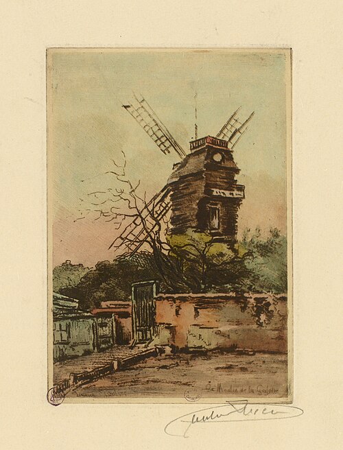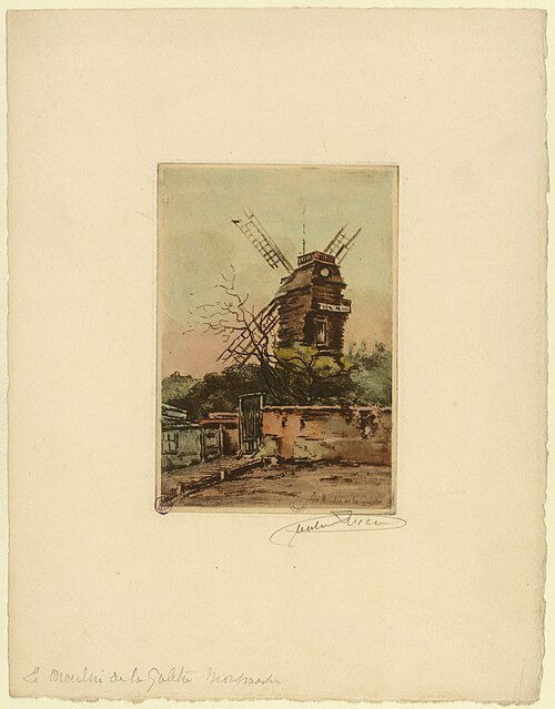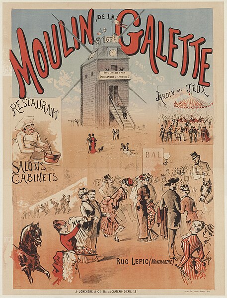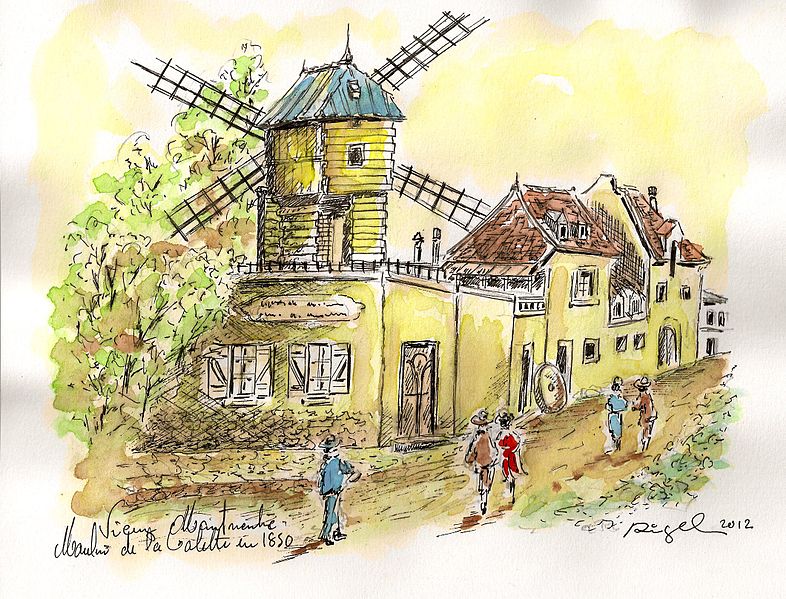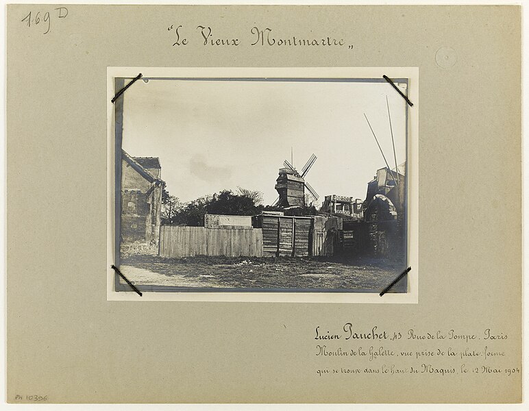 Le Moulin de la Galette désigne en réalité deux moulins de la butte Montmartre, le Blute-fin, situé rue Lepic, et le Radet, à l’angle de la rue Lepic et de la rue Girardon, qui ont servi de cadre à un célèbre bal ouvert par la famille de meuniers Debray depuis le XIXe siècle. Ces deux moulins, et parfois un troisième dit de la Poivrière, s’élèvent sur un petit tertre qui présente des vestiges d’occupations anciennes et qui a été associé aux appellations latines mons Martis ou mons Martyrum. L’édifice qui deviendra connu sous le nom de moulin de la Galette apparaît dans les sources en 1622 sous l’appellation « moulin du Palais ».