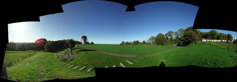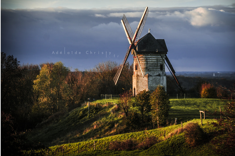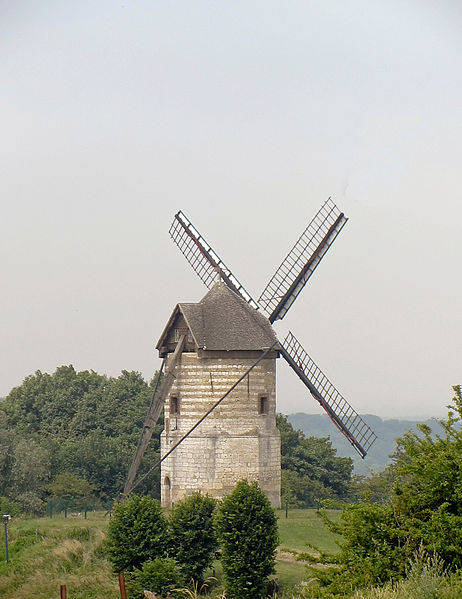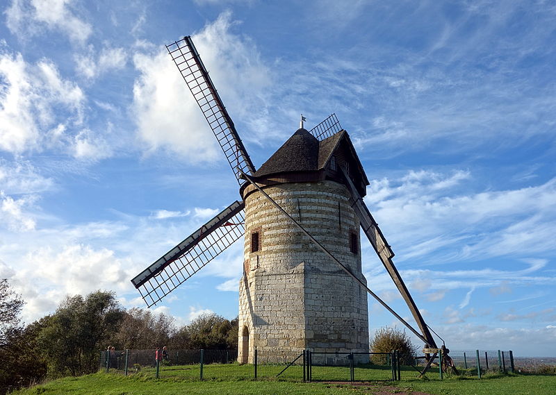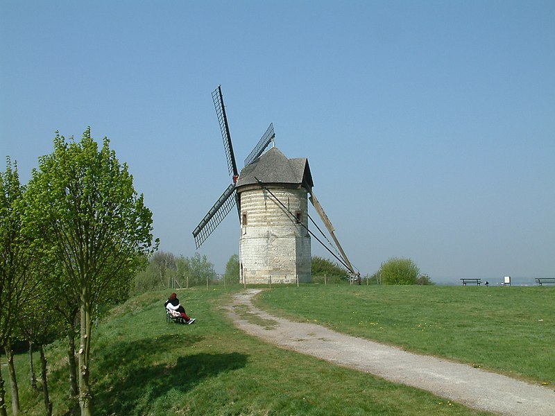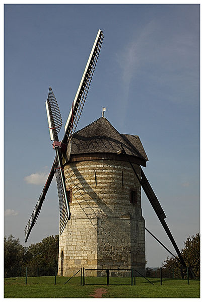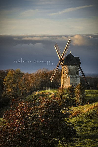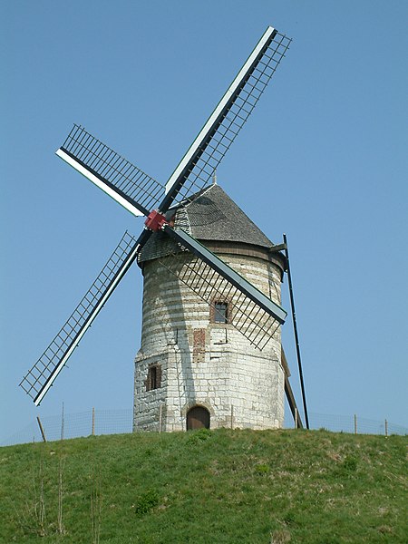 Édifié au XVIIIe siècle, ce moulin-tour repose sur une base octogonale en pierre de taille calcaire, surmontée d'un fût cylindrique alternant calcaire et brique, puis d'une partie conique. Après le rachat du moulin par la commune en 1985, l'ARAM du Nord Pas de Calais a restitué la toiture et les ailes.