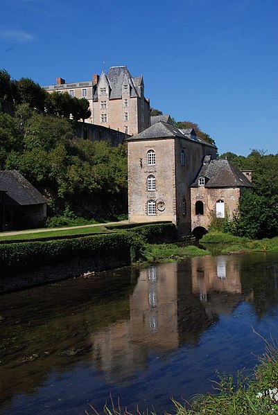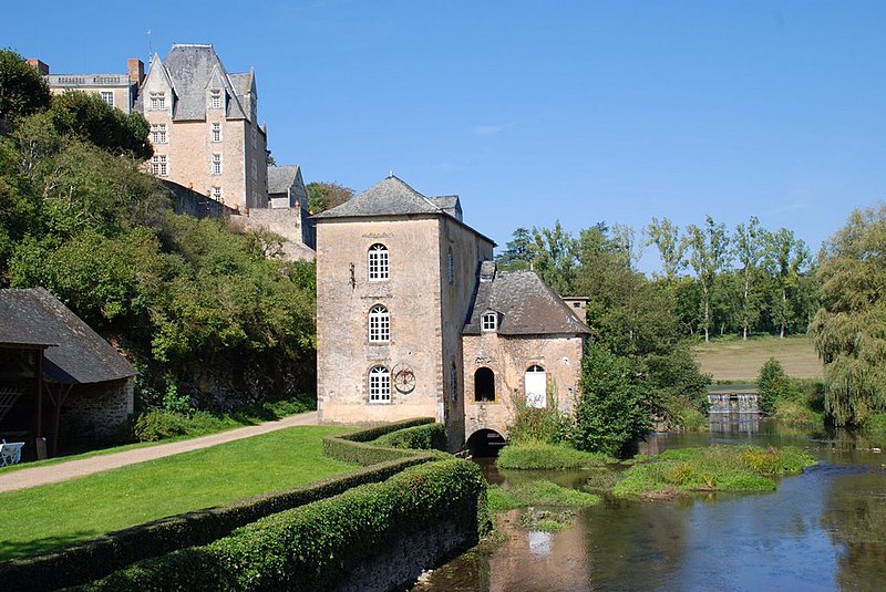 Reconstruit et modernisé en 1850 pour recevoir un mécanisme « à l'anglaise » pesant plus de trente tonnes, le moulin associe dents en bois et en fonte sur ses engrenages, caractéristique unique dans l'ouest de la France. La force motrice provient d'une roue hydraulique de 5,60 m de diamètre et de 2 m de large qui entraîne, via engrenages et courroies, un arbre de 12 m ; le fonctionnement des éléments mécaniques est observable à chaque niveau. Un système de poulies élève les sacs de grain et de farine, et une poulie extérieure permet de transmettre l'énergie du moulin à des machines installées à l'extérieur. Le rez-de-chaussée abrite le grand mécanisme d'entraînement, le premier étage les meules, le deuxième les blutoirs et les chambres à grain, et le dernier étage le monte-sacs. Le moulin a également assuré le pompage de la réserve d'eau du château et produit de l'électricité grâce à une dynamo.