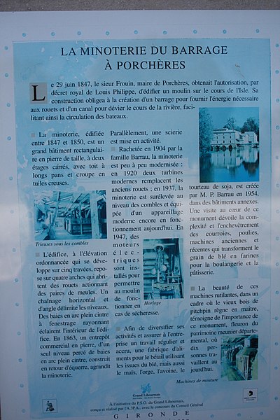 Le moulin du Barrage a été construit en 1850. Il se présente comme un long bâtiment rectangulaire divisé en cinq travées et comprend trois niveaux, auxquels s’ajoute un comble construit en 1937. L’édifice a conservé l’ensemble de sa machinerie, dont les éléments les plus anciens datent de 1903.