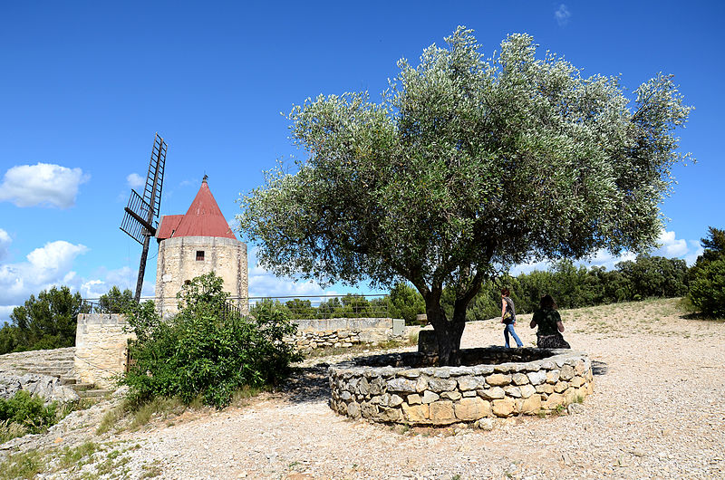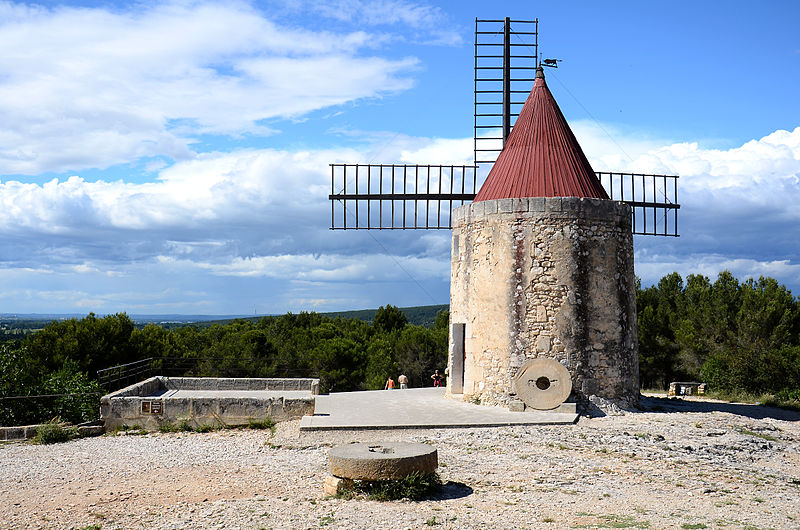 Le moulin Saint-Pierre, dit moulin Ribet et souvent appelé moulin d'Alphonse Daudet, est un moulin à vent situé à Fontvieille, dans les Bouches‑du‑Rhône. Il faisait partie d'un petit groupe de moulins à vent comprenant aussi les moulins Ramet et Tissot. Acquis en 1923 par Hyacinthe Bellon, il fut transformé en musée consacré à Alphonse Daudet afin d'honorer l'écrivain auquel on attribue traditionnellement ce moulin, bien qu'il n'en ait ni été propriétaire ni résident. Classé au titre des monuments historiques le 6 mars 1931, le bâtiment date de 1814 et a exercé une activité de minoterie pendant plus d'un siècle, y compris au service des armées pendant la Première Guerre mondiale. En 1935, l'association Les Amis d'Alphonse Daudet a entrepris sa restauration pour en faire un musée. Propriété privée, il avait été loué par la mairie pour 400 € par mois et a longtemps été laissé à l'abandon ; après expiration du bail, le propriétaire a fermé le moulin pour le remettre en état et l'a rouvert au public en 2016. Le moulin est une tour à toit conique rotatif dont les ailes à traverses ont été restaurées en 1931 puis en 1988 ; son gros fer, réemploi, porte la date 1777. La base cylindrique mesure 5,40 mètres de diamètre sur 5,78 mètres de hauteur, avec un mur épais de 1,20 mètre ; un étage, accessible par un escalier intérieur en colimaçon longeant le mur, surplombe un sous‑sol rendu possible par la pente naturelle du terrain. Le toit conique, haut de 4 mètres, et sa charpente entièrement en bois abritent le mécanisme ; l'ensemble de la toiture, supportant les quatre ailes d'une envergure de six mètres, est orientable grâce au « tourne‑au‑vent » situé au premier étage. Chaque aile, constituée d'une armature bois, peut recevoir une toile de lin d'origine d'Arles. La salle du rez‑de‑chaussée accueille une exposition permanente consacrée à Alphonse Daudet. Le mécanisme fonctionne ainsi : les ailes entraînent un arbre traversant la toiture et fixée à un rouet en bois garni de taquets, lequel entraîne une lanterne cylindrique qui transmet le mouvement à un axe vertical descendant jusqu'au système de meules. Le moulin comporte deux meules en pierre, une gisante fixe posée sur le sol et une courante solidaire de l'axe vertical, toutes deux striées pour faciliter l'évacuation de la farine ; le meunier devait éviter que les meules tournent « à vide », car le frottement risquait de provoquer un échauffement et un incendie. Dans Lettres de mon moulin, un hibou, qualifié de « locataire de plus de vingt ans », est décrit comme logeant près de ce mécanisme, sur la charpente à côté de la lanterne. Le moulin a également servi de décor de tournage pour la série Draculi & Gandolfi de Guillaume Sanjorge et a inspiré une toile d'Henri Louis Foreau intitulée « Le moulin d'Alphonse Daudet » (collection privée). Les moulins voisins, aux mêmes proportions provençales en pierre enduite, existent sans leurs ailes.