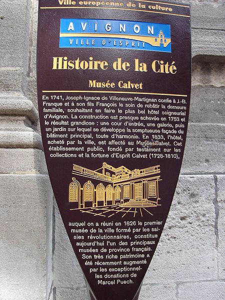 Esprit Calvet, grand collectionneur, légua en 1810 à sa ville natale un ensemble comprenant une bibliothèque, une collection d'histoire naturelle et un cabinet d'antiquités, à charge de créer une institution autonome et d'assurer les fonds nécessaires à leur entretien ; un décret impérial du 9 avril 1811 permit au maire d'Avignon d'accepter ce legs en faveur de la commune. Le musée Calvet, ainsi nommé en son honneur, conserve de nombreux objets issus de ce legs. Depuis les années 1980 le musée est scindé en deux sites : le musée des beaux-arts est resté dans l'hôtel de Villeneuve-Martignan, tandis que le musée lapidaire a été réimplanté dans l'ancienne chapelle du collège des Jésuites, rue de la République.