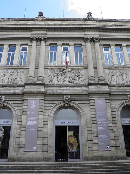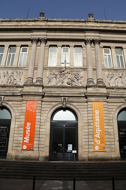 Le Musée d'Aquitaine est issu du rassemblement de nombreuses collections constituées à Bordeaux depuis le XVIIIe siècle. Il regroupe notamment le dépôt d'Antiques de l'Académie nationale des Sciences, Belles-Lettres et Arts de Bordeaux (1781), le musée Lapidaire (1867) et le musée Archéologique (1893), ce dernier ayant associé le musée d'armes et d'objets anciens ainsi que le musée préhistorique et d'ethnographie. De nombreux dons de voyageurs bordelais ont enrichi ces fonds. Par la suite, les collections se sont encore accrues avec les apports du musée de la marine (1964), le dépôt d'une partie des pièces du musée du Vieux Bordeaux (Société Archéologique de Bordeaux, 1980) et l'intégration du musée Bonie en 1983. Le musée couvre des domaines variés : archéologie, arts décoratifs, beaux-arts, arts de l'Islam, ethnologie, photographie, histoire locale et mémoire de l'esclavage, ainsi que des collections extra-européennes d'Afrique, d'Amérique, d'Asie et d'Océanie. Ses thèmes incluent antiquités étrangères (grecques, romaines, égyptiennes, orientales), archéologie nationale (préhistoire, protohistoire, gallo-romain, paléo-chrétien, médiéval, moderne), architecture et urbanisme, art religieux, arts décoratifs (céramique, mobilier, orfèvrerie, textiles, verrerie), beaux-arts (dessin, estampe, affiche, peinture, sculpture), collections militaires, archives sonores, instruments de musique et objets liés aux sciences et techniques comme l'agroalimentaire, la navigation et les transports.