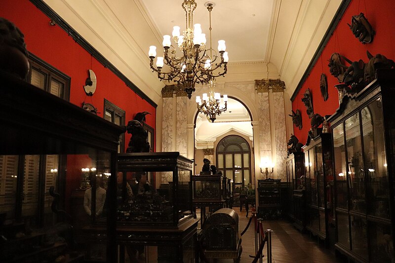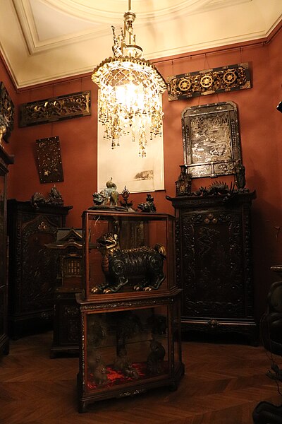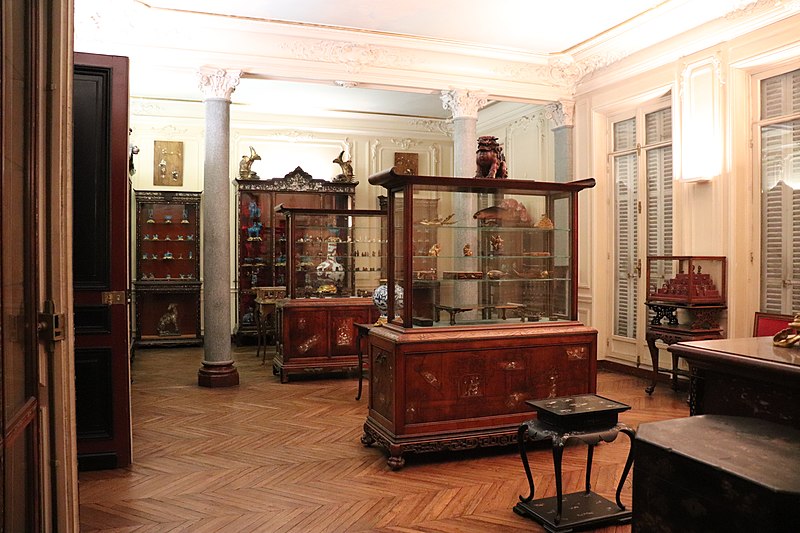 Les collections, majoritairement d'origine chinoise et japonaise, comprennent un rare ensemble de coffres et cabinets laqués de style Namban datés des années 1580‑1590, des porcelaines émaillées de style Kakiemon dont des poupées, environ 1 500 figurines de pierre dure (netsuke), des céramiques de Kyoto du XVIIIe siècle, ainsi que des masques d'animaux et de chimères. Les bronzes et les estampes sont peu nombreux, la fondatrice privilégiant la sculpture, l'iconographie fantastique et la couleur. Certains panneaux décoratifs semblent provenir d'expositions universelles, et des éléments importés du Vietnam furent intégrés à un bâti réalisé par Gabriel Viardot. Présentées dans les vitrines d'origine aux parois incrustées de nacre, les œuvres témoignent de la passion pour l'Orient née sous le Second Empire et de son influence sur l'art et le goût occidental.